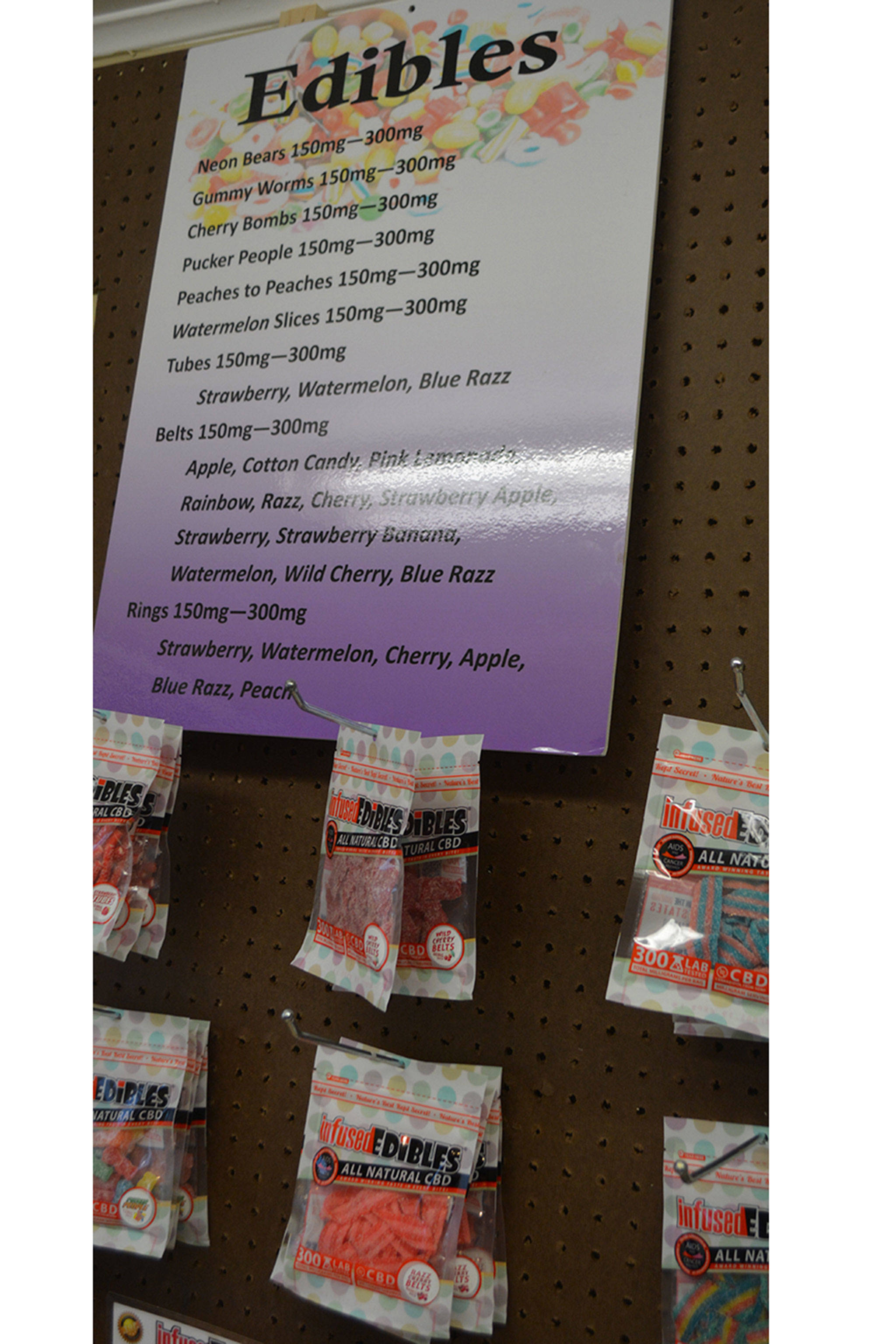 The Days sell many products and are looking for more. Some items they have on hand include: oils, creams, lotions, balms, cleansers, shampoos, conditioners, coffee, tea and even dog treats and honey. Their No. 1 seller is a hemp intensive pain-relief rub with emu oil. Their edible candies are an inexpensive way to give CBD a try at $5 a bag. There are gummy worms, cherry bombs, watermelon slices, along with belts and rings that come in a variety of flavors.