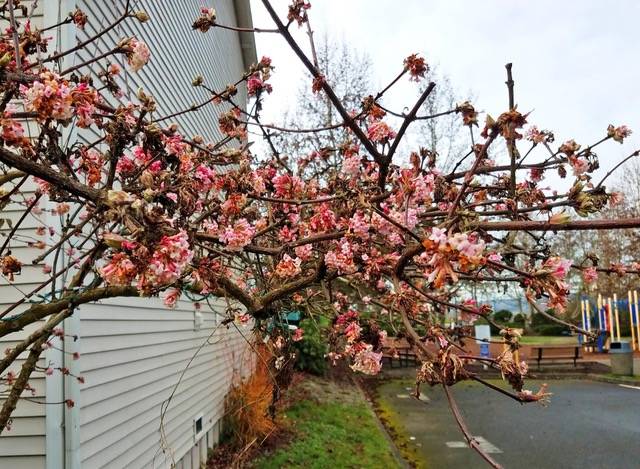 •Viburnum ‘Dawn’ is in full bloom. This shrub is wide awake and blooming its little head, off as we speak. Actually, ‘Dawn’ starts blooming in November and continues well into February with its fragrant clusters of pink flowers. Every gardener should have one of these tucked somewhere into their garden where it can be enjoyed all winter long.