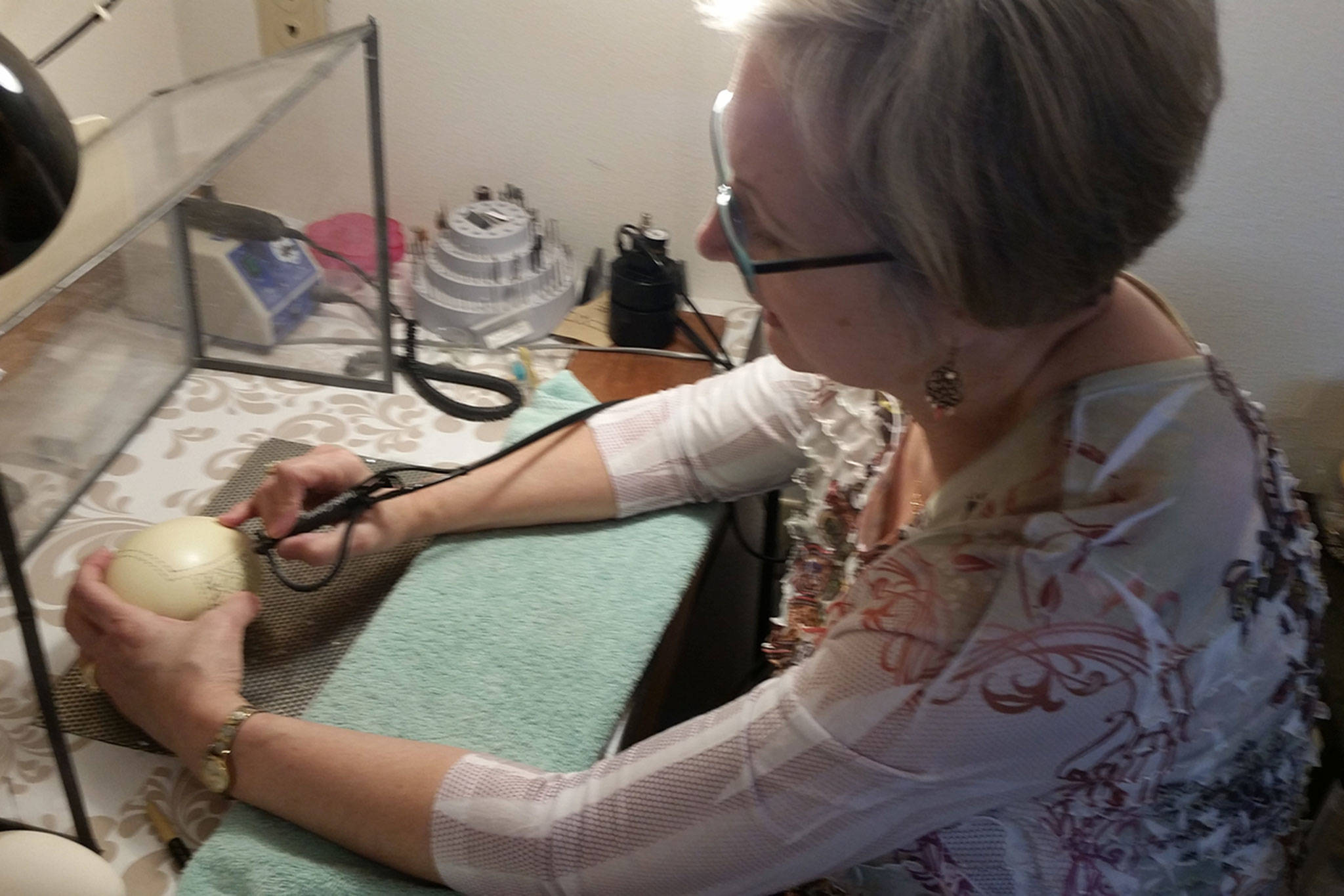 4. You don’t have to be an artist to do it. “If you’ve never done anything before, we are more than willing to help. We want to keep the art going,” Matson said. The kits provide everything that is needed. For example, for a class Matson is teaching, she spends 2 1/2 hours on each ostrich egg, carving out a portion of it. “I cut the eggs for them” in her home shop with a high-speed drill.