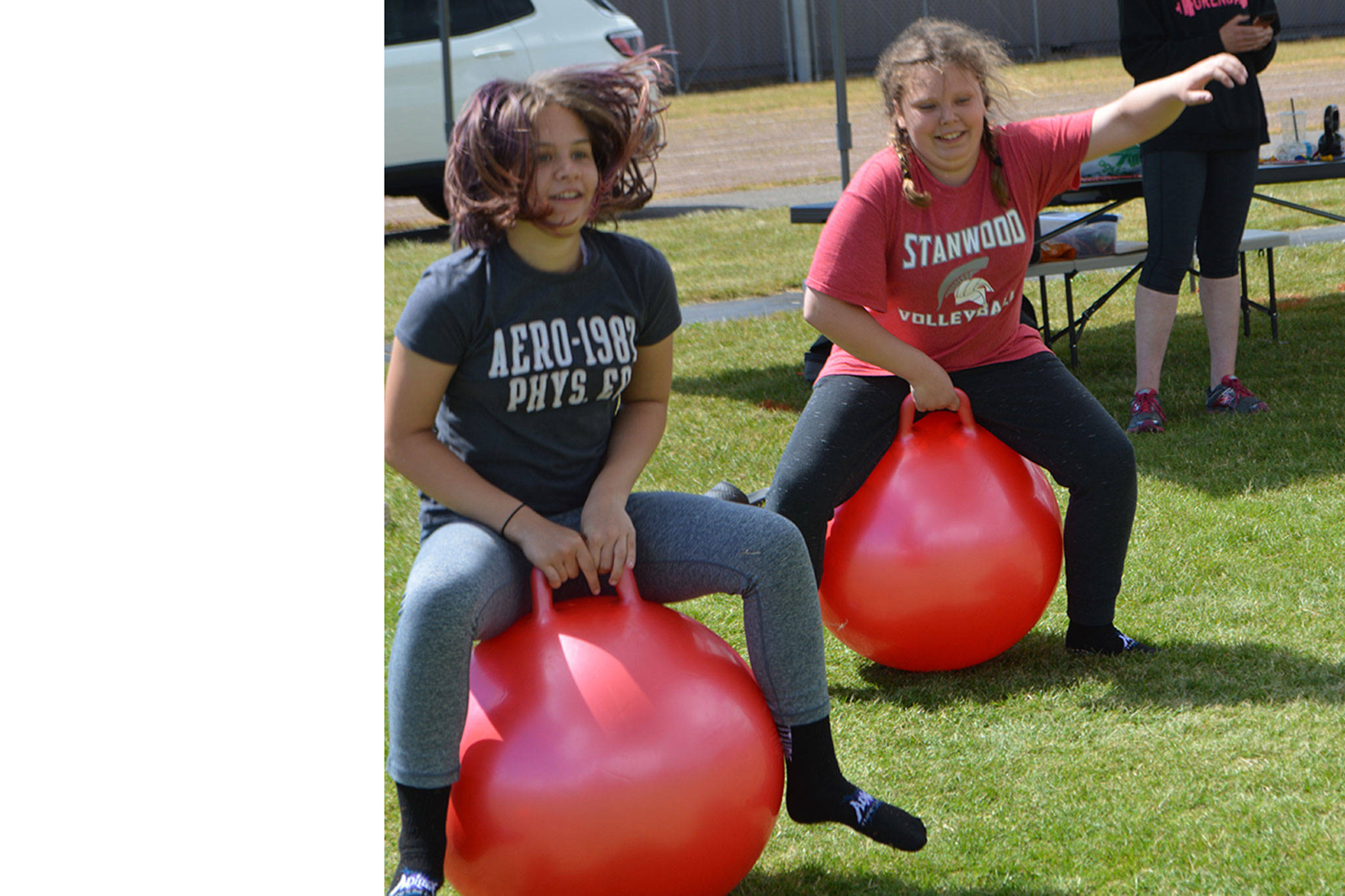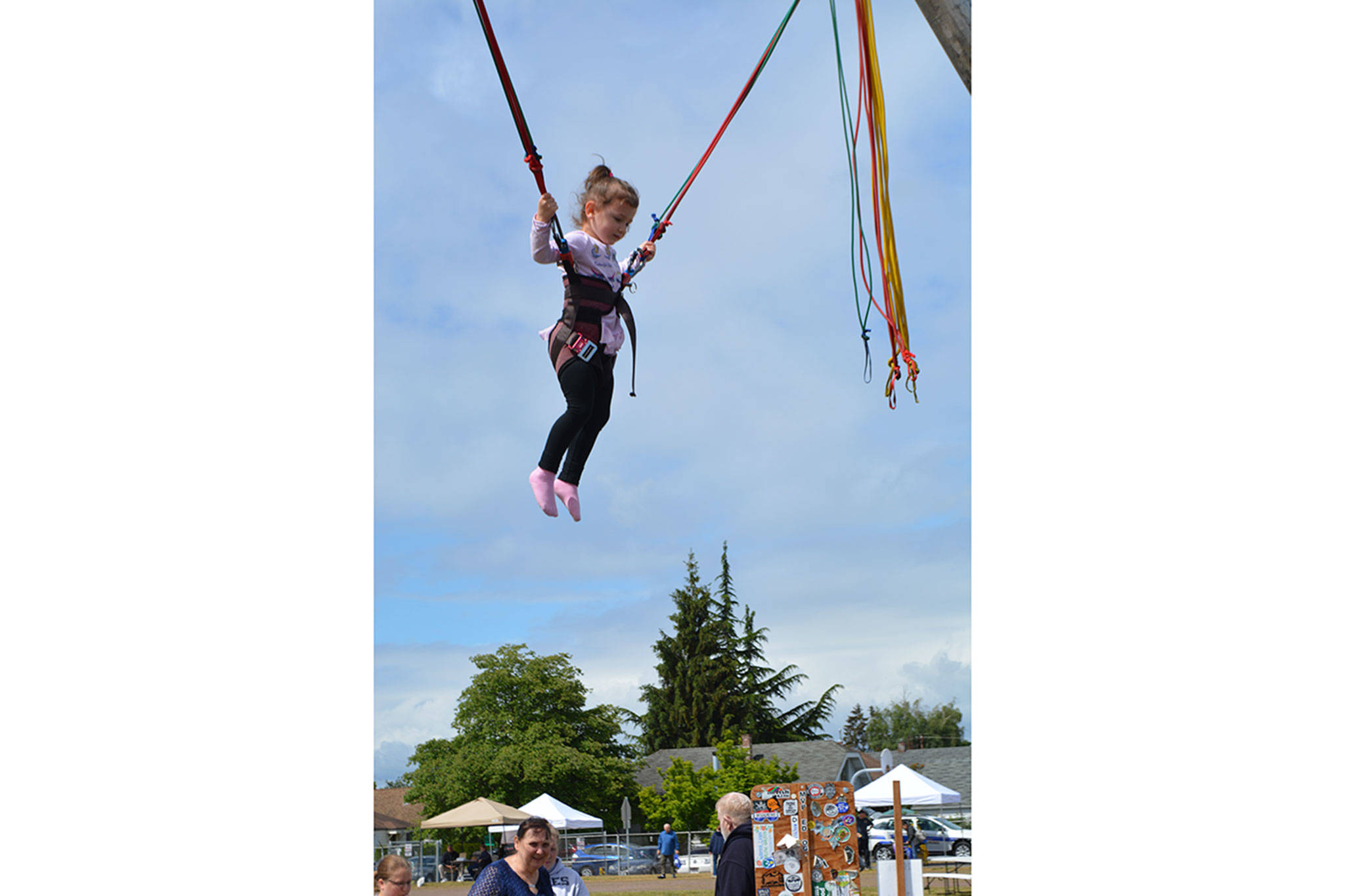 Caydence Shapiro of Marysville is only 3, but she was able to do backward somersaults for the first time on the guided trampoline. Young teenagers Molly Schakle and Caden Simpson of Stanwood enjoyed bouncing on balls and dancing with the Apple-Bee.