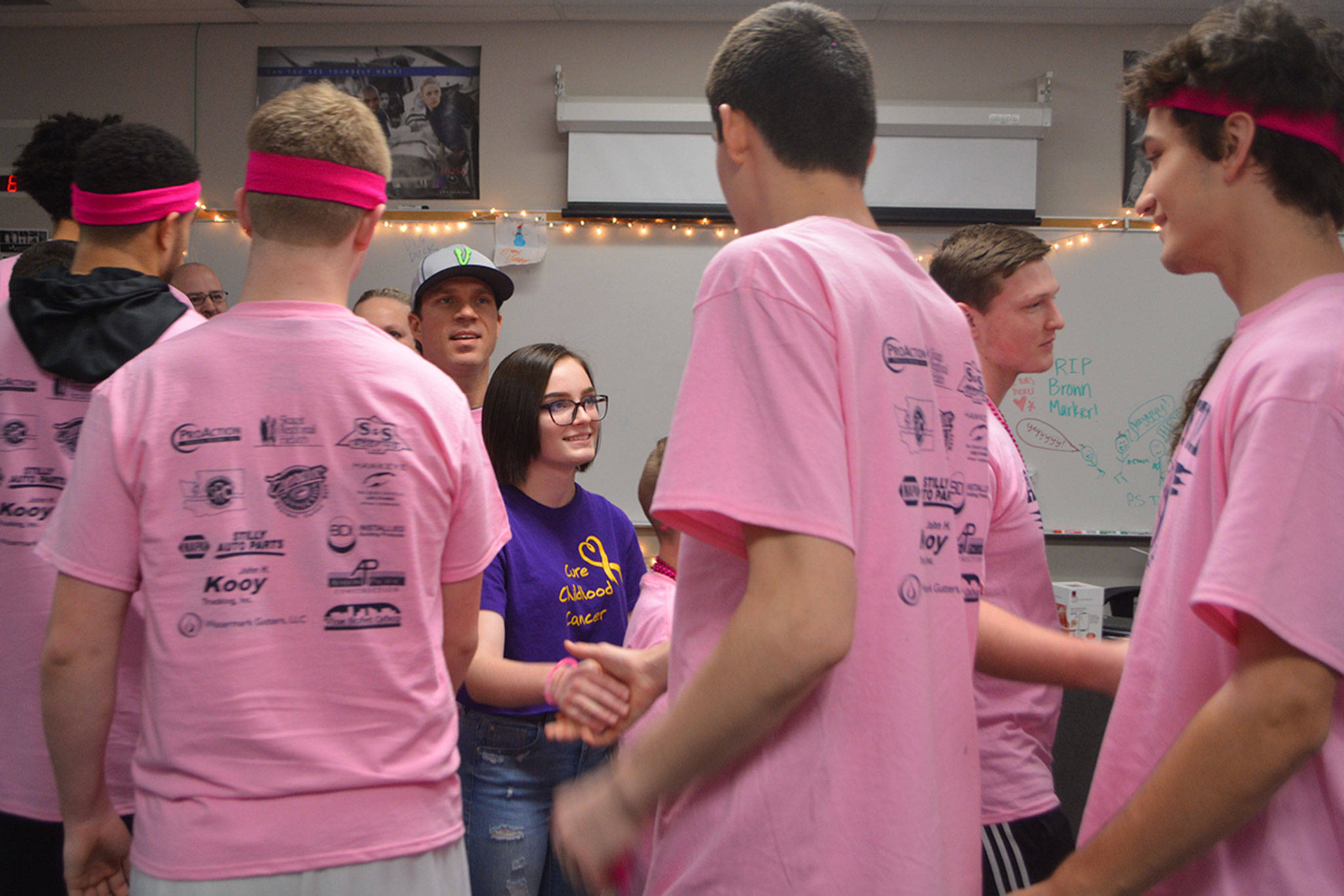 The Browns and the community honor the coaches, trying to put smiles on their faces, even if just for a short time. This year, the coaches rode in an 18-passenger stretch limousine, bracketed by two fire engines with sirens blaring. They were greeted by a drumline and cheerleaders. Inside, the gym was packed with supporters wearing pink t-shirts.