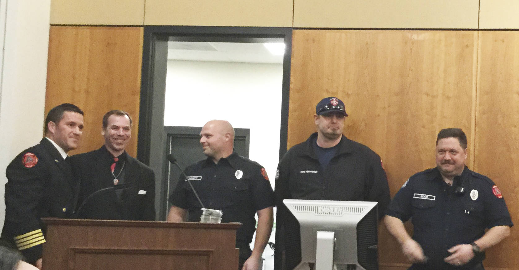 Kraski honored Dungeness co-workers Larry Kappenman and Bob Fairbanks, along with firefighter/paramedics Jason Abrahamson, Bob Beam and Daggett. Also, Arlington Fire Capt. Jason Brisson was sworn in. Brisson was promoted after ranking first on the department’s promotional test. He fills the vacancy of Brandon Asher, who went to Chelan County.