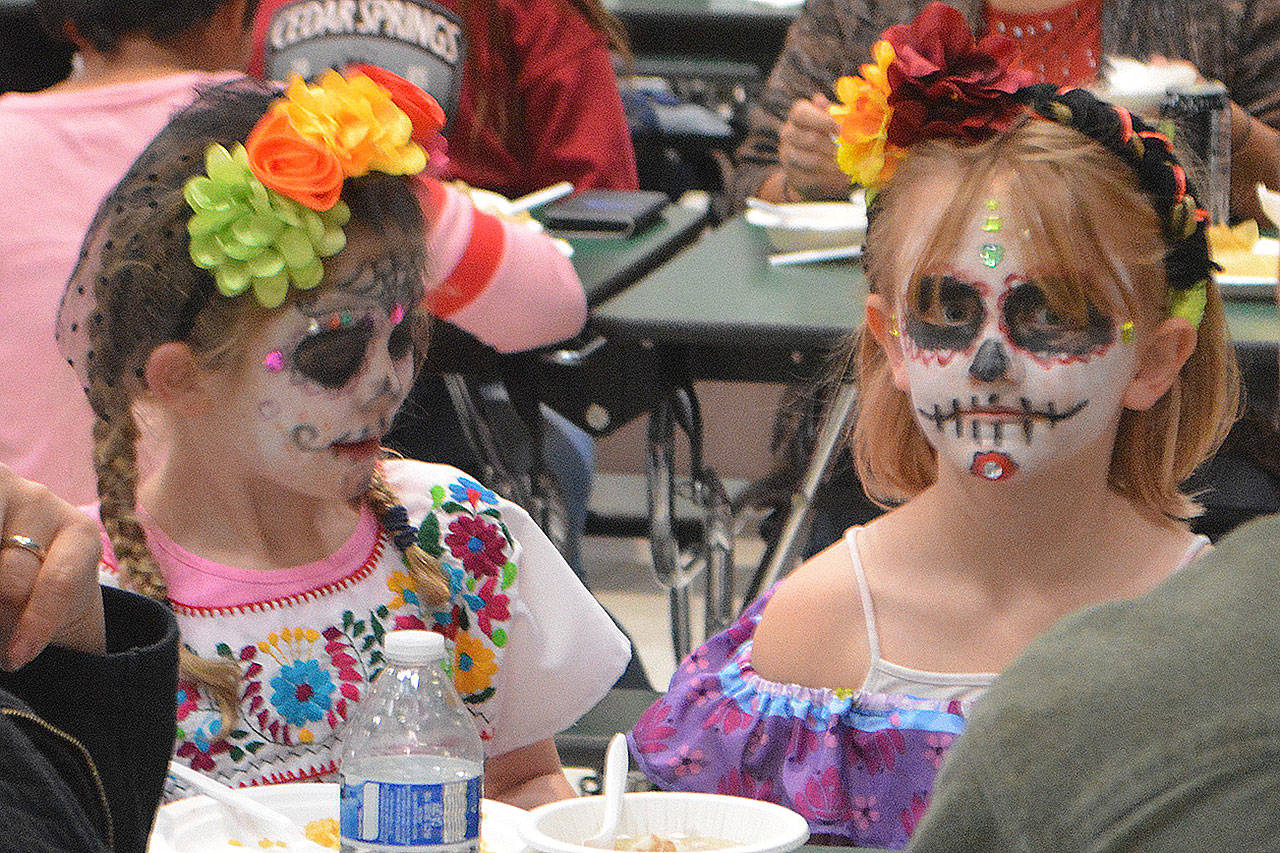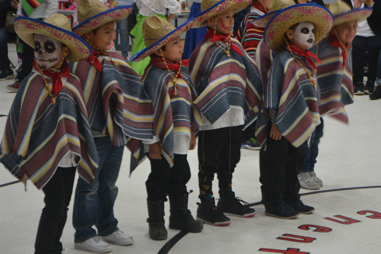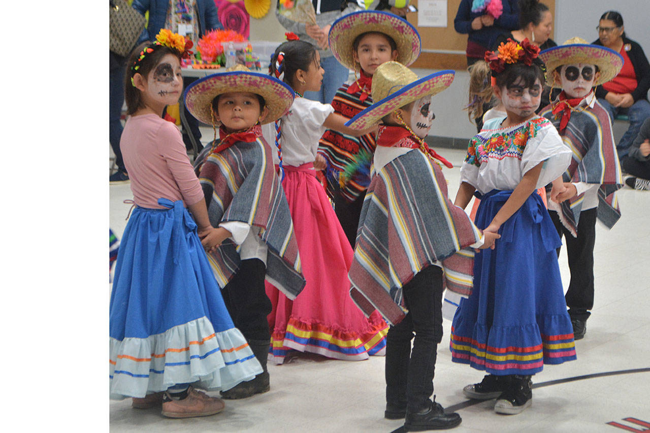 First-grade teacher Xochitl Palacios again organized the event, along with Pricilla Smith and others with the PTA. Student Adrian Rodriguez looked like he had two black eyes, but so did many of the other boys and girls, 14 of whom performed the Mexican Hat Dance and a song from the animated movie “Coco.” They painted their faces to look like skeletons with the belief that the living and the dead intermingle. The boys wore serapes and cowboy hats, while the girls wore colorful dresses.