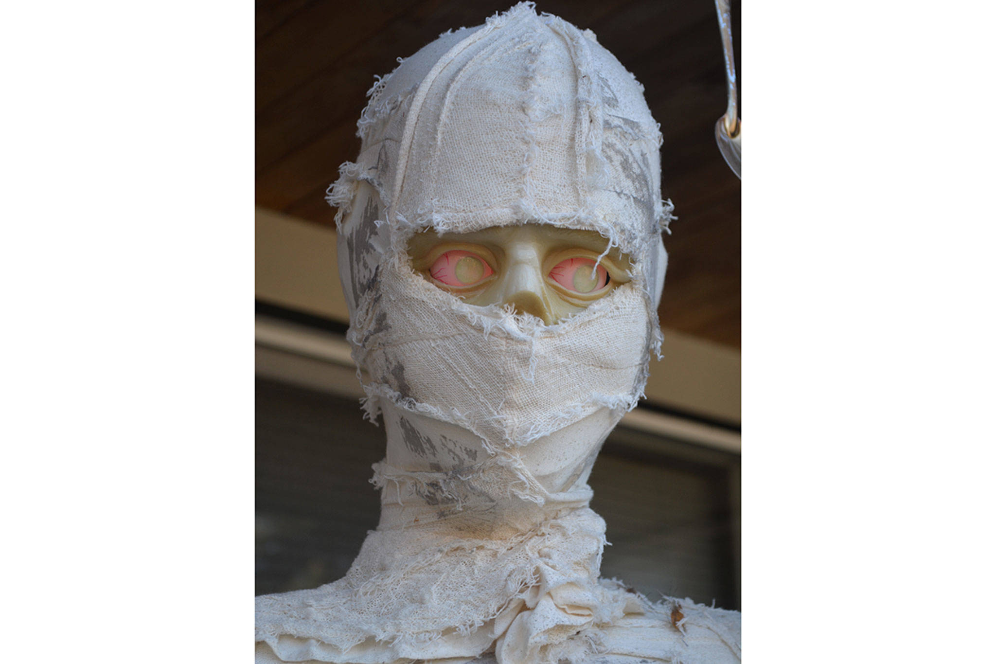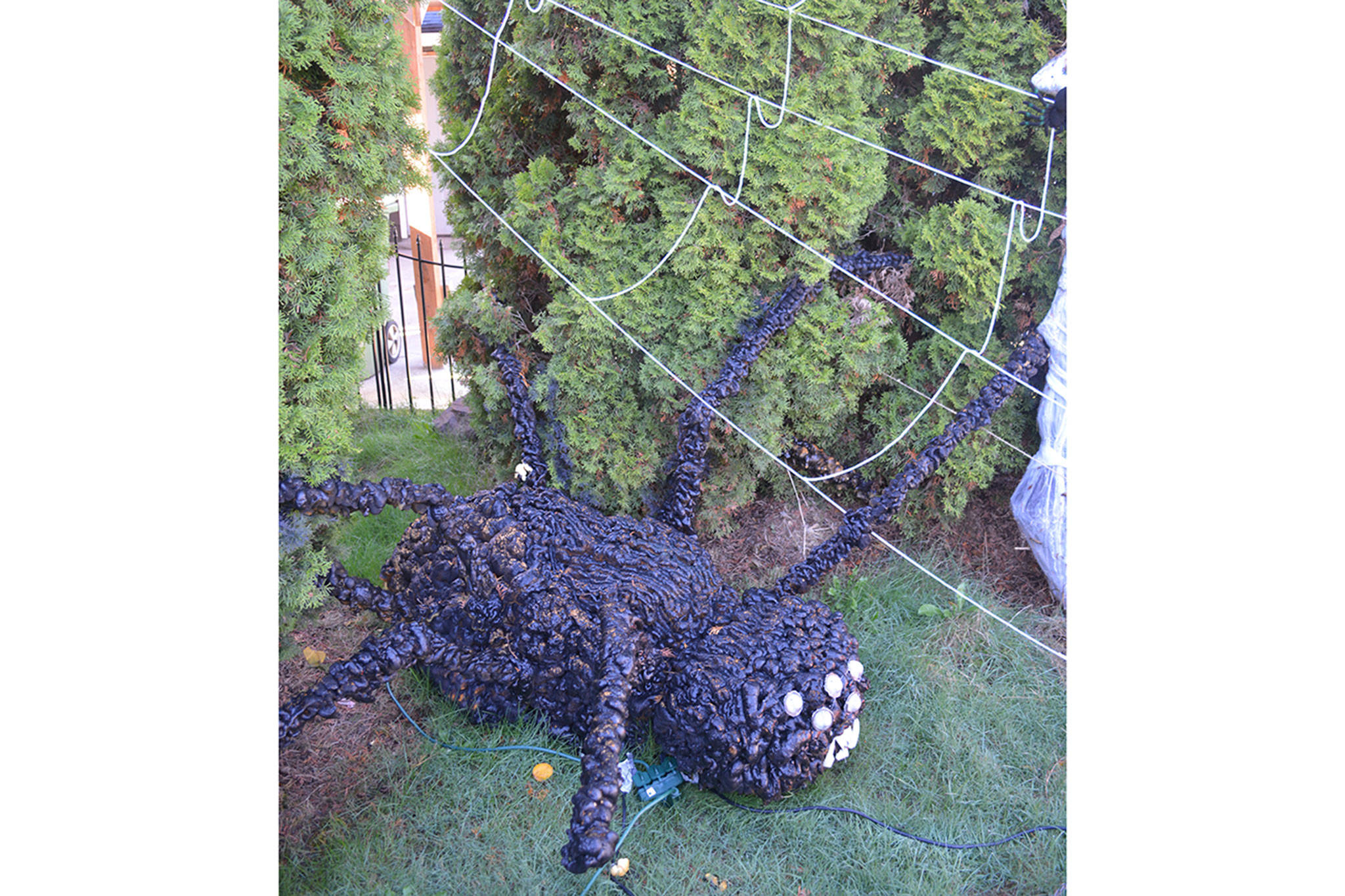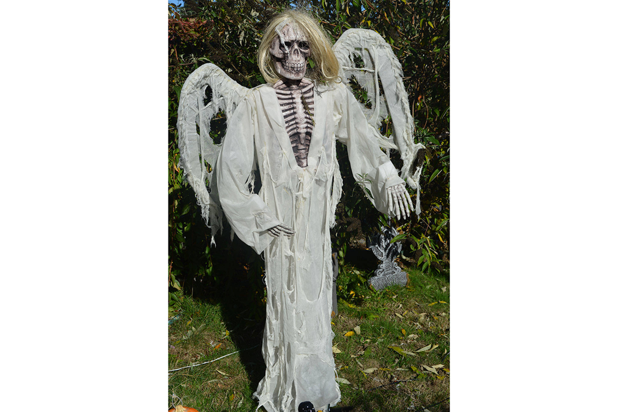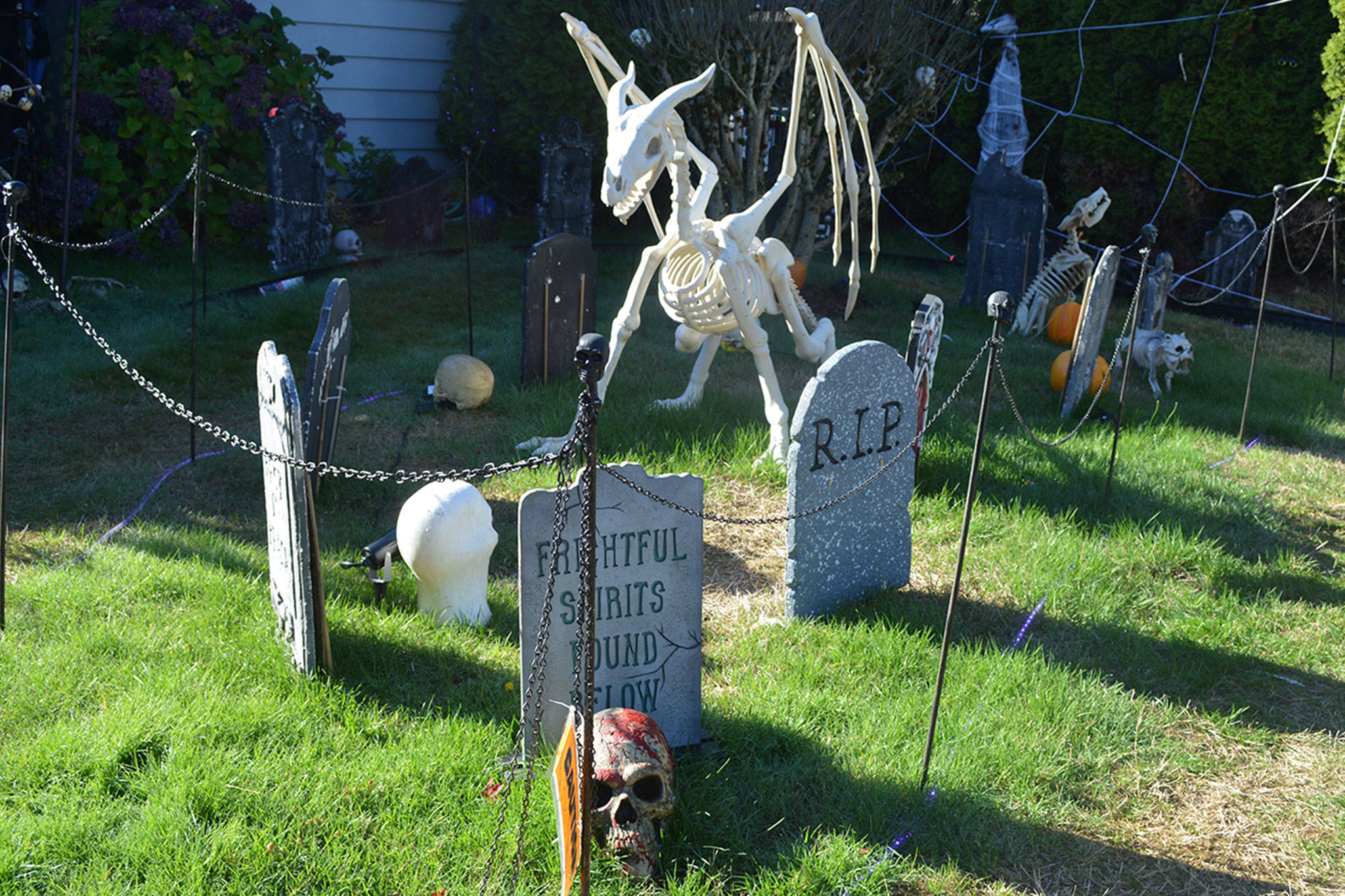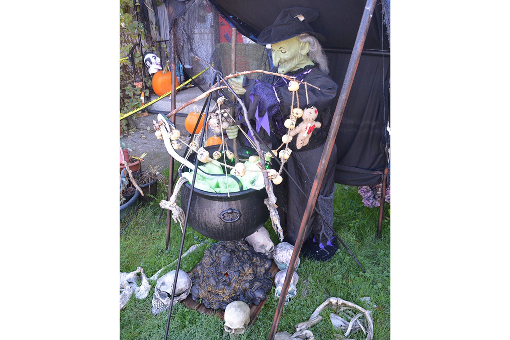 “That started it,” she said. Now the front yard on 75th Street is decorated with everything you can imagine: Skulls, a zombie house, a mummy, ravens, human skeletons, a horse skeleton, a dragon skeleton, a witch brewing skulls, gravestones, a huge spider and a web.
