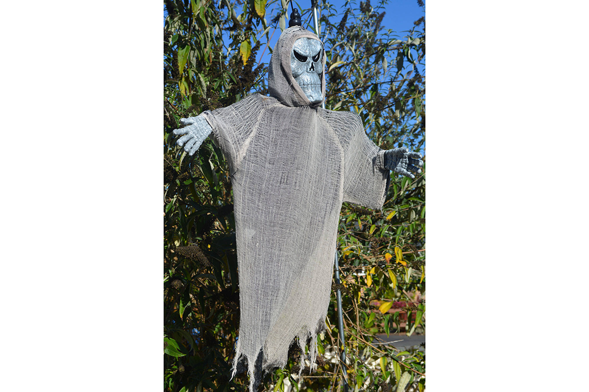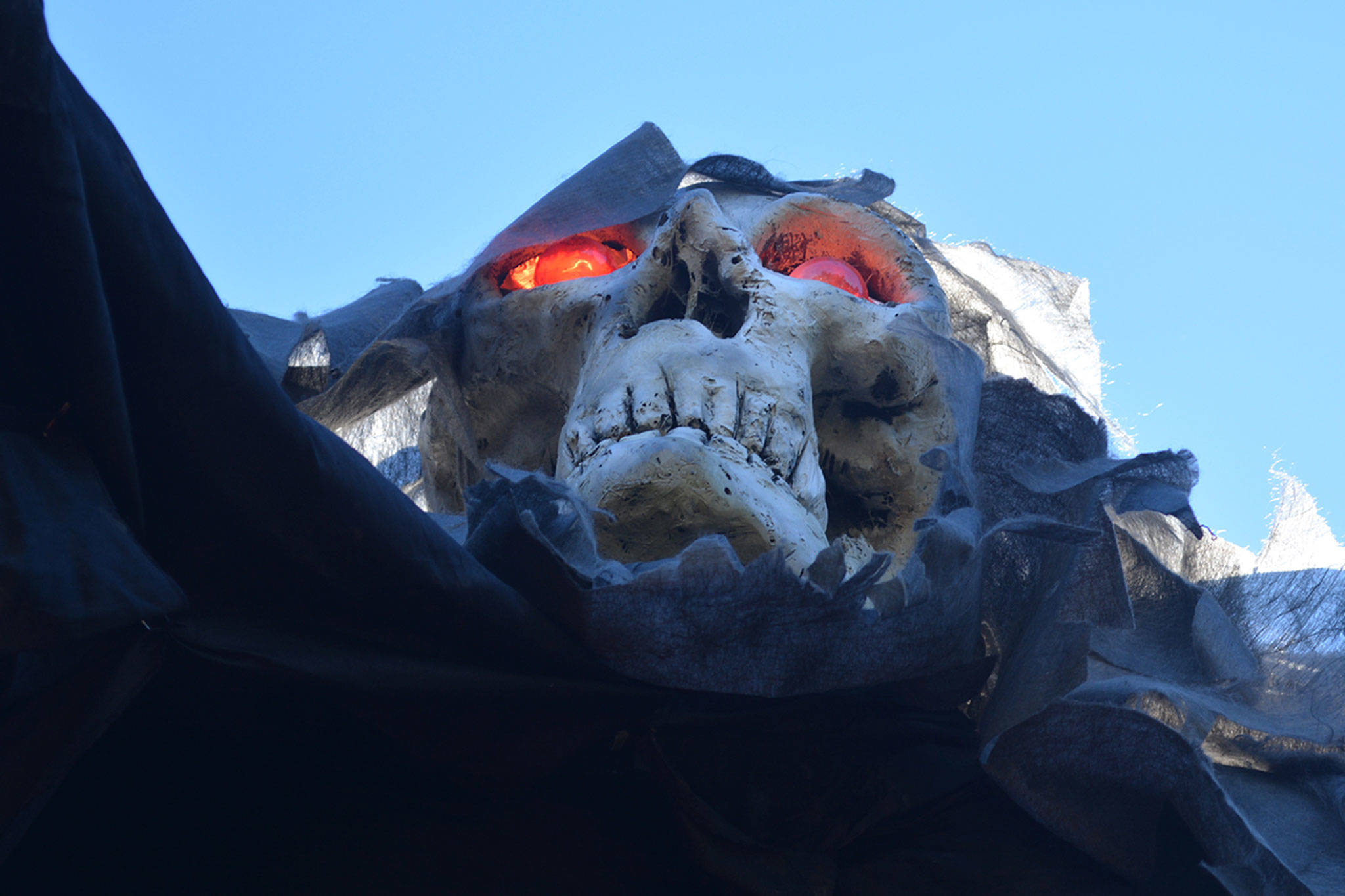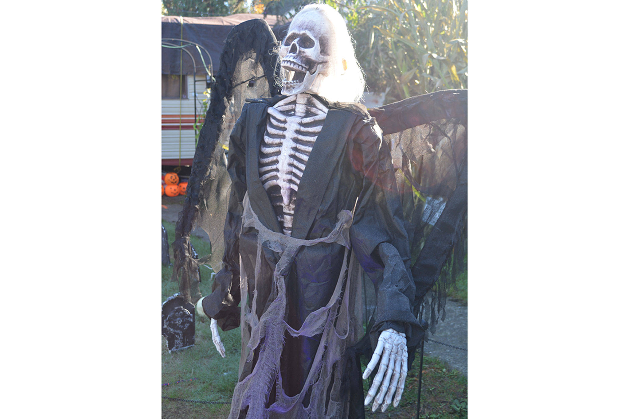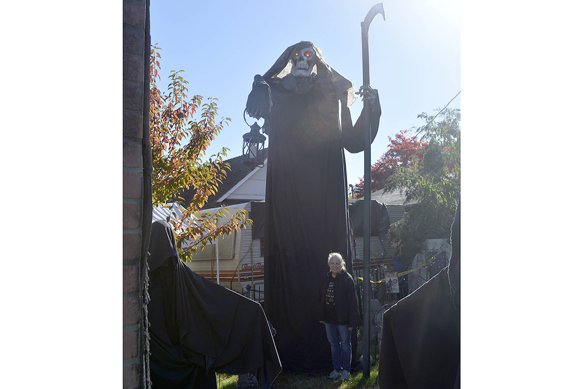 That’s what it’s all about for Theresa Ramey, whose 18-foot-tall Grim Reaper lurks over her front yard with his long-bladed scythe in hand.