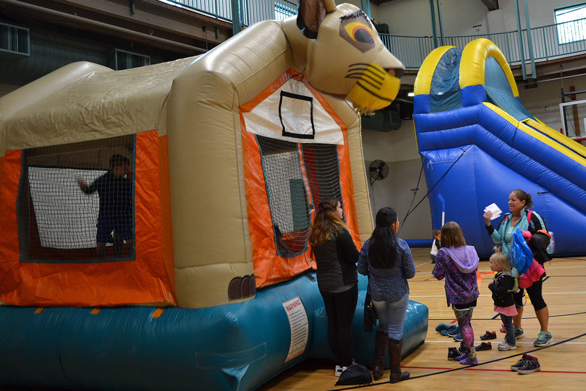 Olivia Bailey, 9, of Marysville jumps over colorful blow-up hurdles at Kids’ Day at the Marysville YMCA Saturday. Dozens of kids came and took their parents to try to get them to sign up for camps or other activities for the summer. The YMCA also will host a Career Day for Girls May 6 from 9 a.m. to 2 p.m. Soroptimist International of Marysville is putting it on to empower girls to make their dreams come true.