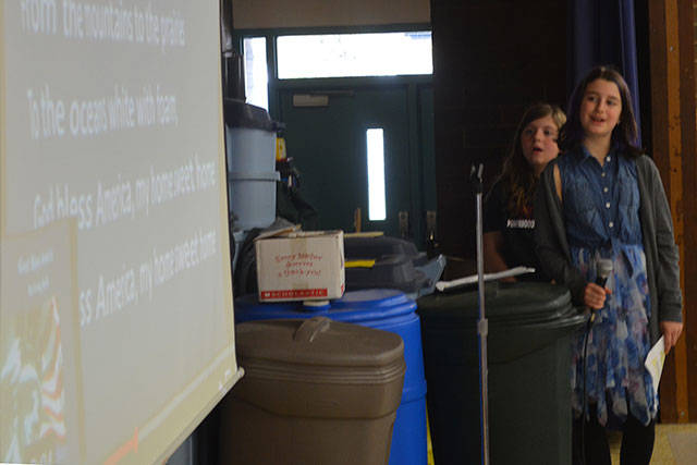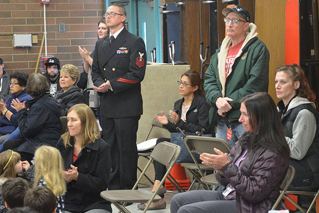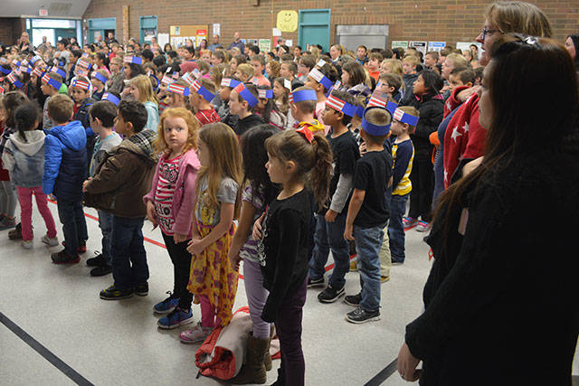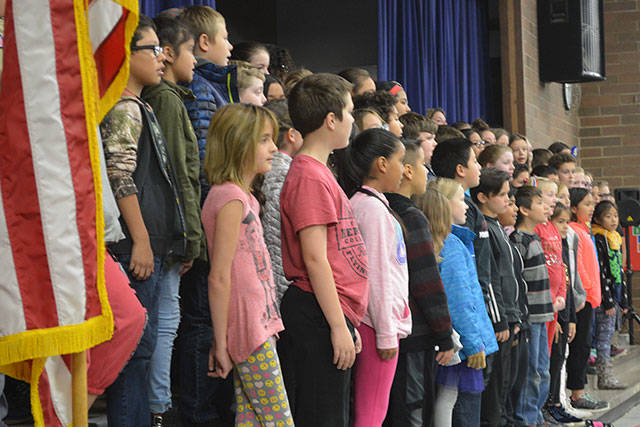 At the Veterans Day assembly at Pinewood Elementary School Wednesday, students saw a film that shows how those in the military are away from their families – even for important events such as the birth of a baby. It also shows the fun side when the reunion takes place. Veterans in the audience were asked to stand and be recognized. Three work at the school, and a handful of others attended. Some students read a history of Veterans Day. The entire gathering did the Pledge of Allegiance and sang “The Star-Spangled Banner” and “God Bless America.” A large choir of students also performed.