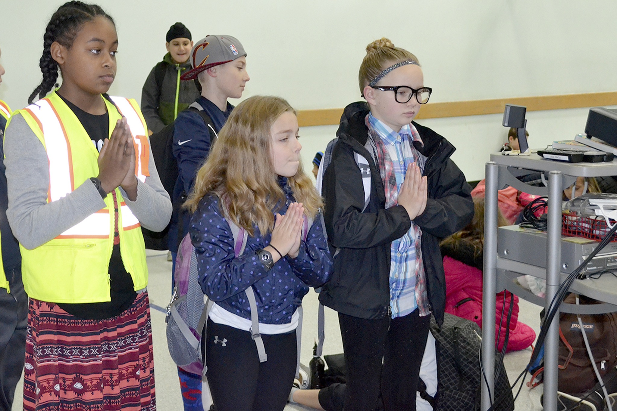 This year students meet in the gym, sit quietly, relax, close their eyes, and practice relaxation breathing for about five minutes before school starts.