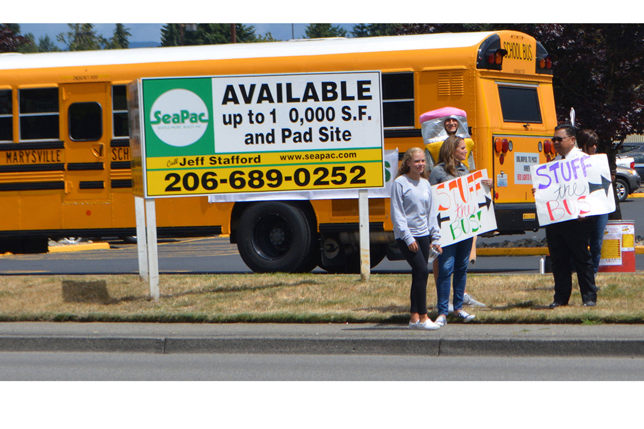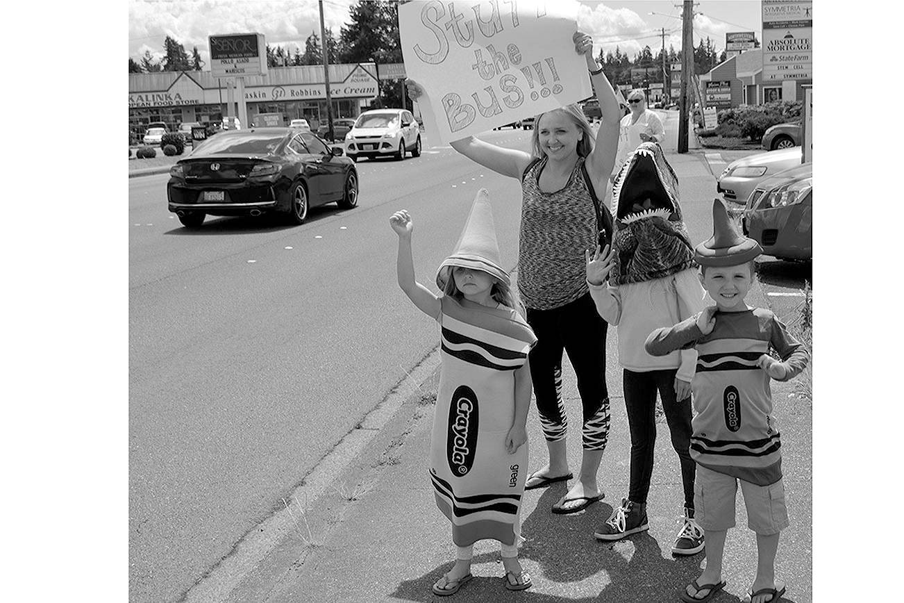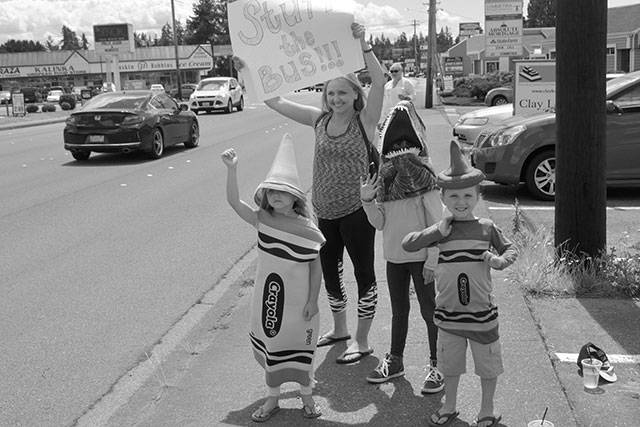 Reagan, 8, Kennedy, 6, and Wilson, 5, all named after presidents, solicited support along State Avenue, where school buses were parked on both sides of the road at Coastal and Grocery Outlet. Reagan wore a dinosaur head, while Kennedy and Wilson were dressed as crayons. Their mom, Jenny, waved a sign that said, simply, “Stuff the Bus.” (See photo at right).