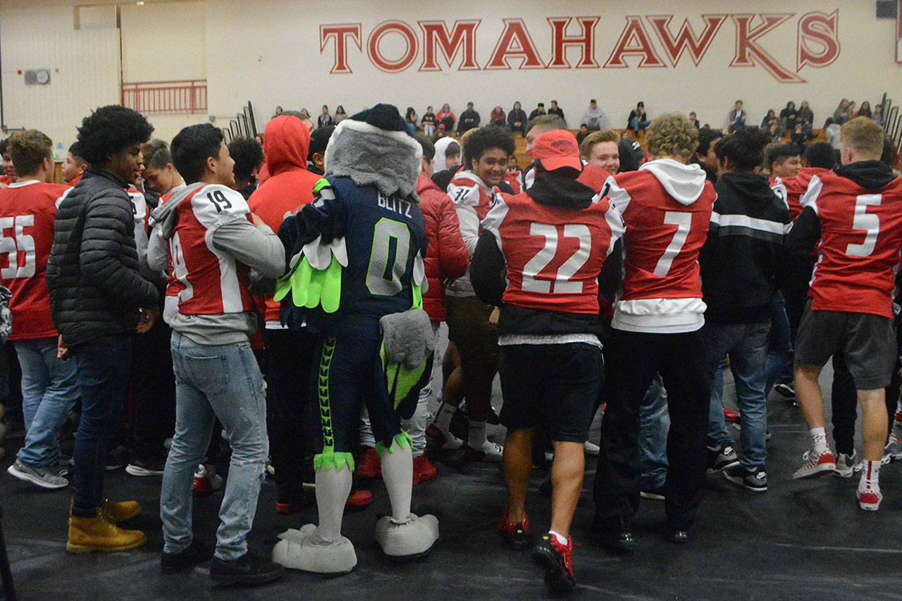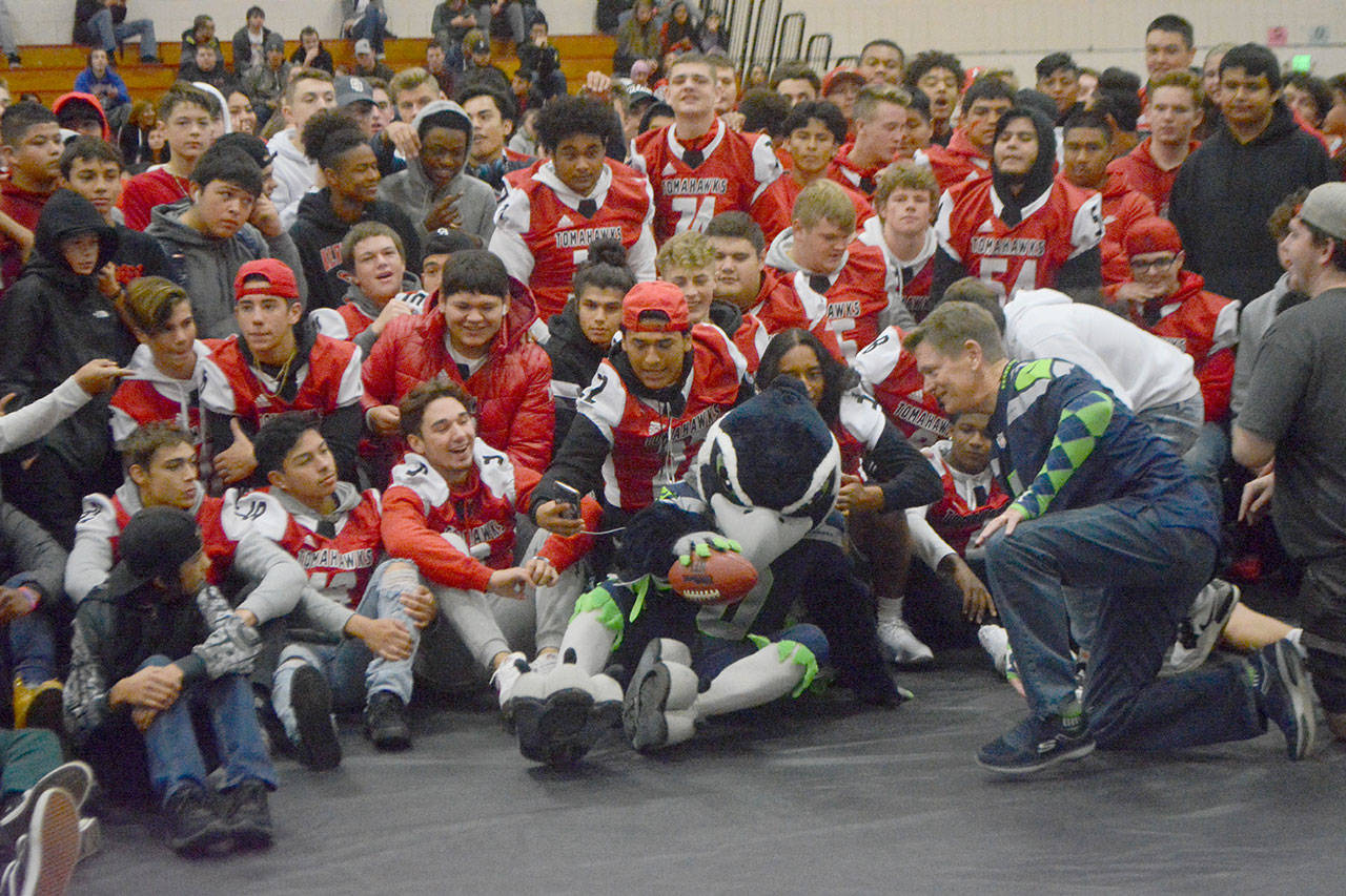 MARYSVILLE – Seattle Seahawks mascot Blitz thanked Marysville-Pilchuck High School and Marysville Windermere Realty for raising money to fight homelessness at an assembly Friday.