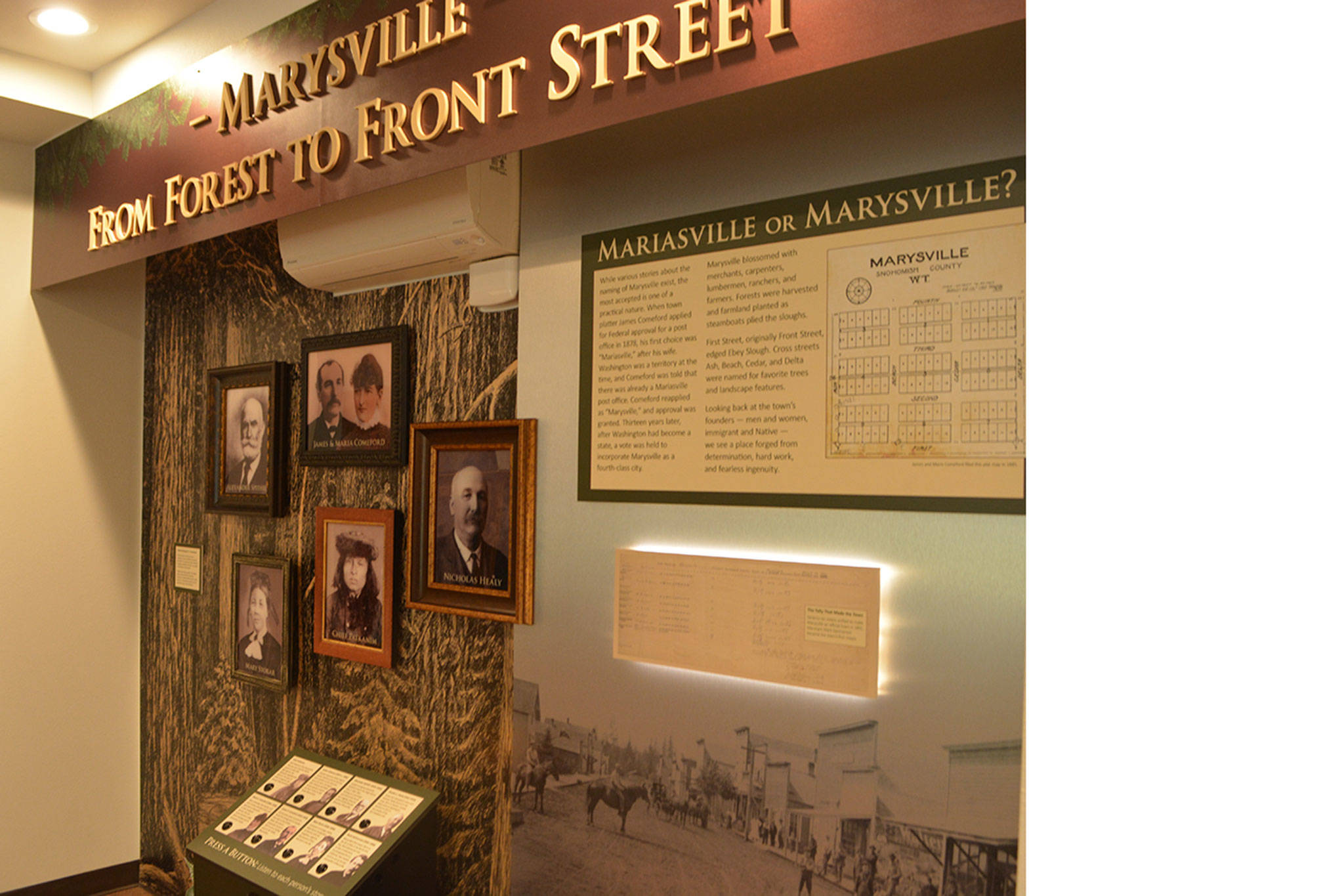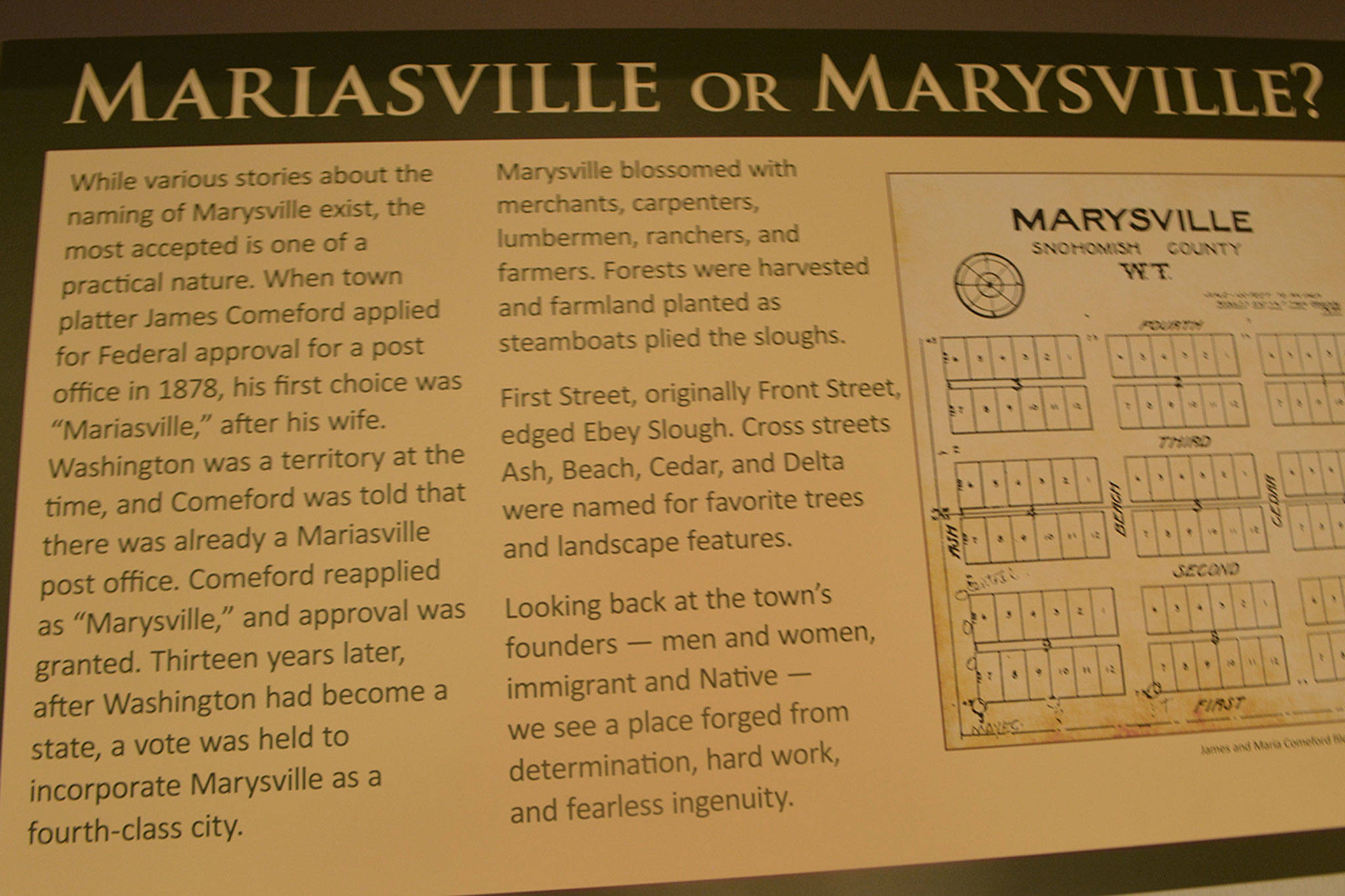 Lastly, the wall includes the story about the attempt to name our fair city Mariasville, after Comeford’s wife. But since a town in the region in Idaho already was named that, the post office required a new name – so Marysville it was.