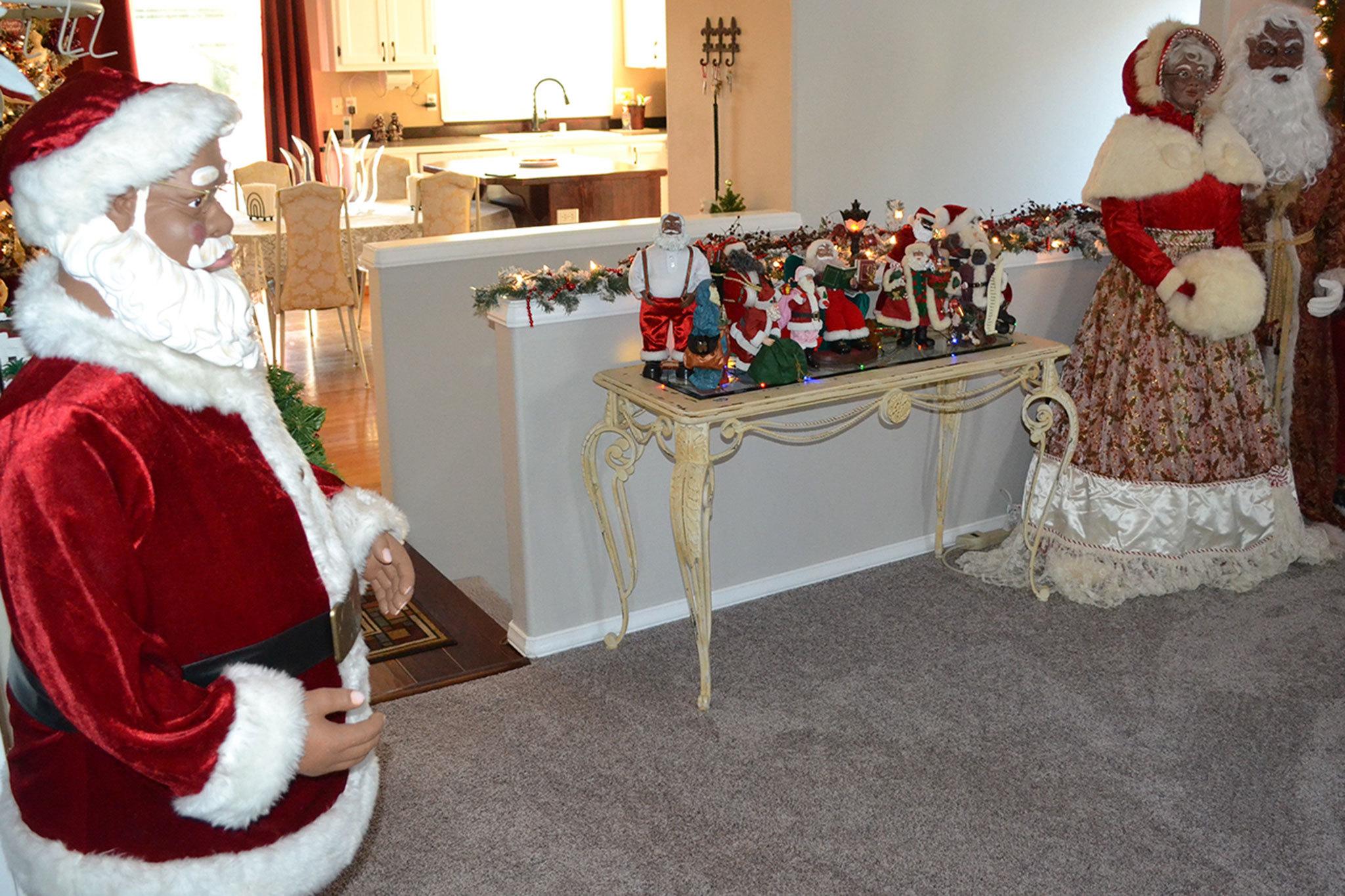 Walk in the door and the first thing you see is a dancing Santa Claus. To the right of that is a number of smaller Santas on a table. In the living room is a Santa and Mrs. Claus made to resemble Bussey and her husband. There’s also a Christmas tree and numerous other Santas.