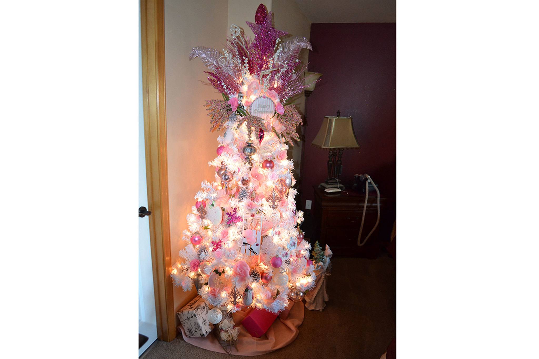 In their bedroom is yet another Christmas tree, but that one is a little different as it’s pink. On a dresser is another Christmas village.