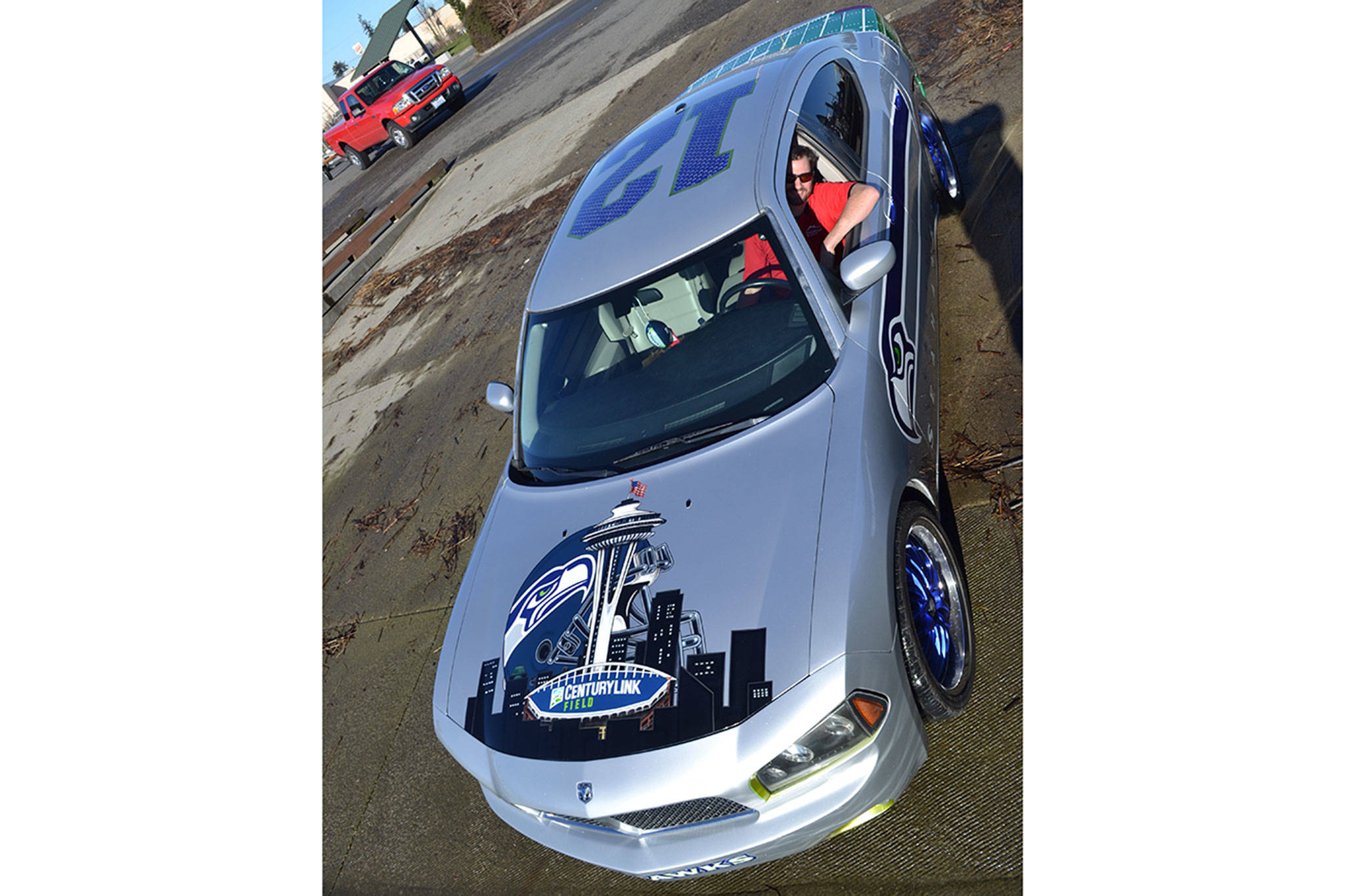 MARYSVILLE – There are a few others around town, but this one looks like the kind of car Russell Wilson would be driving. But it’s not. It’s Rick McCarthy of Marysville. McCarthy, 37, and friends Jimmy “Buffet” Kollman, Tanya DeClusin and Brian Cornwell have spent more than 1,700 hours air-brush painting a 2007 Dodge Charger in a Seattle Seahawks theme. On the top of the car is a giant “12”. On the hood is a helmet, Space Needle and Century Link field. On the back is a football field that McCarthy hopes some Seahawk players will autograph some day. On both sides there are Seahawk birds with a streak behind them. There’s even a painting under the hood of Marshawn Lynch (Beast Mode) stomping on a 49ers helmet. Just the blue rims took 40 hours each to paint. The paint job is worth more than the car, so McCarthy has insured it separately. It’s all hand-airbrushed, no decals or stickers. “You can’t feel the artwork,” he said, adding it blends right into the rest of the paint job.