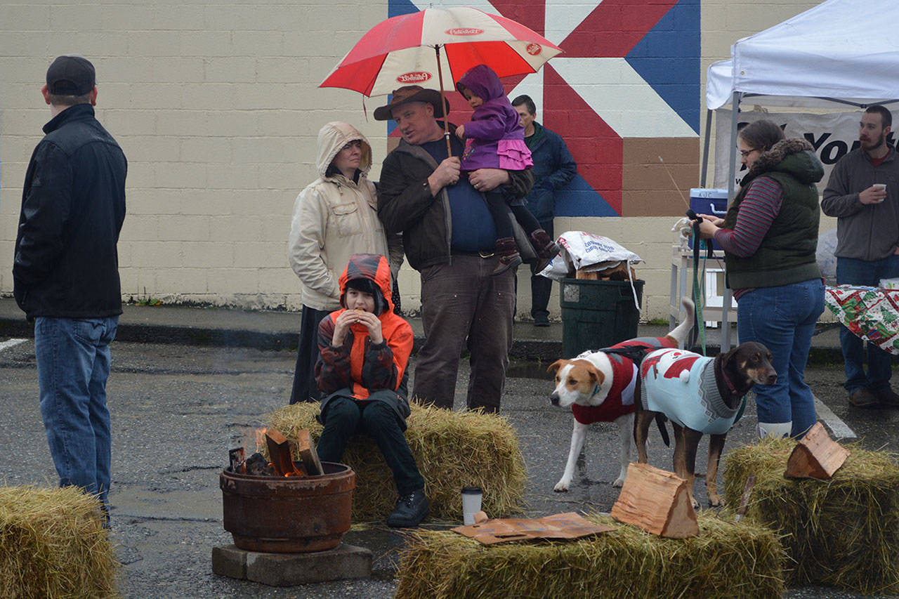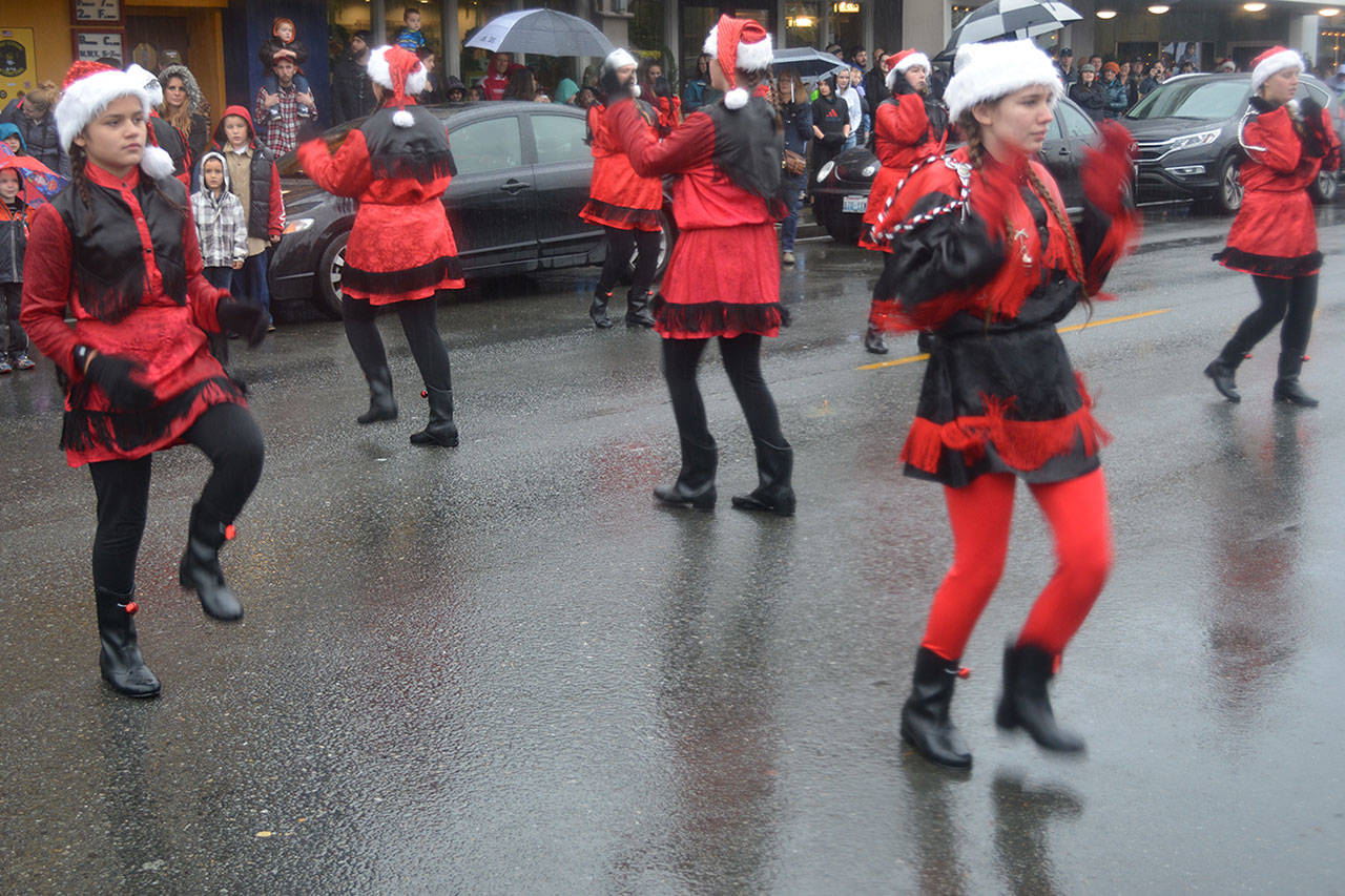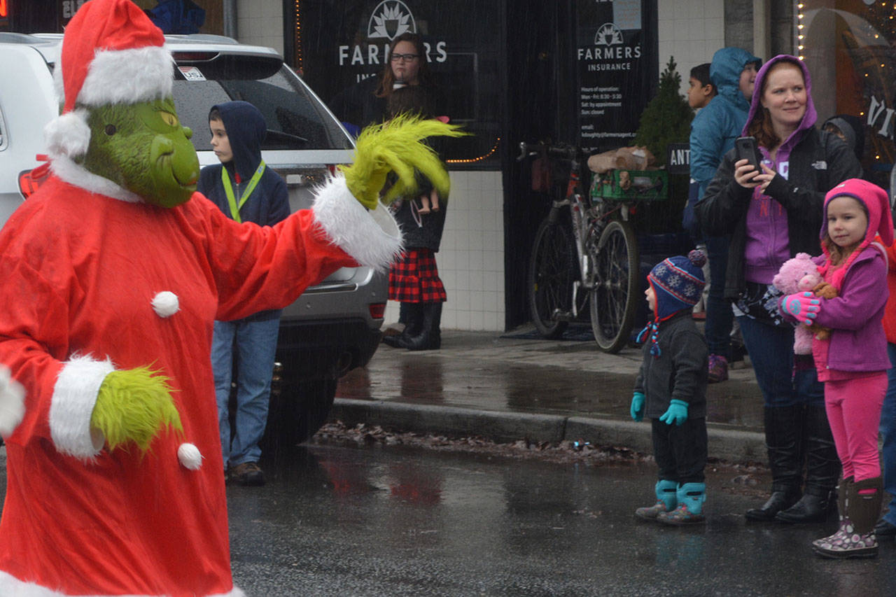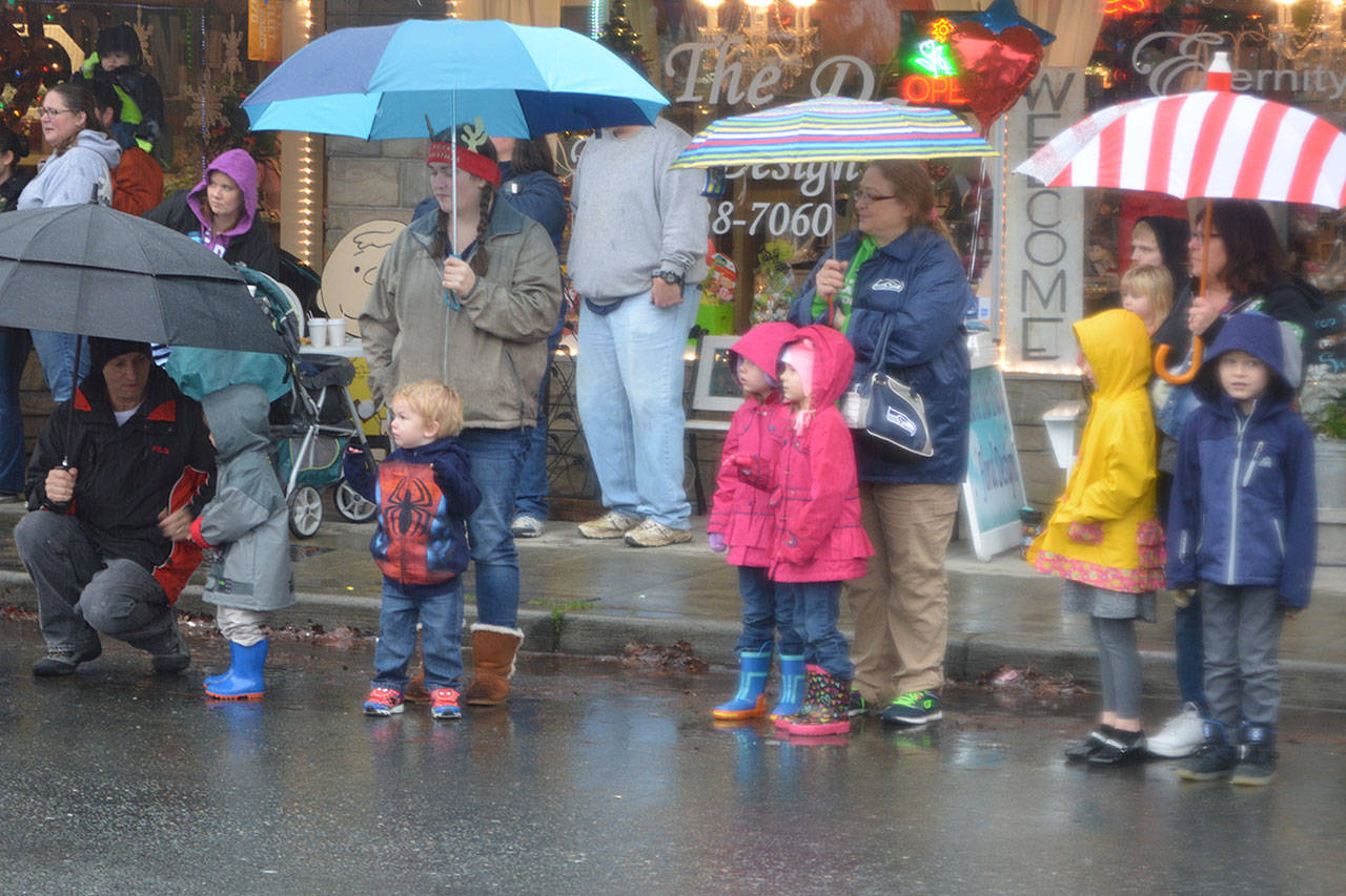 Before that, though, the holiday parade took place. Police, fire, tractors, marching groups and more performed. Onlookers mostly camped out under business overhangs or their own bumbershoots. Cascade Valley Senior Living won the Grand Prize for its Winter Wonderland entry.