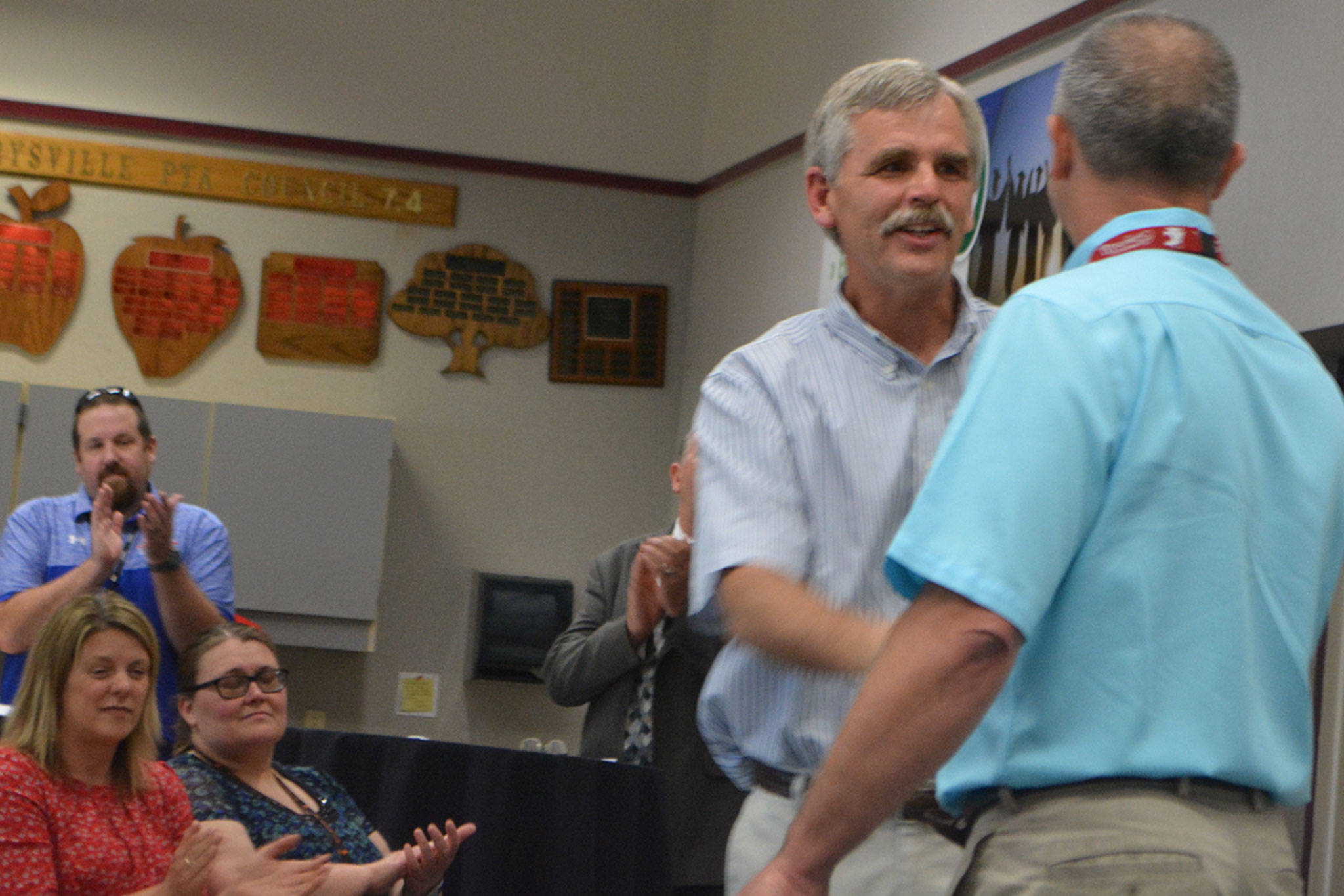 Teacher John Hewitt was honored by Shoultes Principal Cory Taylor. “He knows fifth grade front and back,” Taylor said, adding he helped show newer teachers the ropes.