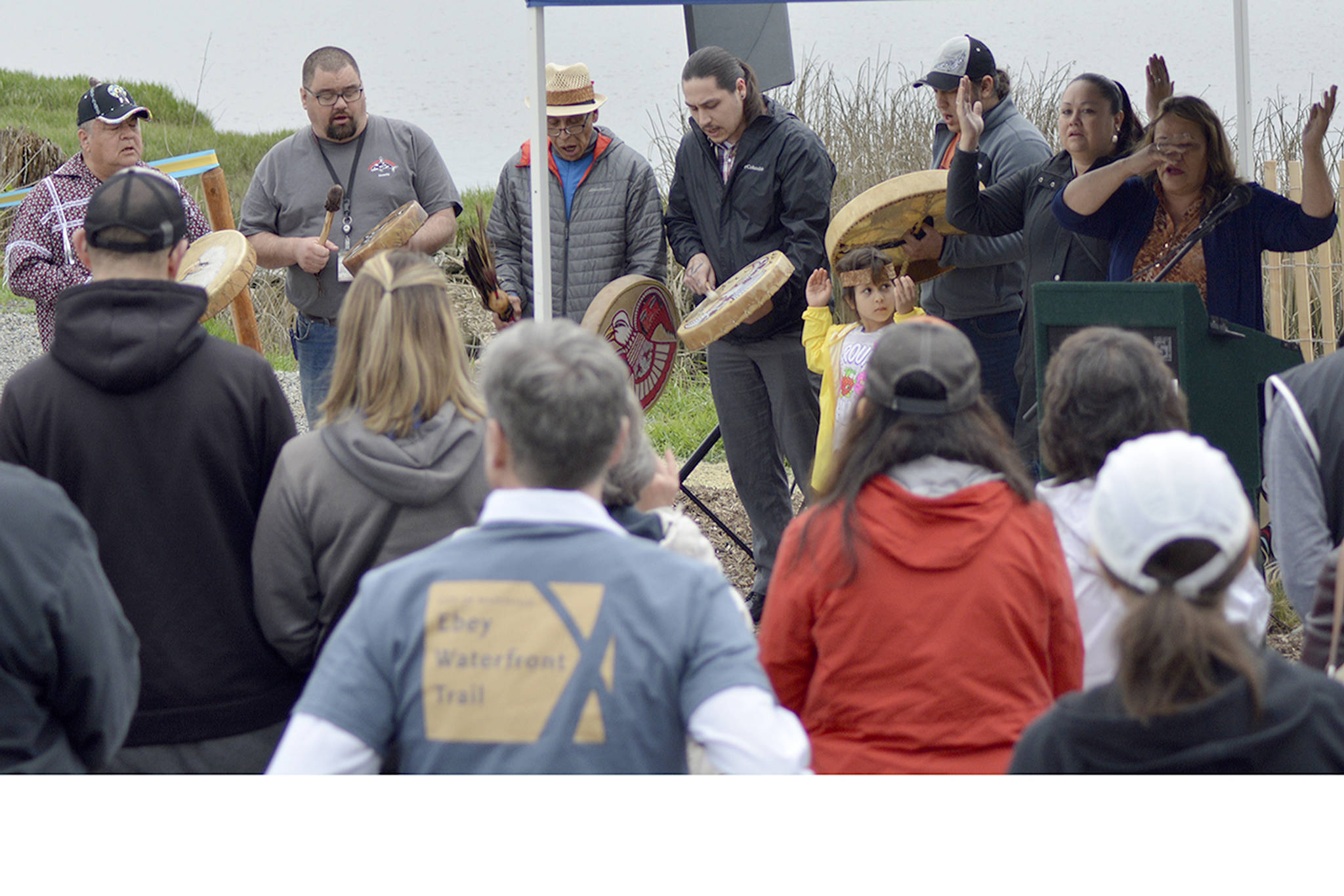 Mayor Jon Nehring thanked the Tulalip drummers and singers for blessing the trail. He said breaching the dike that had created 400 acres of dairyland has brought back an estuary alive with plants and animals.