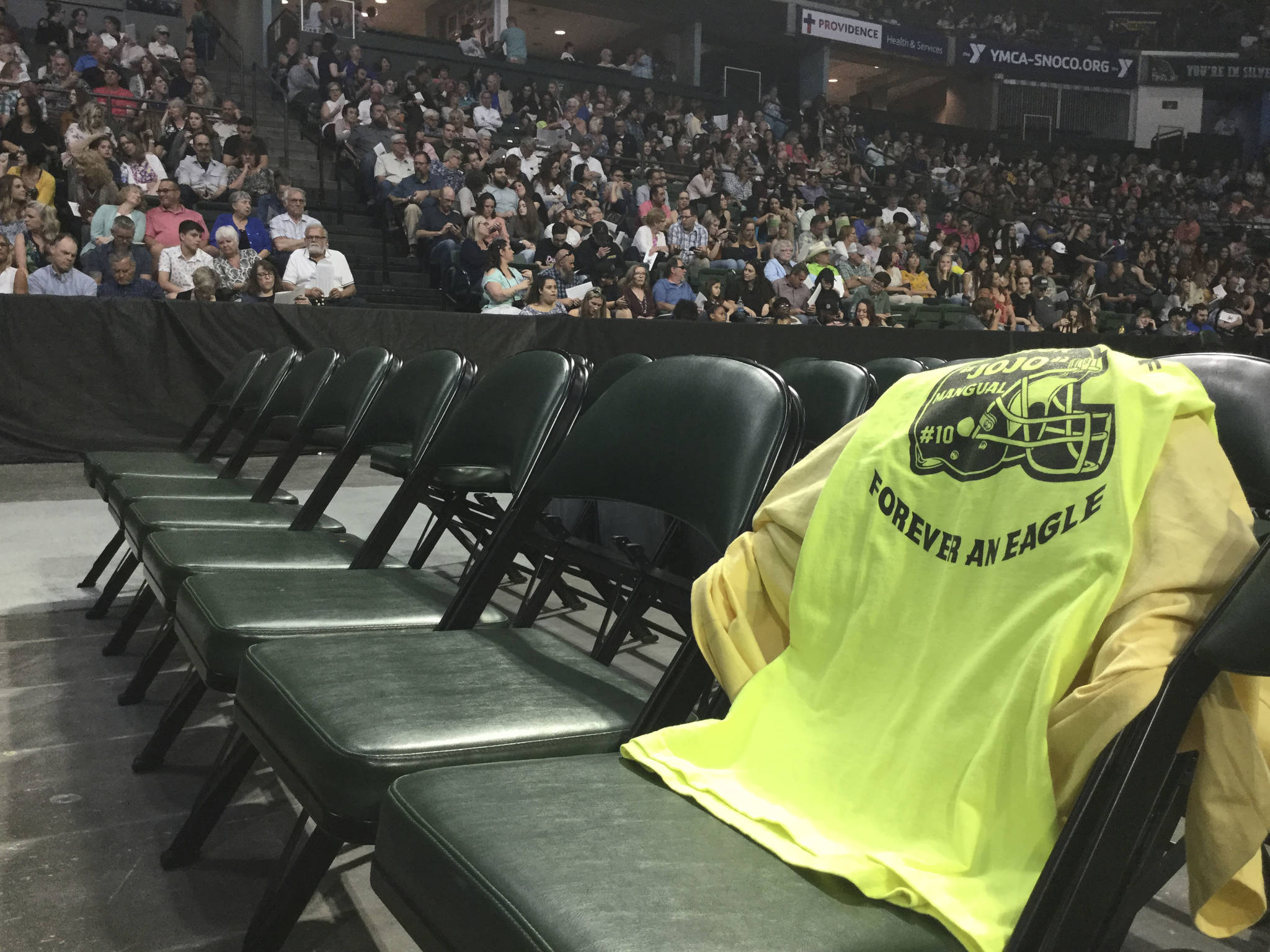 The commencement paid touching tribute to Jovon “Jojo” Mangual, leaving a chair open amid the rows of graduates and a lime green shirt that read, “Forever an Eagle,” and imprinted with a football helmet with Jojo’s name and his #10 on it.