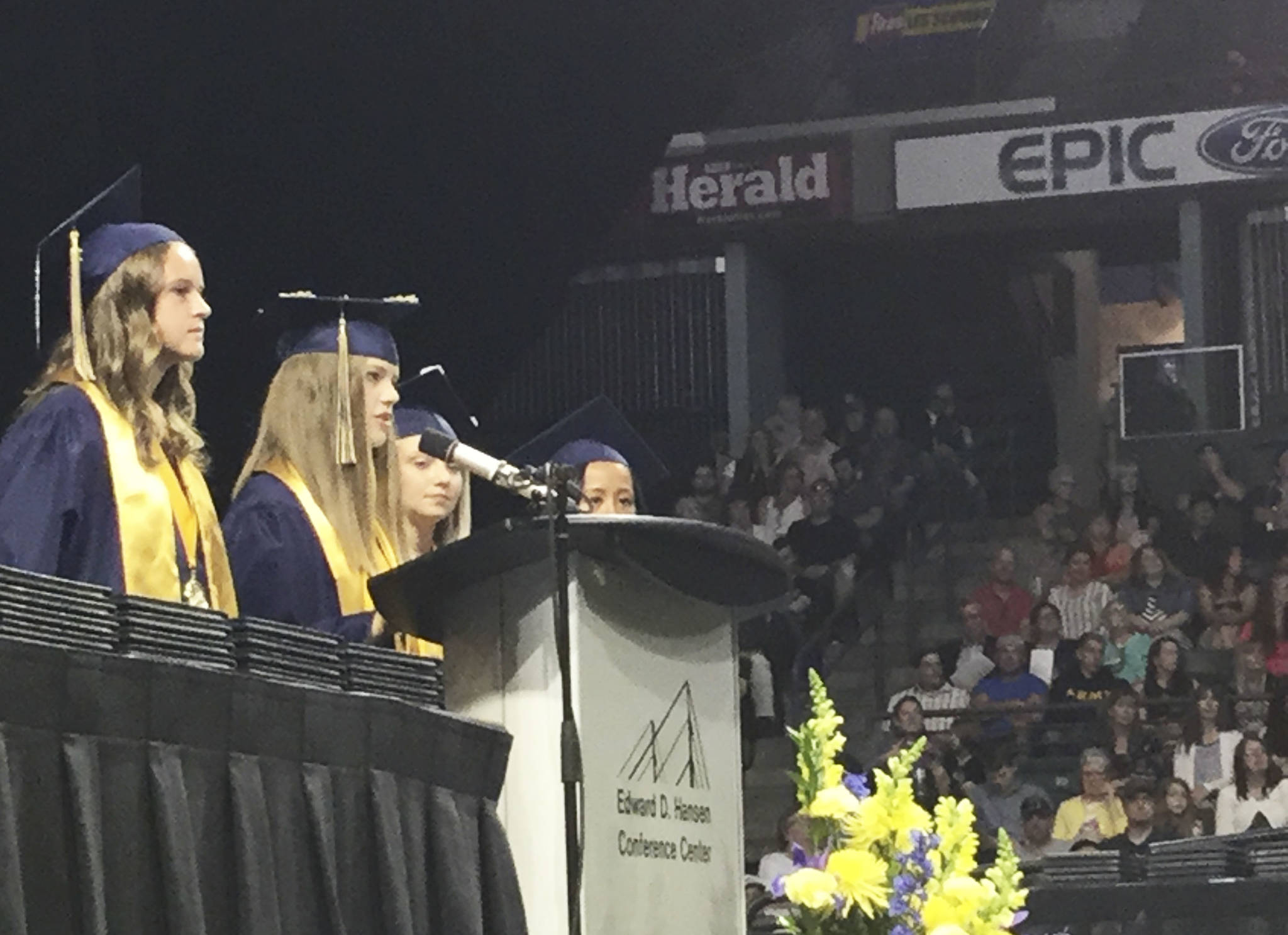 Katelyn Morris, joined by fellow valedictorians Anderson, Annika Hatfield and Allyson Roller, said her class “won’t be remembered for being cowardly lions who sit back in fear when life gives us a nudge on the shoulder, but rather for being courageous. Or, for lack of better terms, lion hearted.”