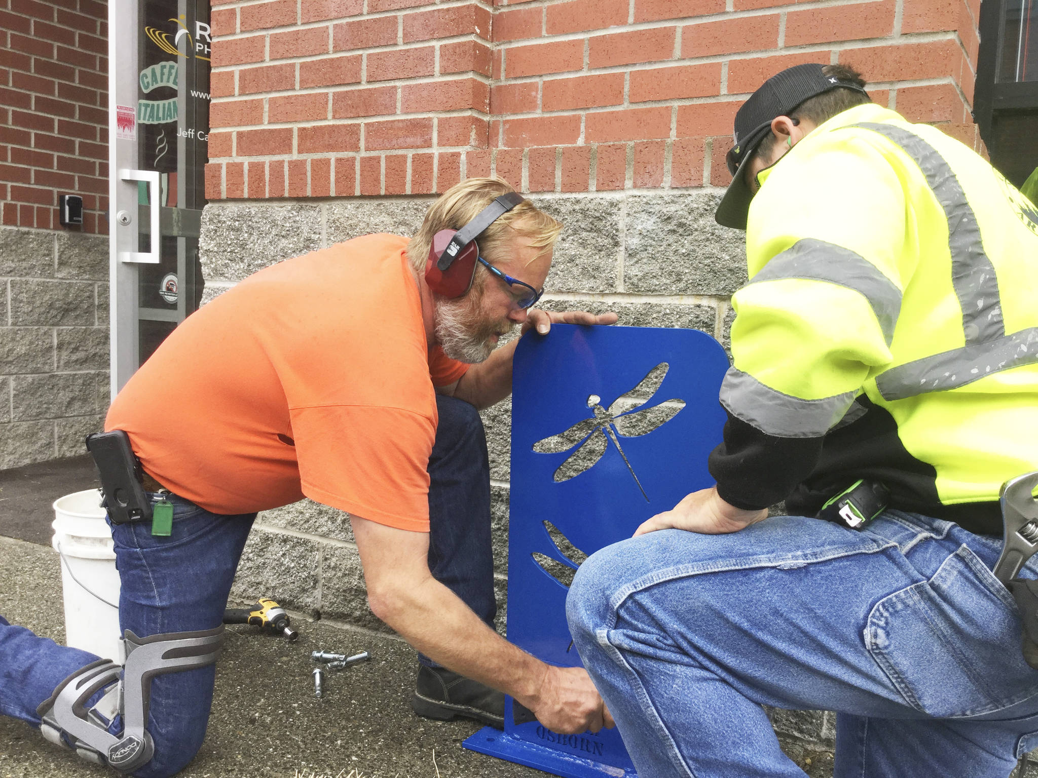 The pieces are called “shadow” bike racks because they cast a shadow on the ground of the shape cut into the metal, including ducks in flight, dragonflies, butterflies, cows, a tractor and the Arlington Fly-In logo.