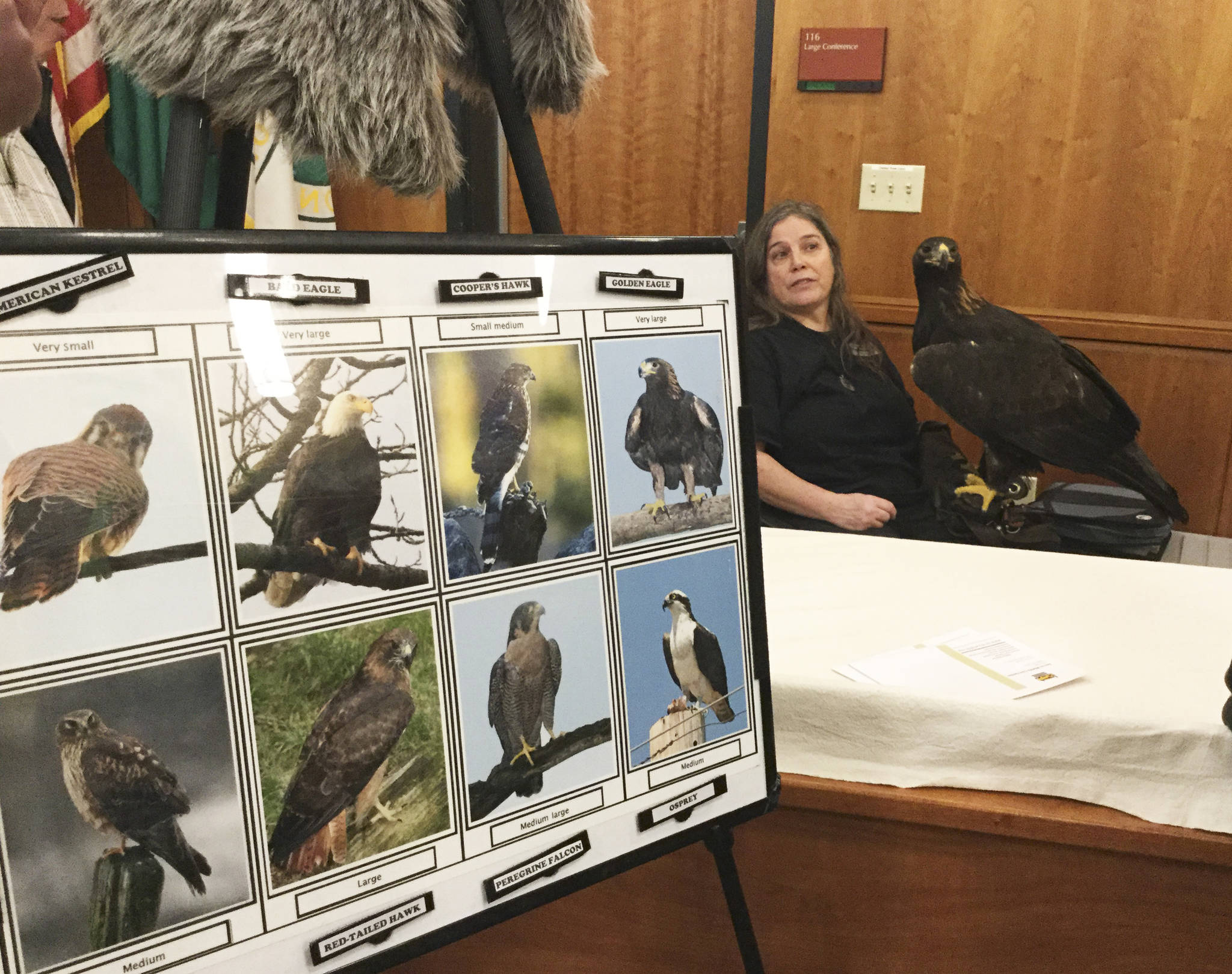 They found eagles carved in wood, eagles drawn on canvas or paper and, courtesy of Sarvey Wildlife Center, live and up close in the City Council chambers at an open house, along with a menagerie of hawks and other birds of prey.