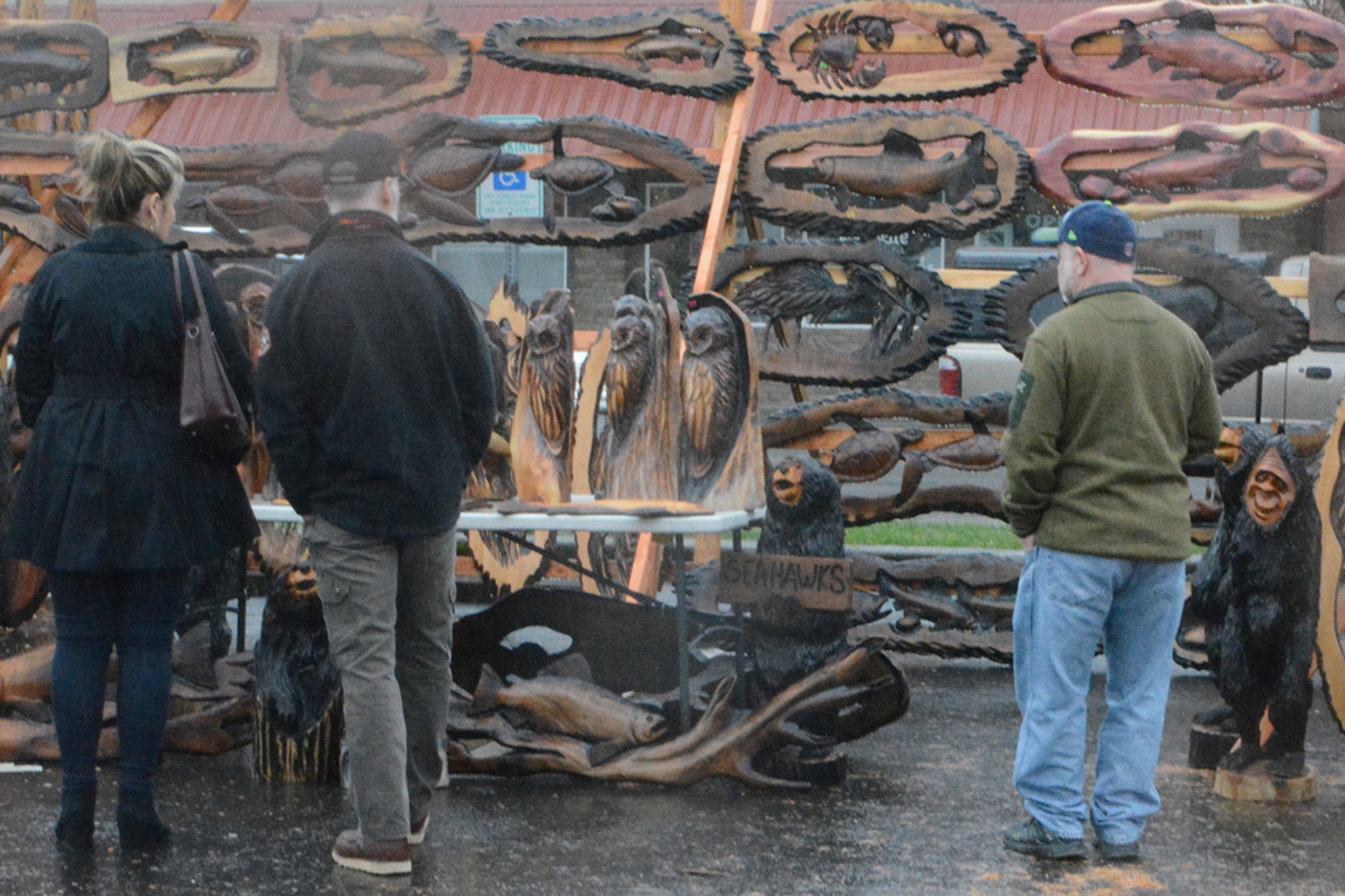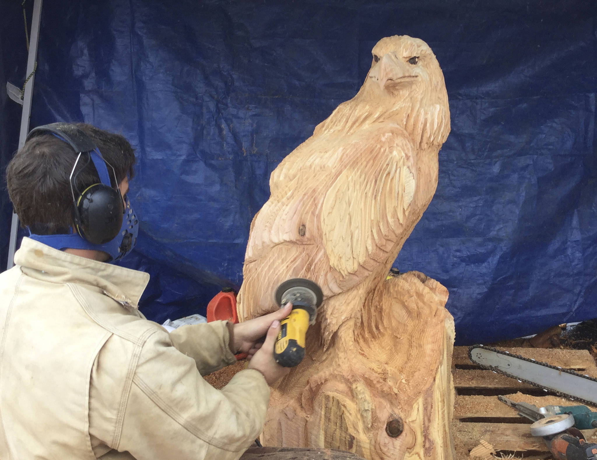 Chainsaw sculptor Bruce “Thor From Earth” Thorsteinson has been a regular at the event, he said, after adding touch-up white spray paint to his latest eagle sculpture creation.