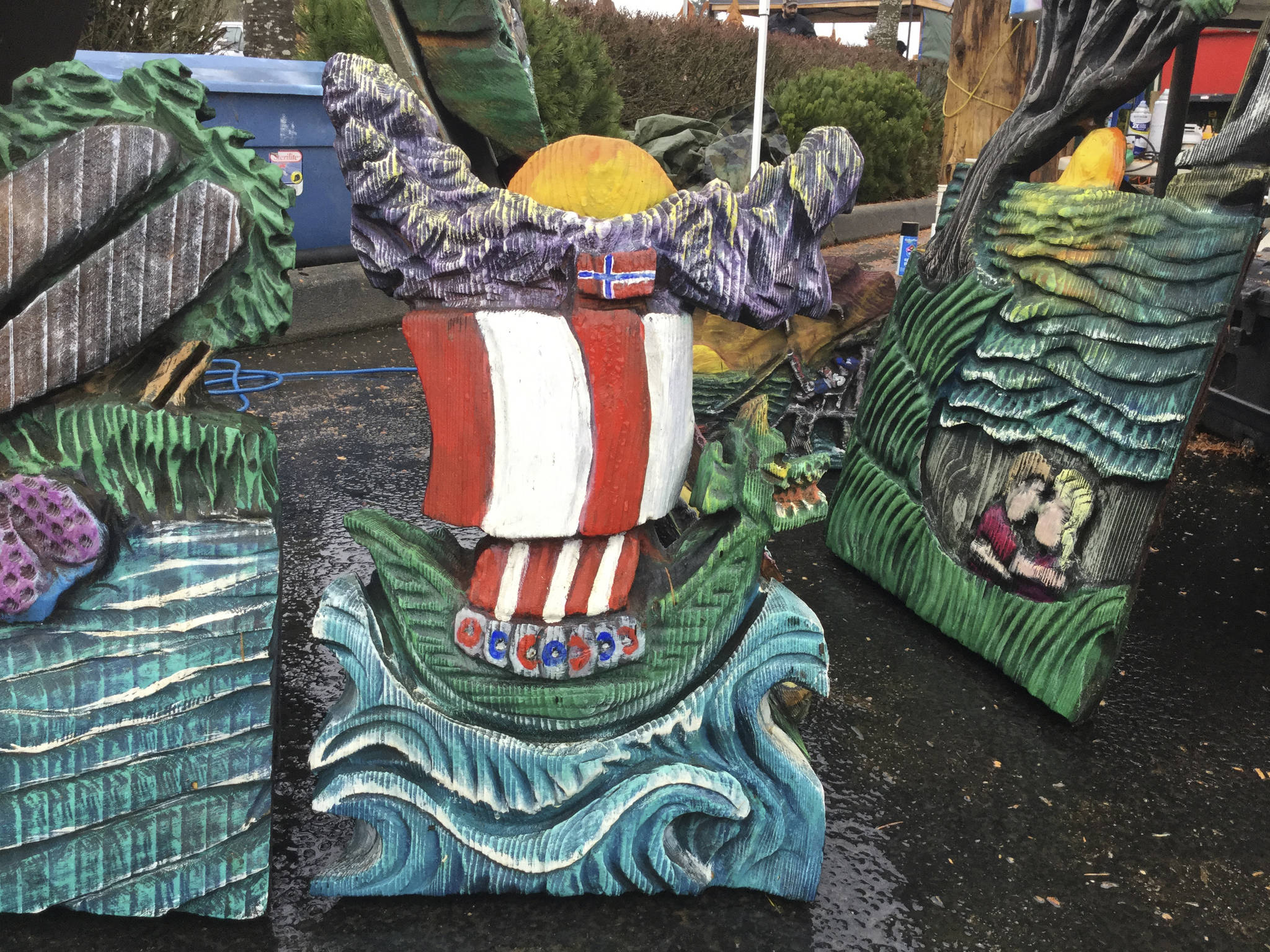 Unlike the traditional stock wood finish tones more common to chainsaw art, he uses a significant amount of colors in his work, which includes Viking ships, lighthouses, cats and alligators. A king crab-sized sculpture sold in minutes, with his signature “Thor” inscribed on the bottom.