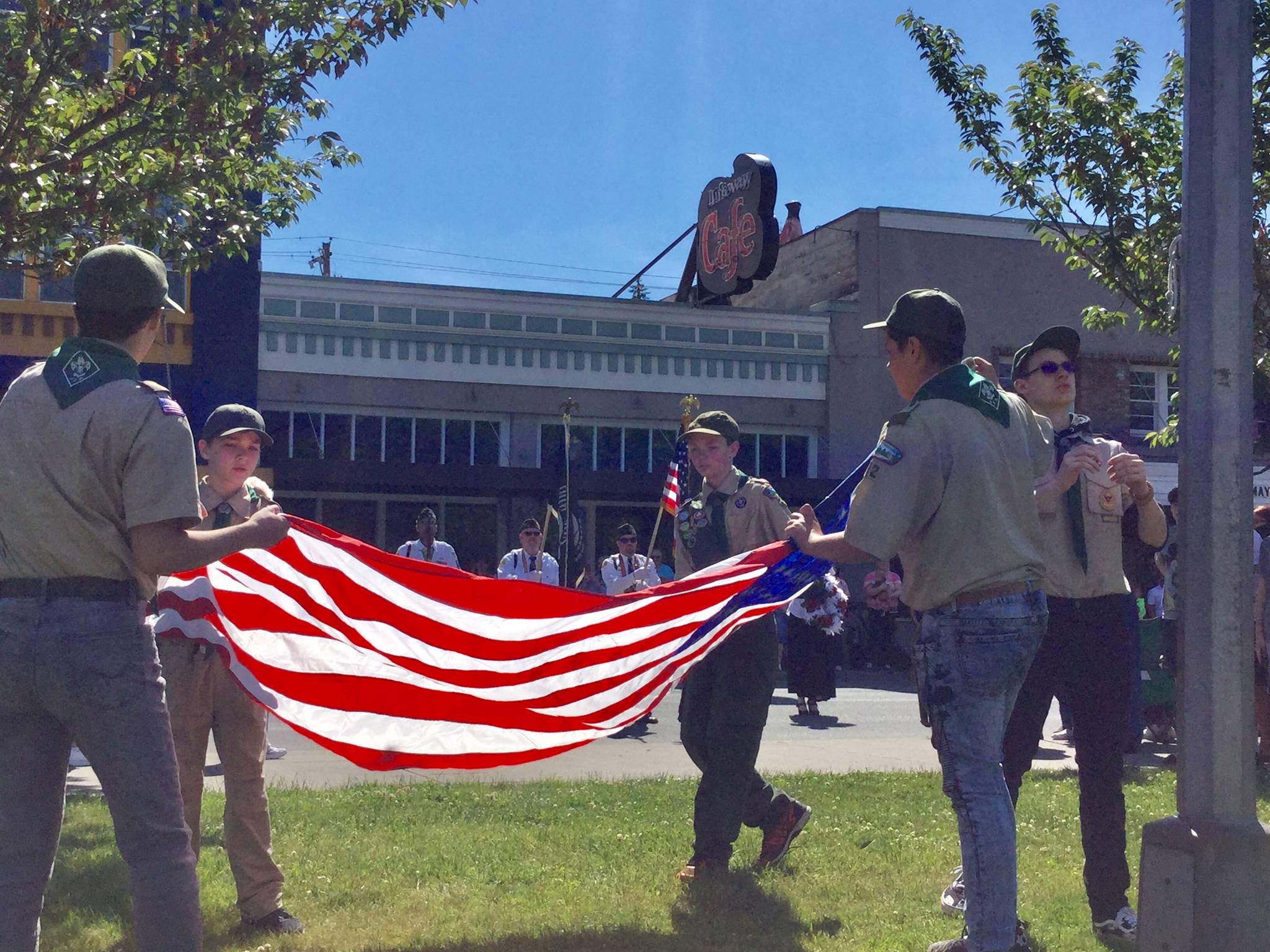 American Legion veterans and members presented the colors to kick off the parade, assisted by Boy Scouts who raised the flag in Legion Park. Doreen Delancy with the Legion Women’s Auxiliary placed a memorial wreath in front of the post’s cabinet.
