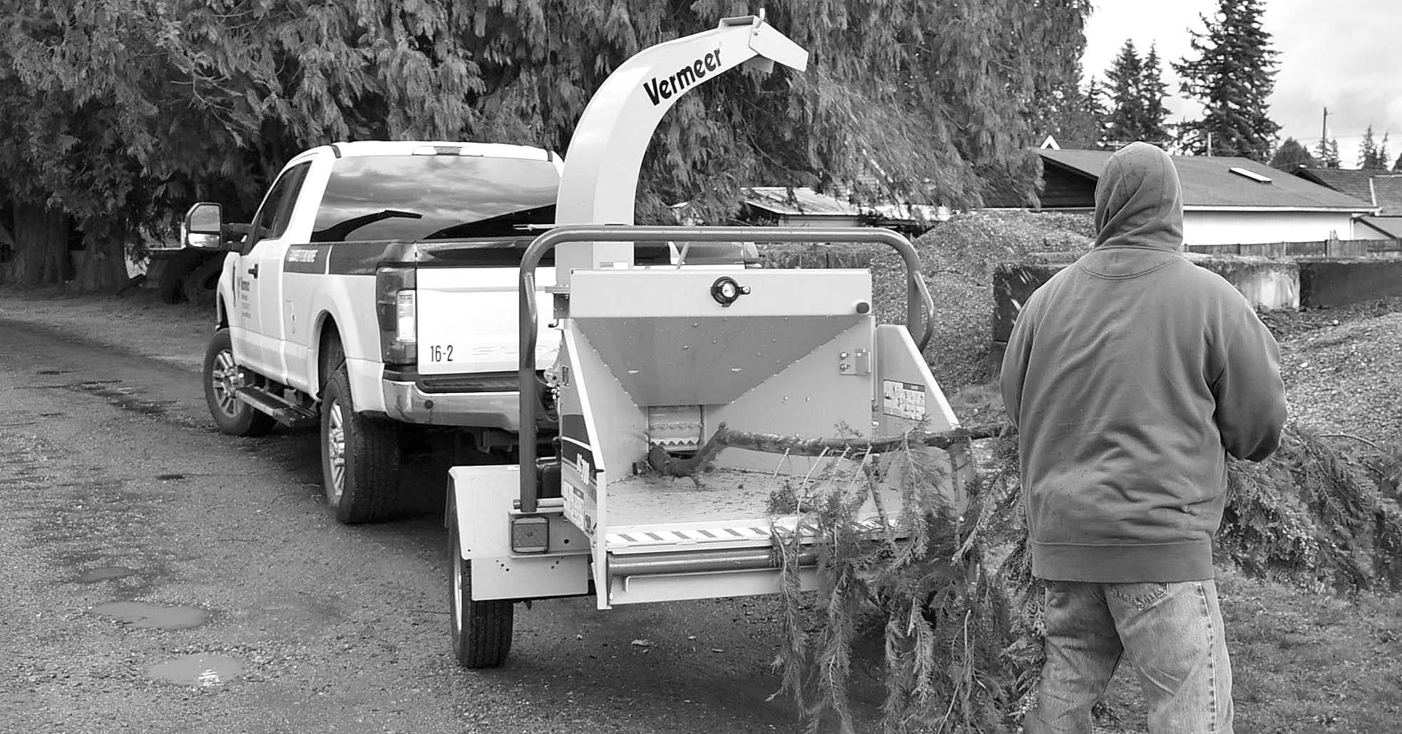 An Arlington Schools maintenance worker feeds a large branch through a chipper. Arlington Public Schools recently received a Healthy Kids-Healthy Schools grant to buy the chipper.
