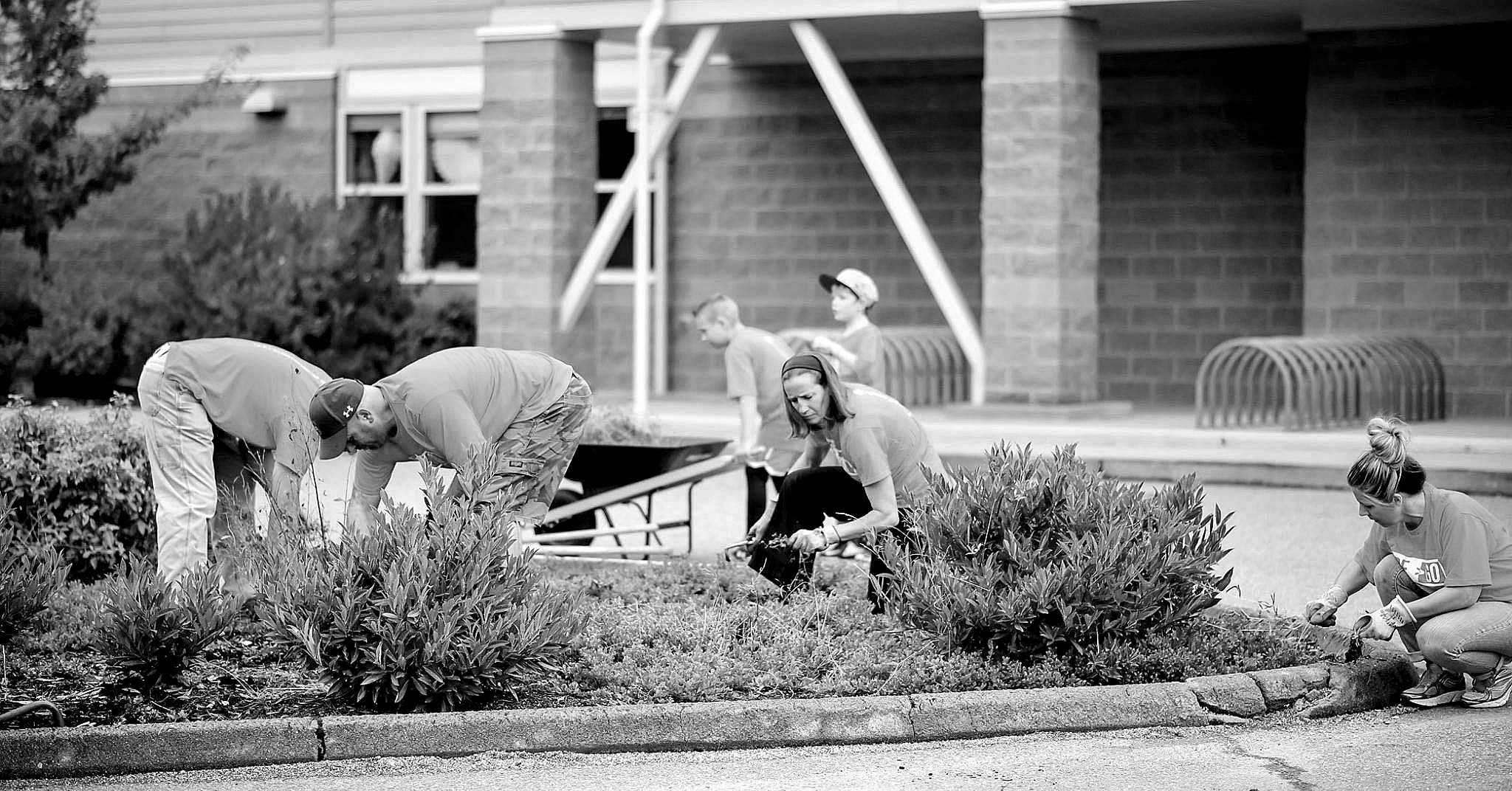 About 100 volunteers joined in to pull weeds, trim hedges and plants, spread new bark, paint fire lines and stripe the parking lot.