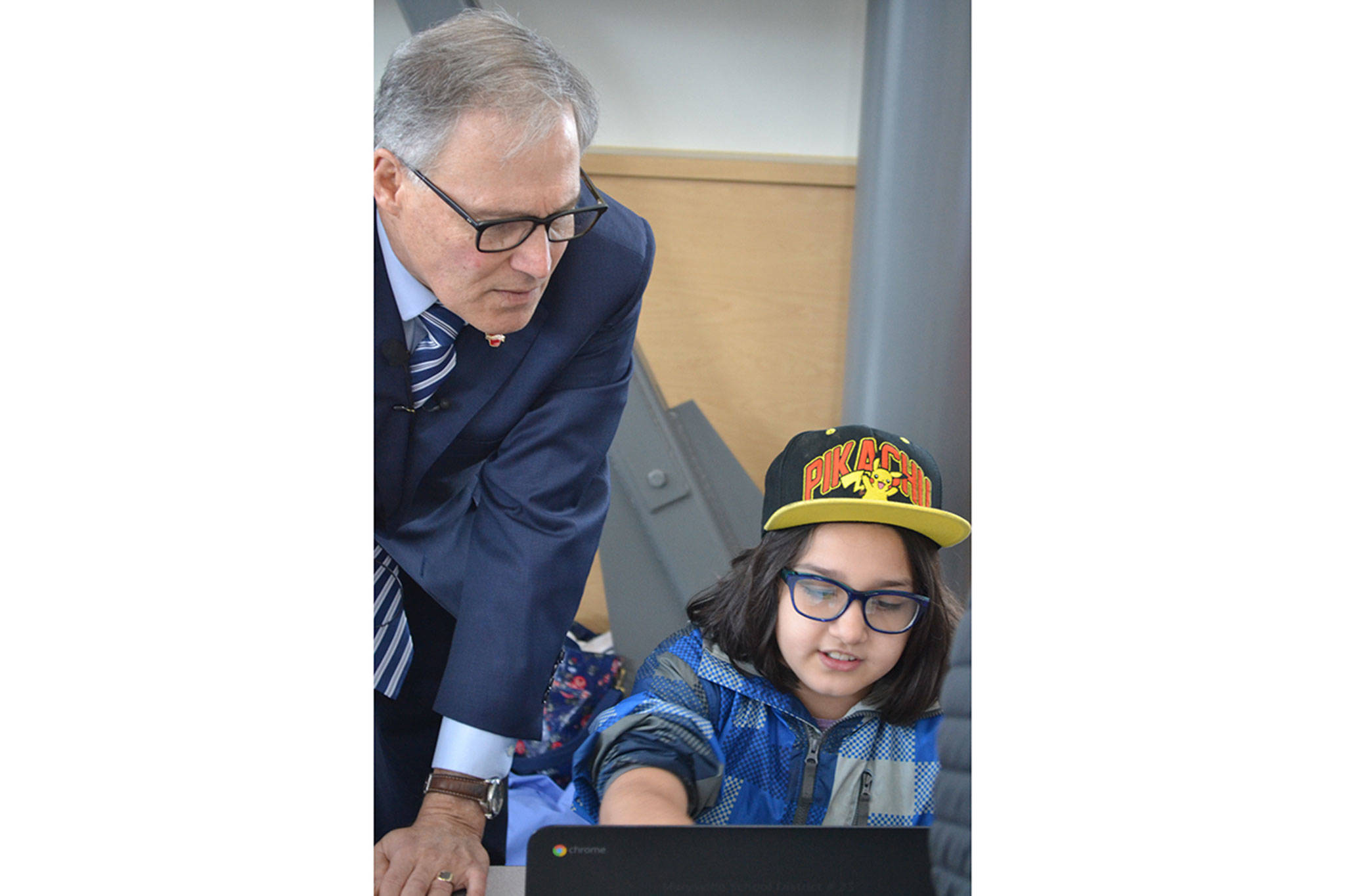 Shoultes Elementary School students Bethany Campbell and Amanda Smalley showed Inslee how they are learning computer coding.