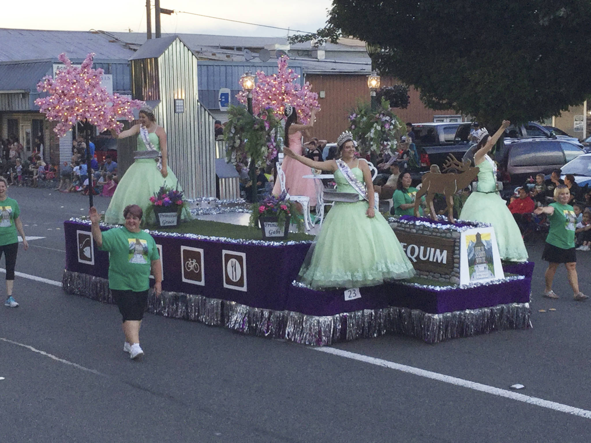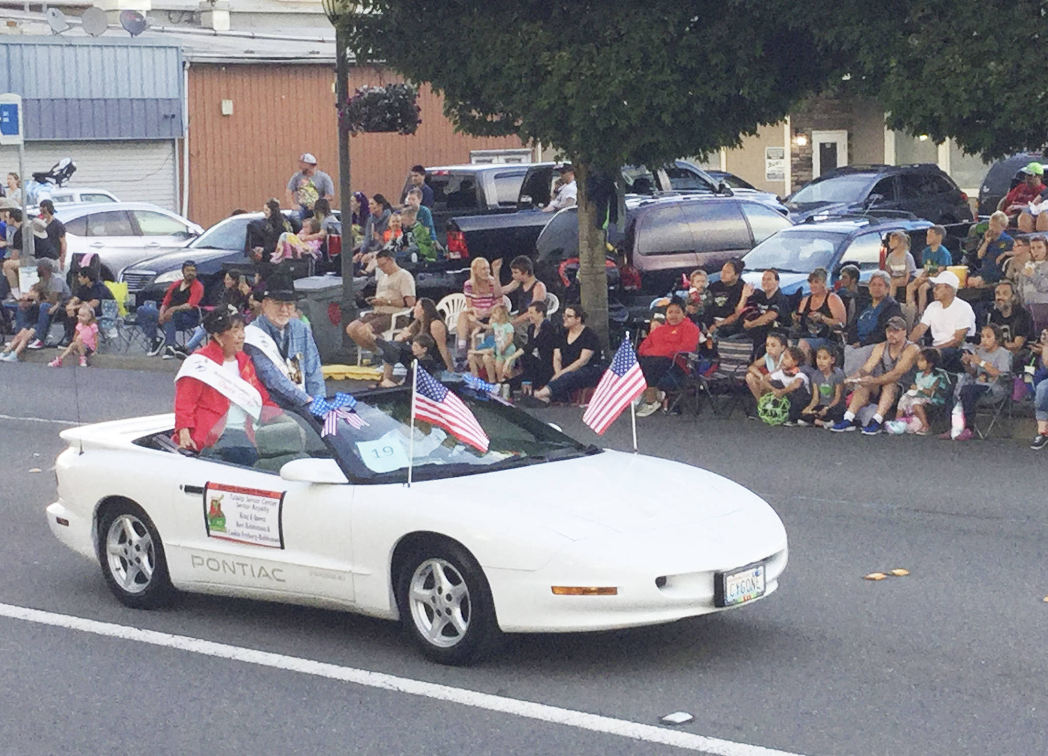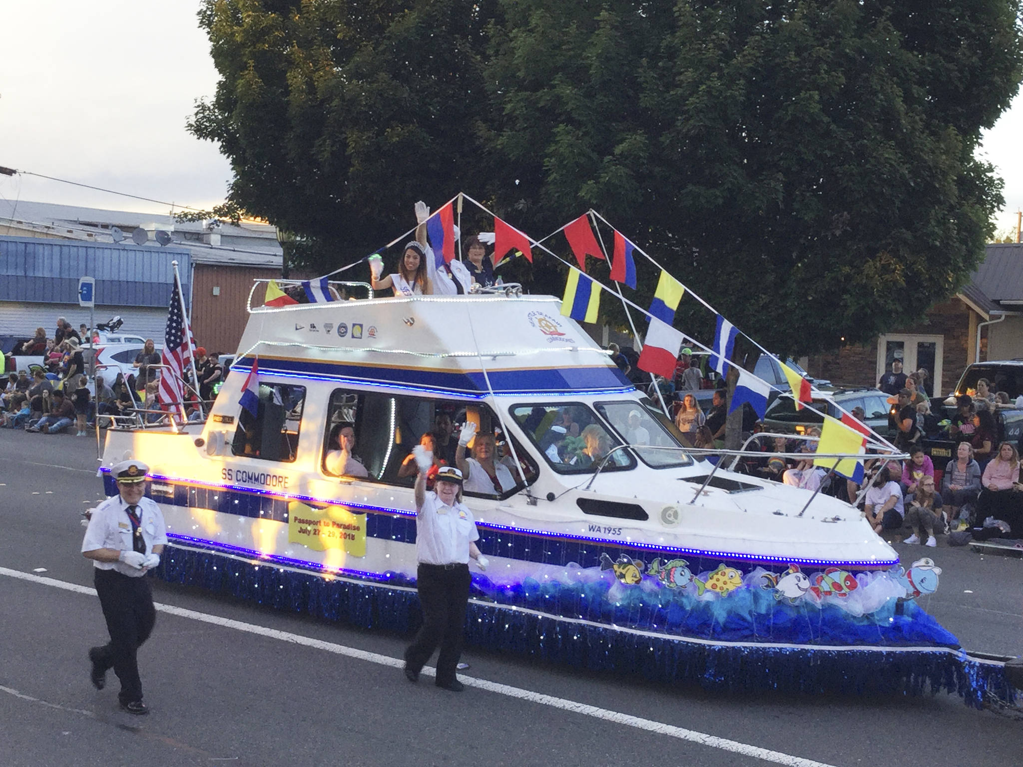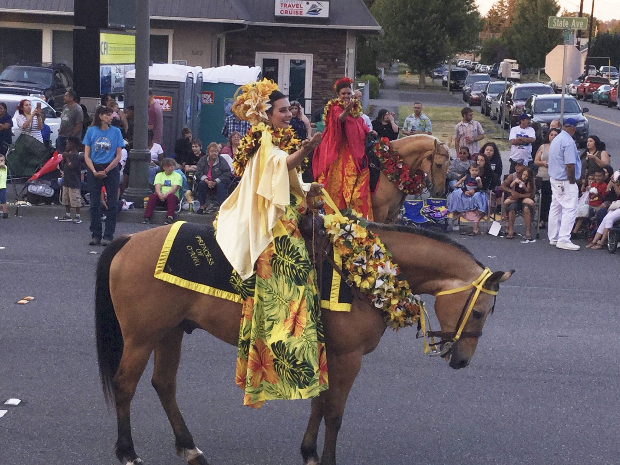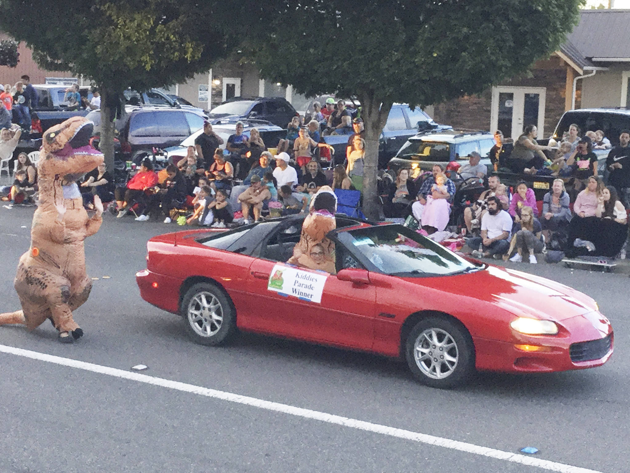 Floats from communities around the Pacific Northwest and British Columbia delivered a dazzling display of music and lights, joined by decorated cars from all eras, gymnasts, high school marching bands, drill teams, Colors of Hawaii island horses and riders – and even a couple of dinosaurs, winners of the earlier Kiddies Parade.