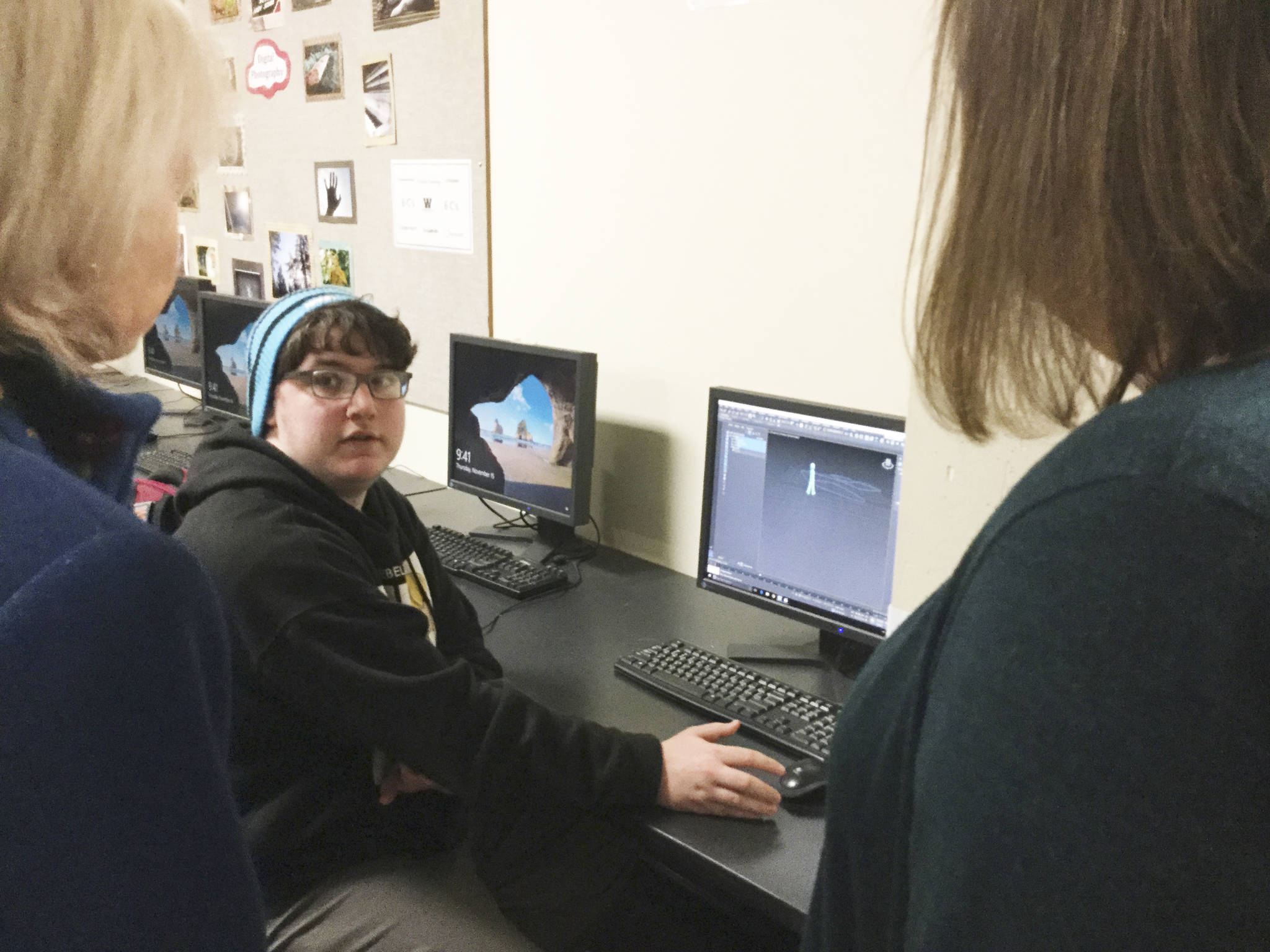 During a stop at teacher Christopher Hauk’s class, students were working on digital photography projects and 3-D animation. Students worked on coding for a digital coin flip program. The program simulates 100 coin flips.