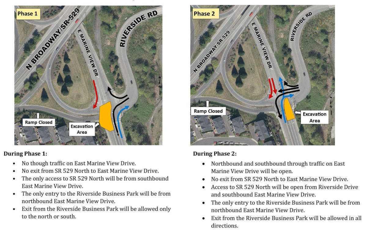 The key road closure will be the offramp from northbound Highway 529 to East Marine View Drive in Everett. However the northbound Highway 529 onramp will still be usable from southbound East Marine View Drive.