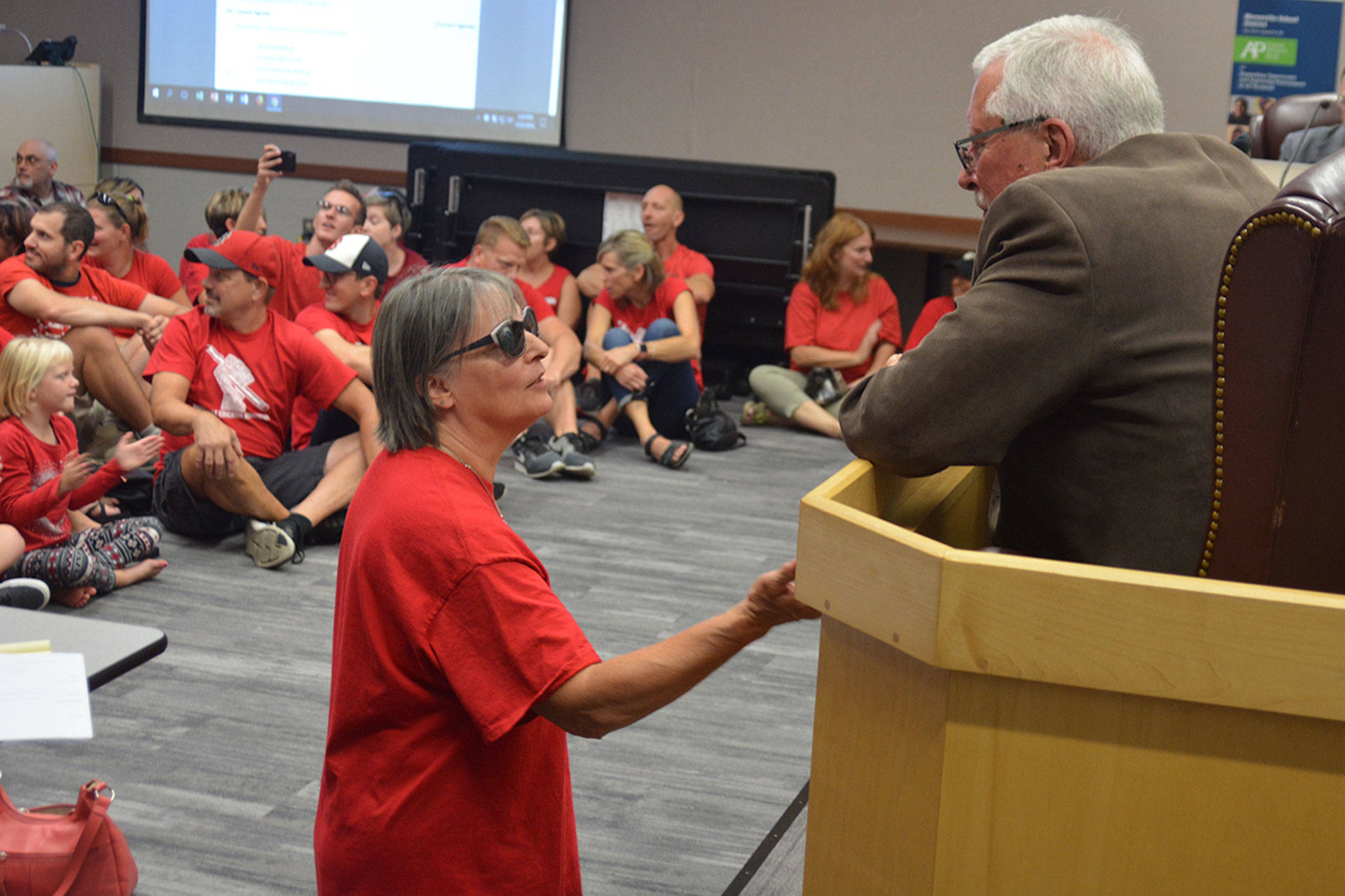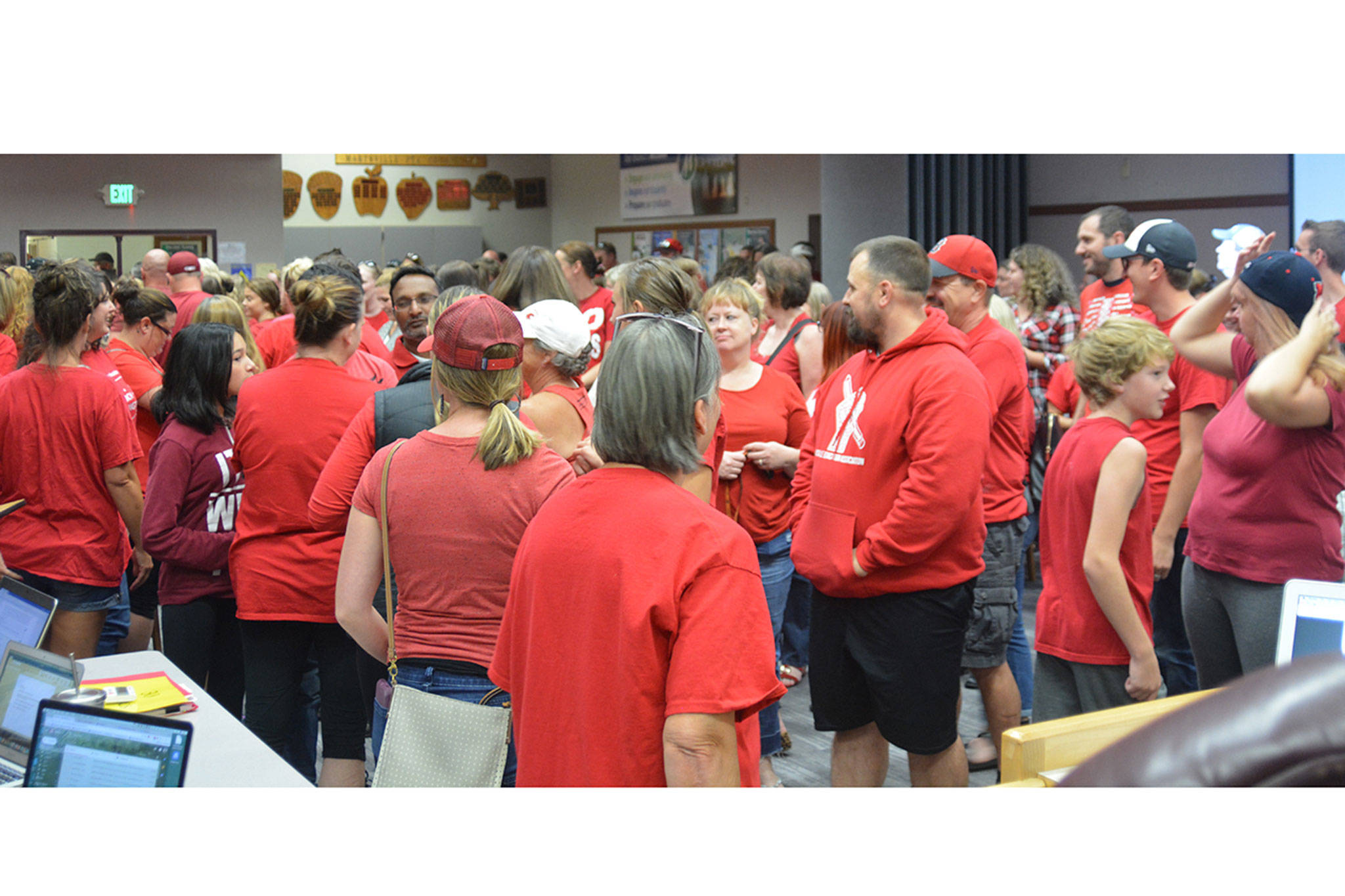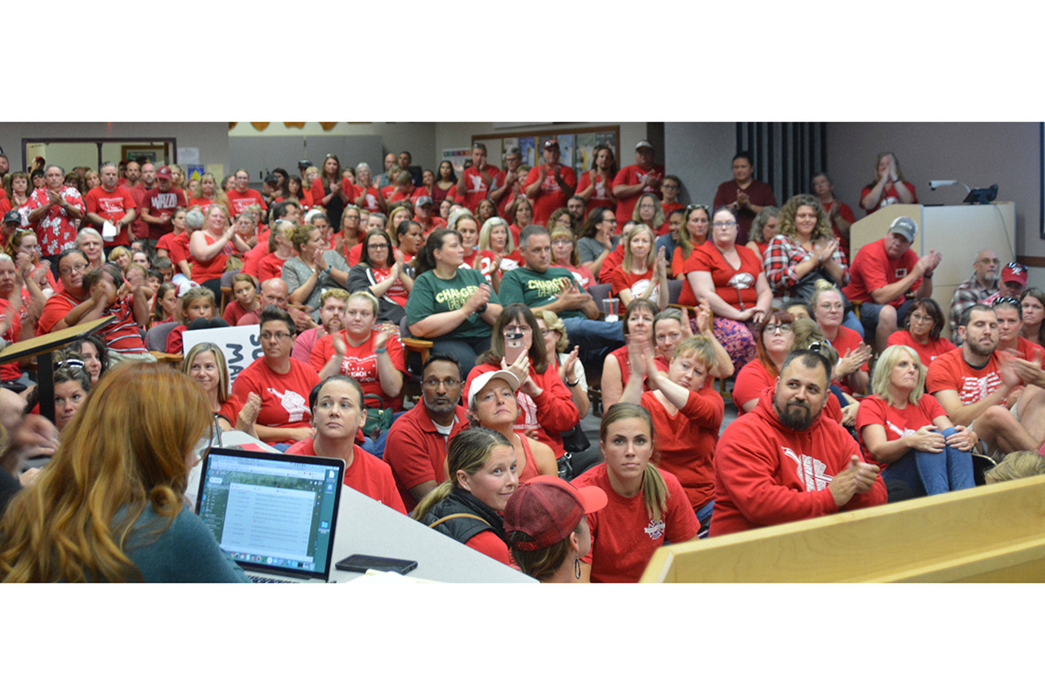A small portion of the approximately 300 teachers at the Marysville School Board meeting Monday night chanted that slogan as they left the room. The sea of red shirts looked a lot like a Nebraska Cornhuskers home game, with supporters spilling into the hall and outside.