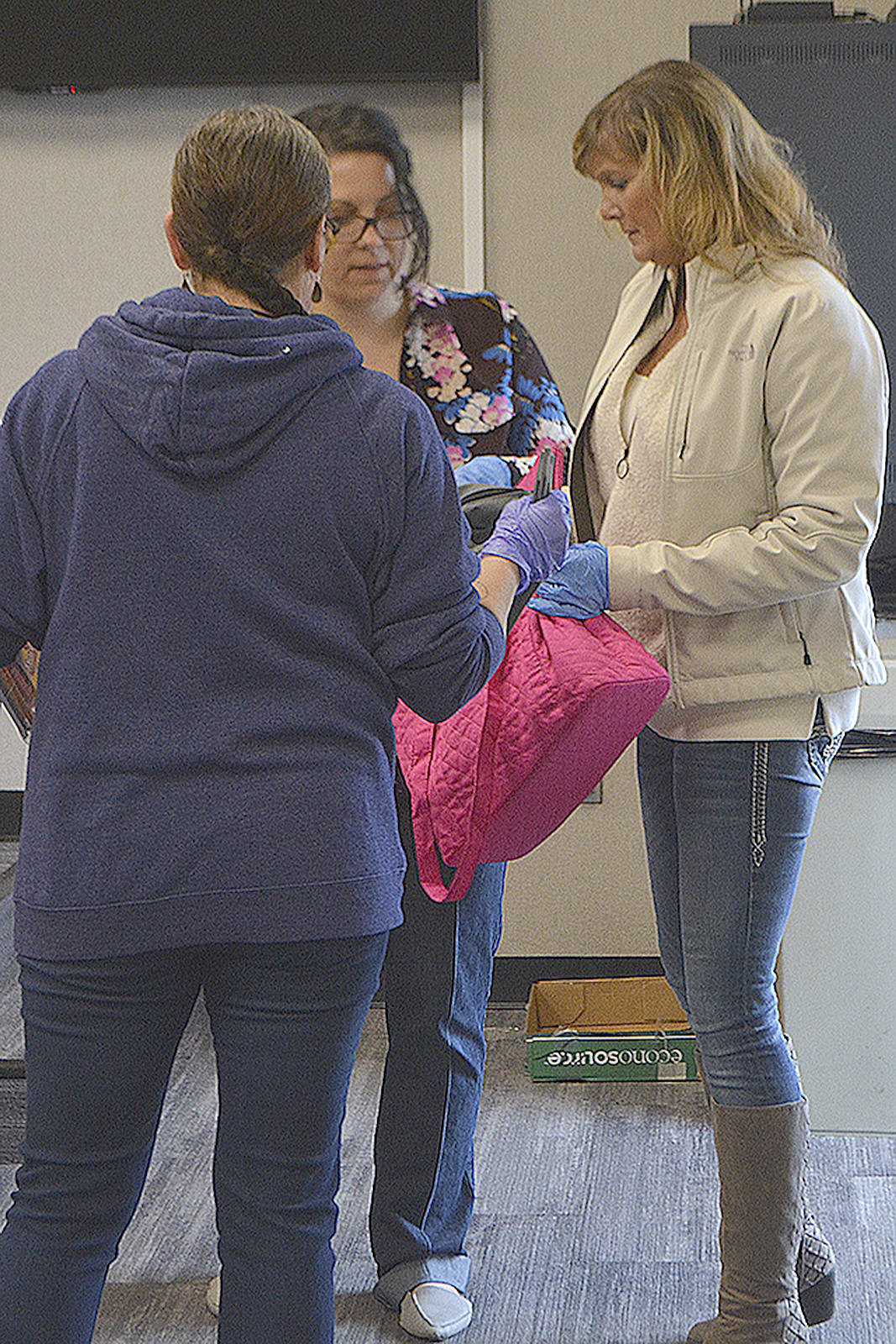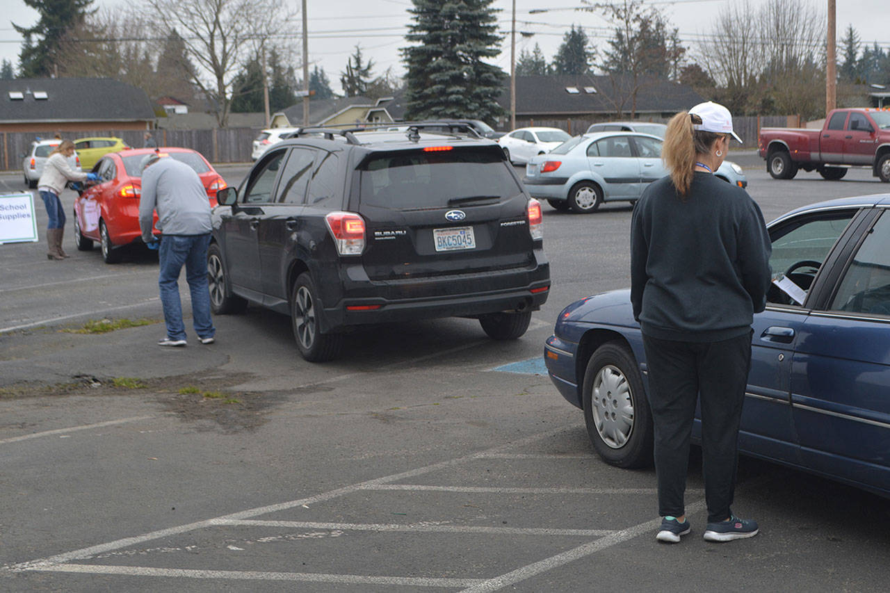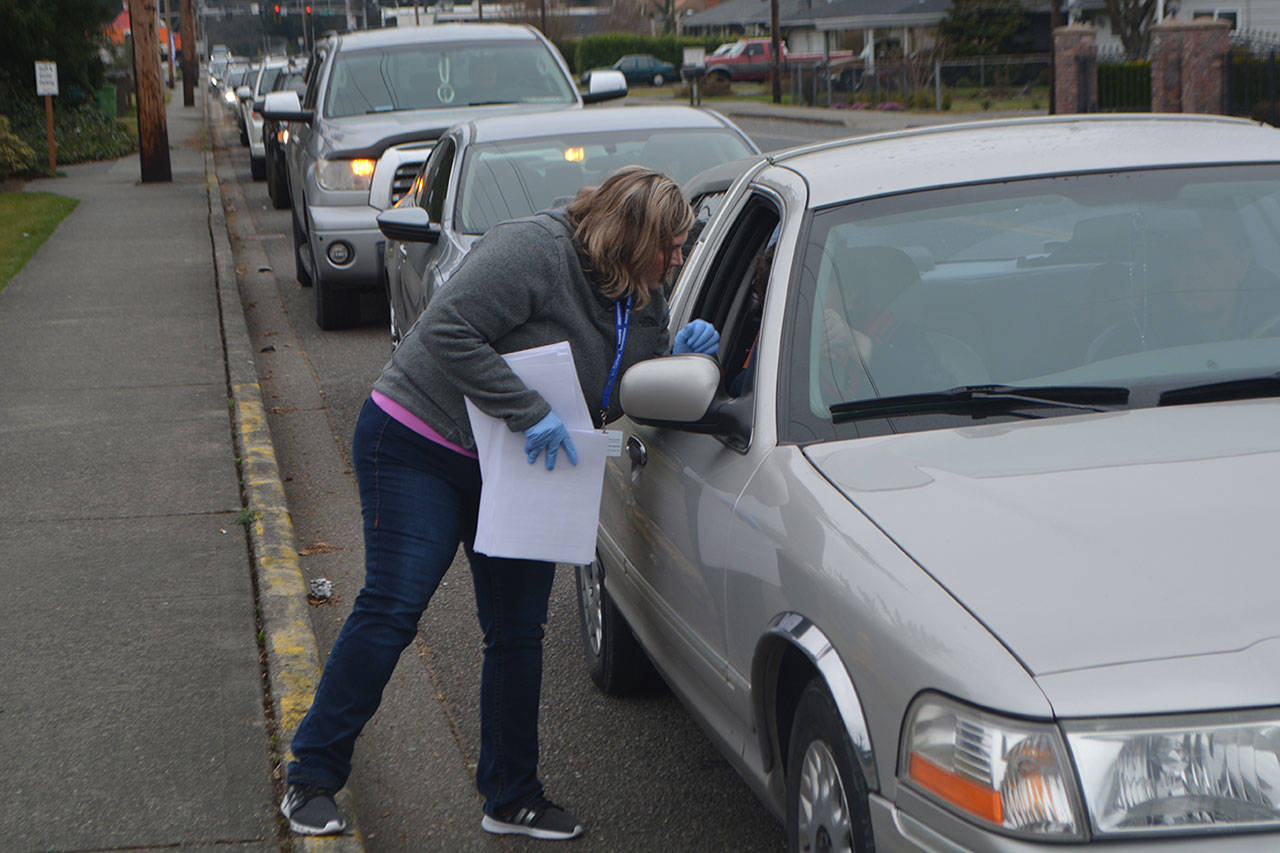 Some families were there an hour early, Brynn Marcum said, adding, “Parents were eager for it.” Hard copies of materials were available, too, along with the Chromebooks for online. Future materials will be handed out at bus stops, where food also is being delivered.