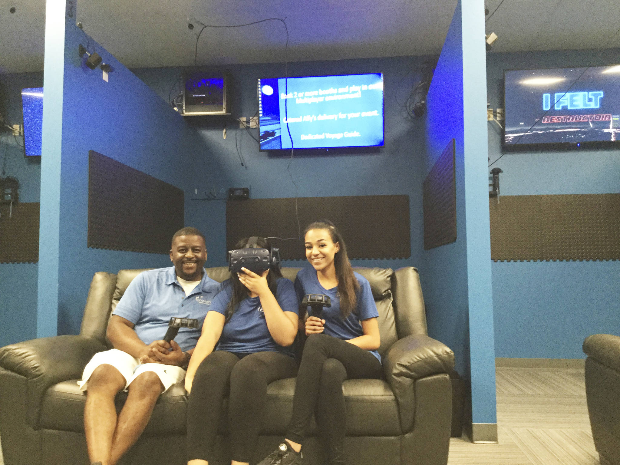 Through use of the latest VR headsets and controller technology, visitors can reserve one of eight “living rooms” for up to four players for a half hour or hour at a time. Because many customers are first-timers in the VR world since the arcade opened July 21, the first 10 minutes are free, Holley said.