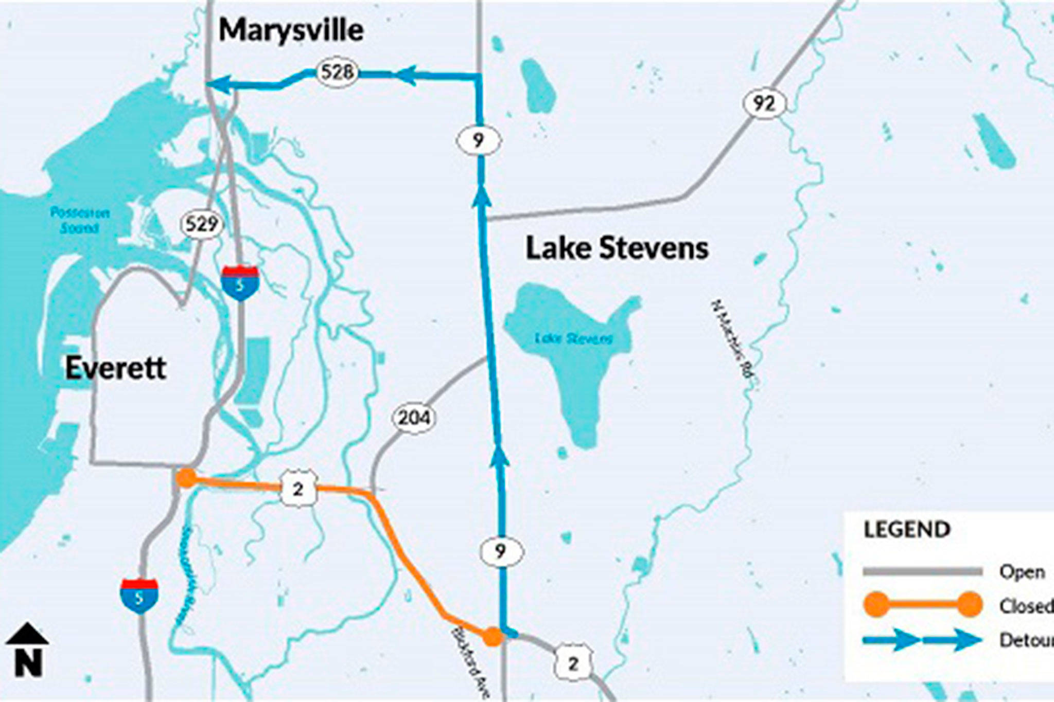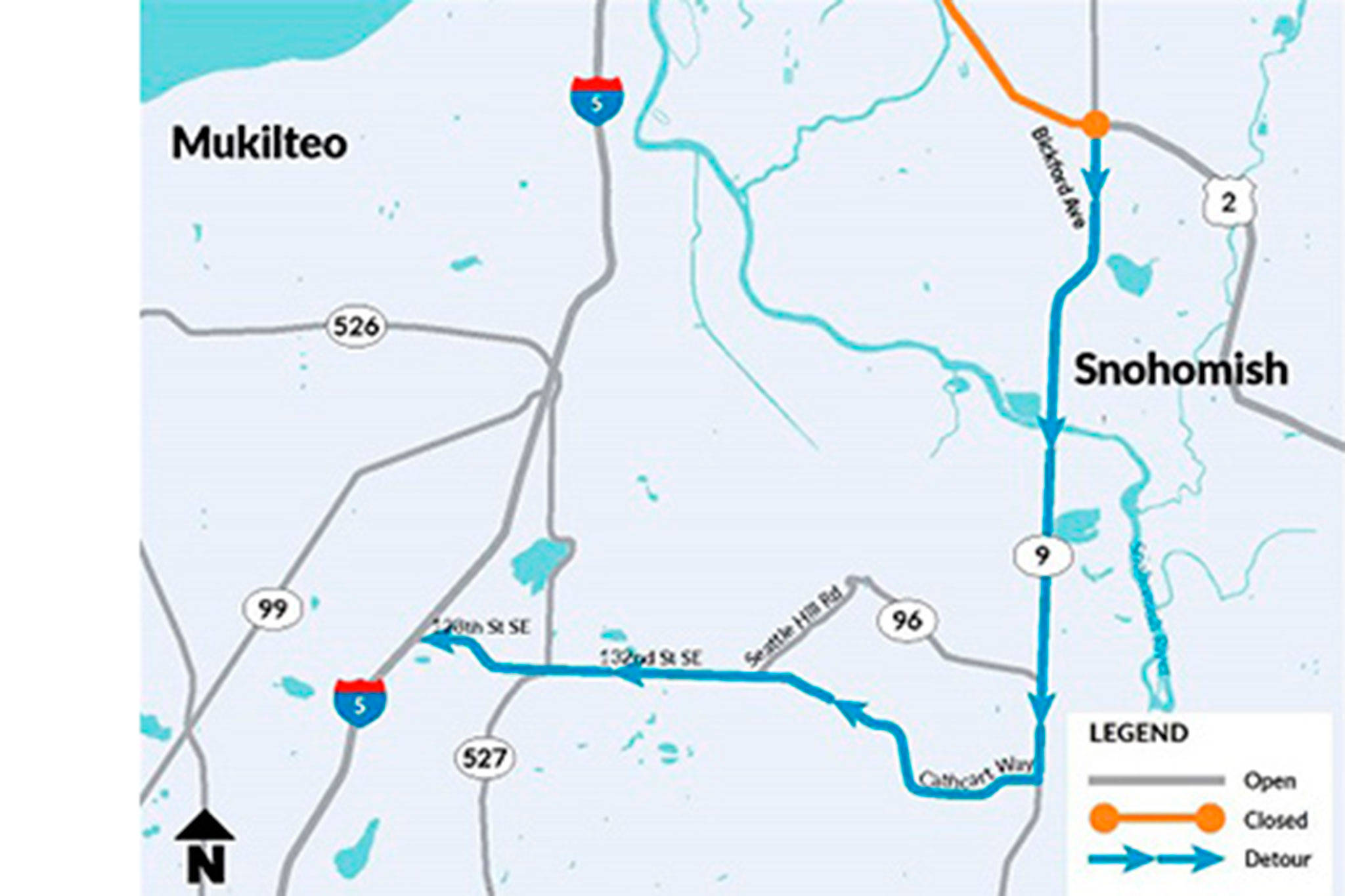 Crews will repave the west end of the trestle between Homeacres Road and I-5. Travelers must detour onto Highway 9 with options to go northbound on a 10-mile route to Highway 528 in Marysville or southbound on a 12-mile route to Cathcart Way and Highway 96 in Mill Creek.