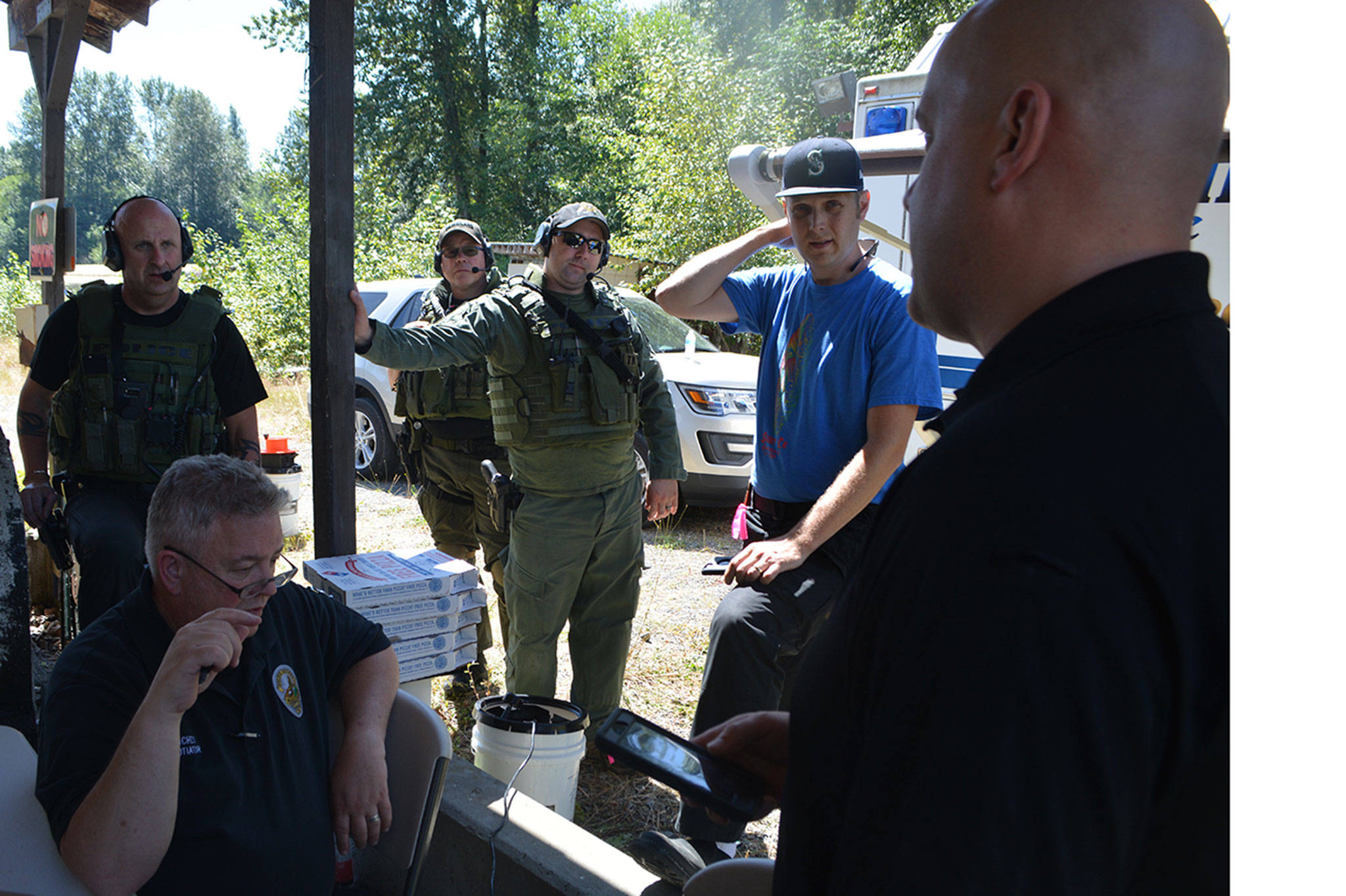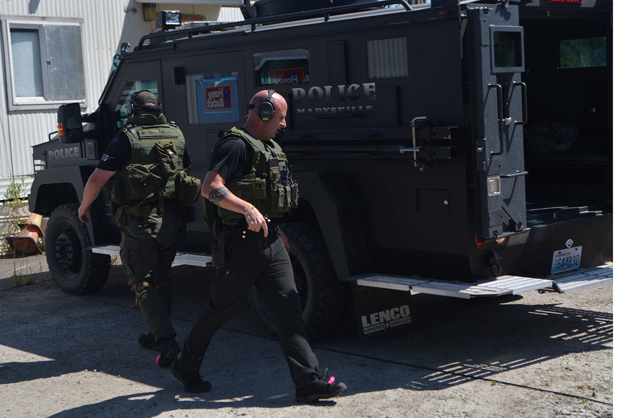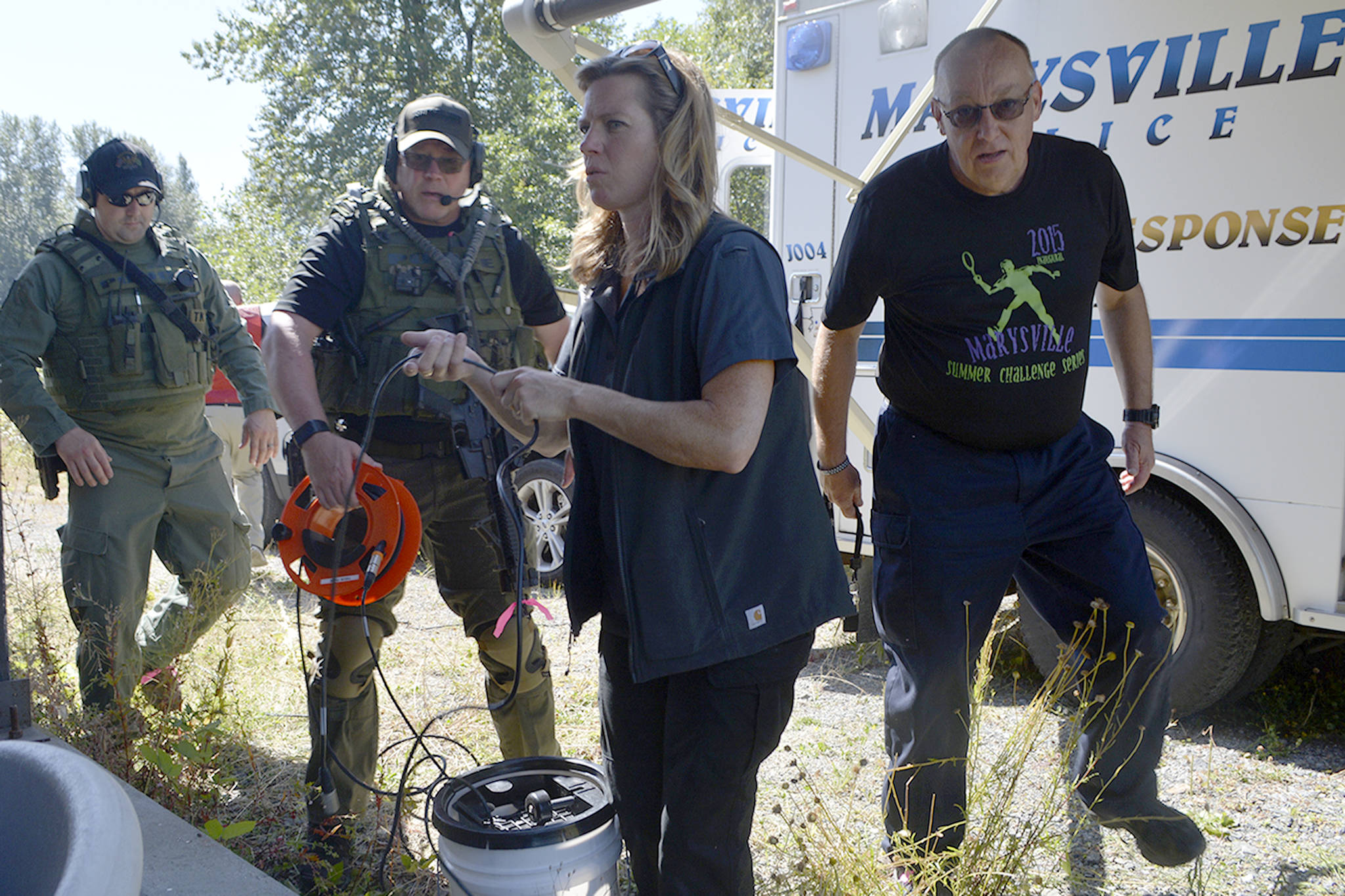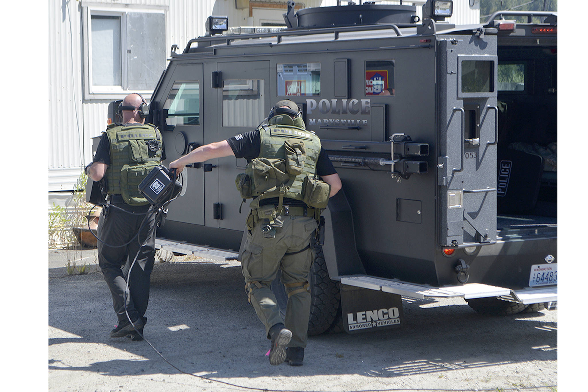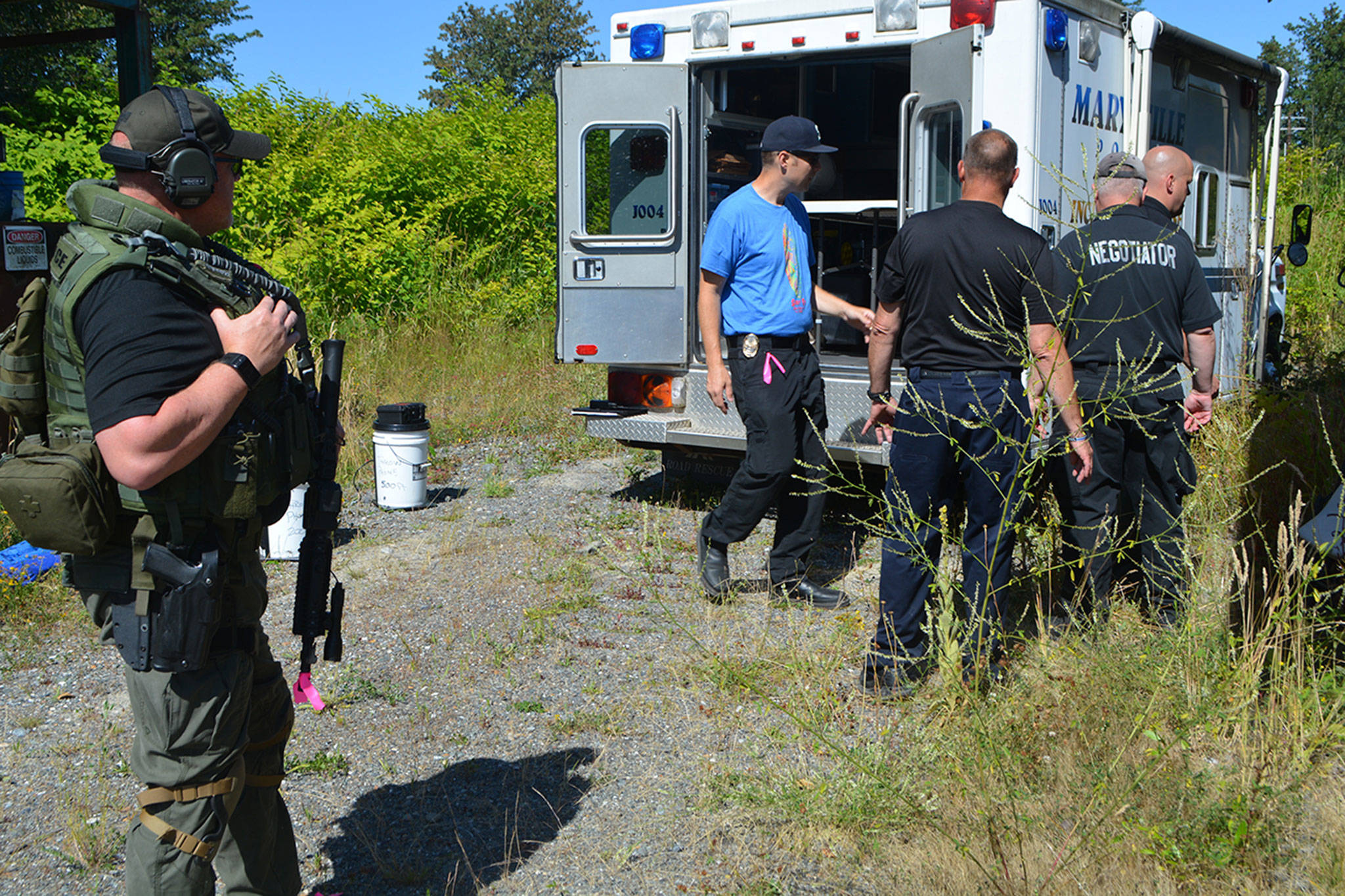 The Marysville Police Department’s Crisis Negotiation and SWAT teams spent hours in the hot sun Monday playing that game.