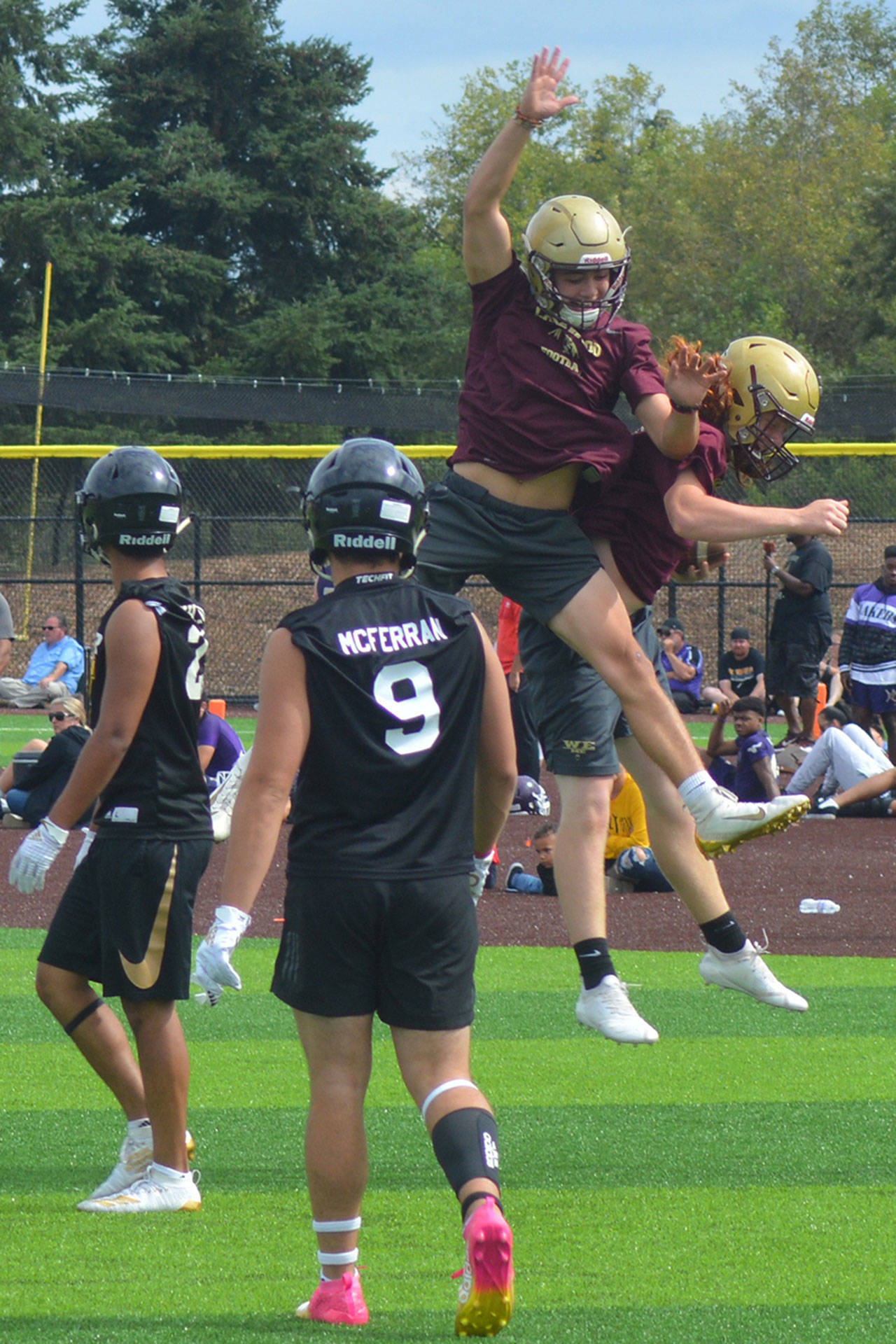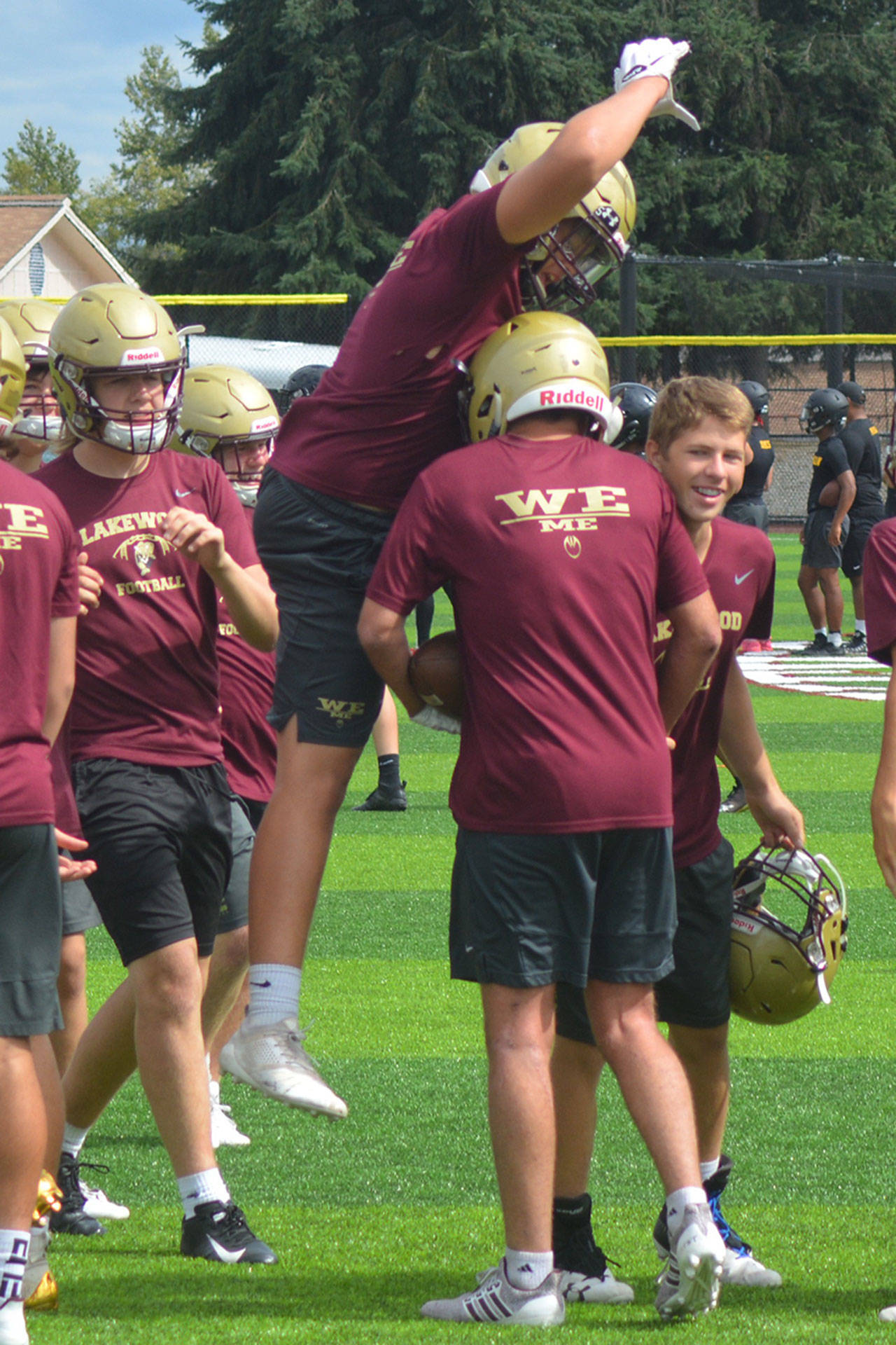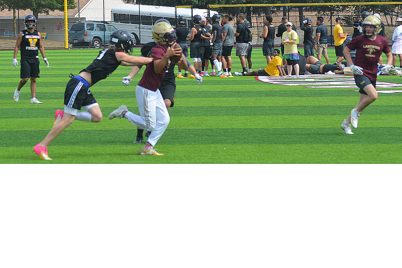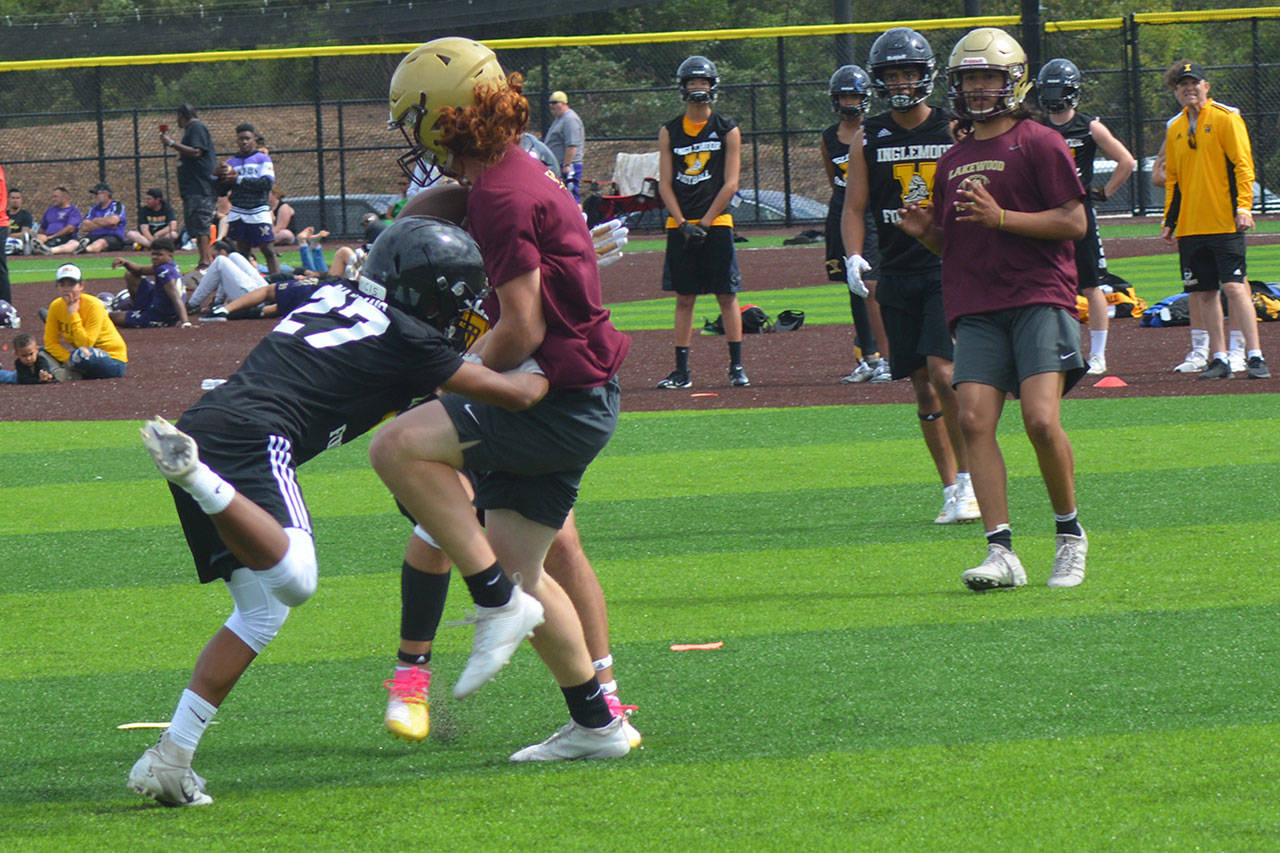 Games consisted of two 17-minute running-clock halves with the ball placed on the 40-yard line each possession. Players were ruled down by one-hand touch, and quarterbacks had four alligators to throw the ball. Lineman also got to compete at the event – five players in the bench press; two-man sled push and pull; five-man tire flip relay; six-man sled drive; five-man tug of war; and 4 by 100 meter relay. North Creek won the lineman challenge, but Lakewood was fourth, winning the tire flip contest. “That’s probably what we’re most proud of,” Teeter said.