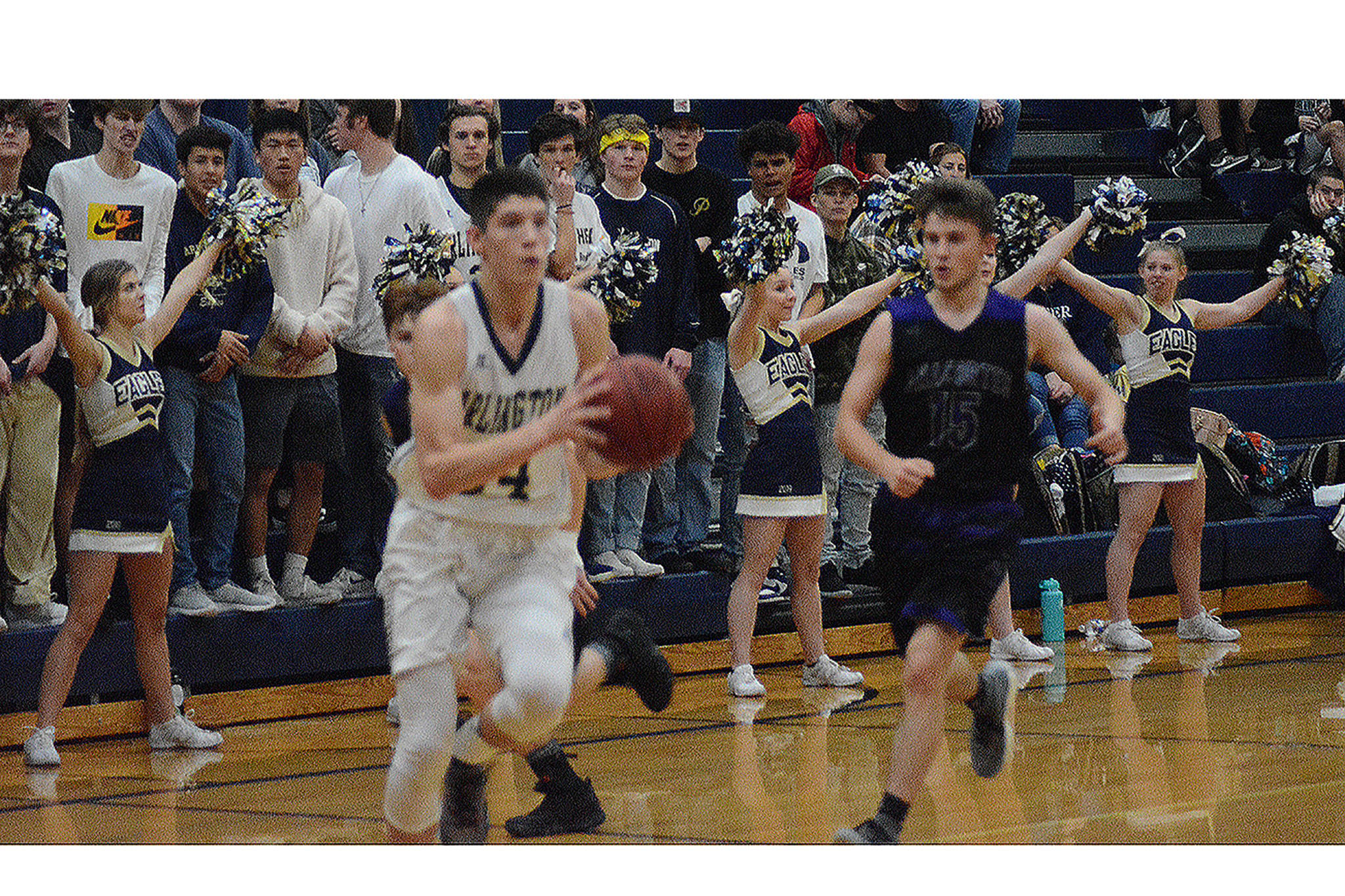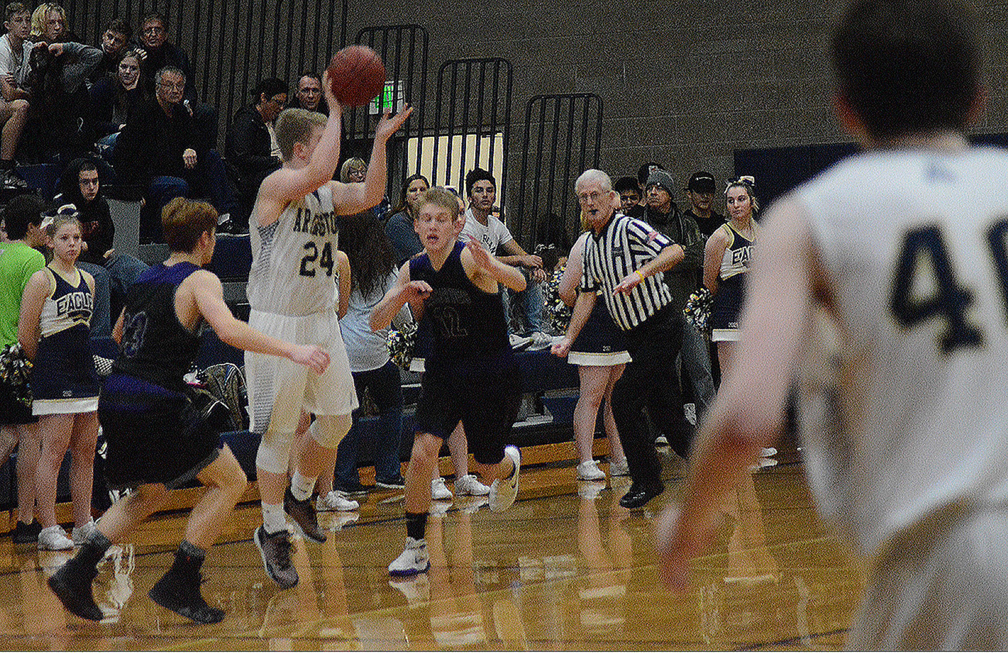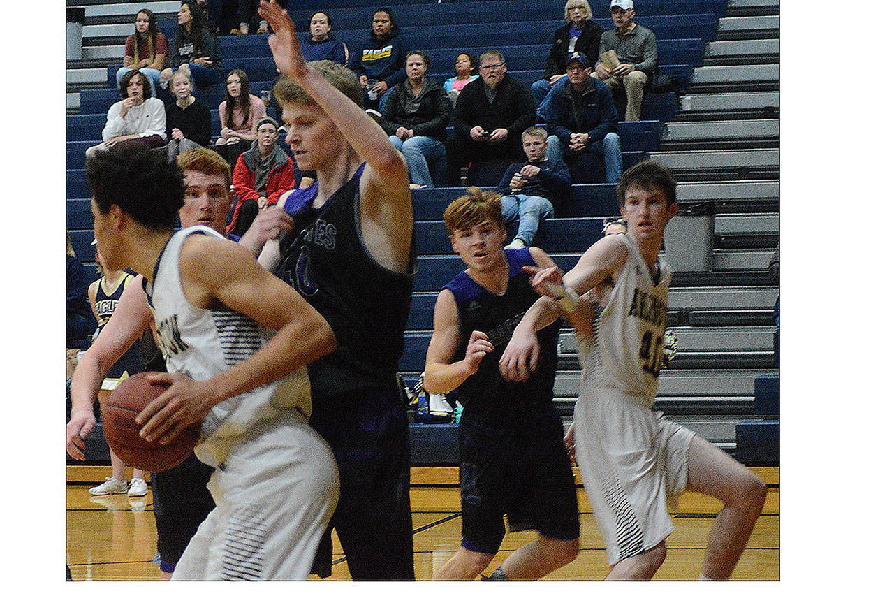 Arlington started the second half off with a bang as Whitis tossed an alley oop pass to Max Smith for two. The Eagles continued to break the Anacortes press, with Whitis getting another assist to Max Smith. Will Abram, the Eagles’ 6-foot-8 junior center, scored twice after grabbing two offensive rebounds as Arlington led 47-26 after three.