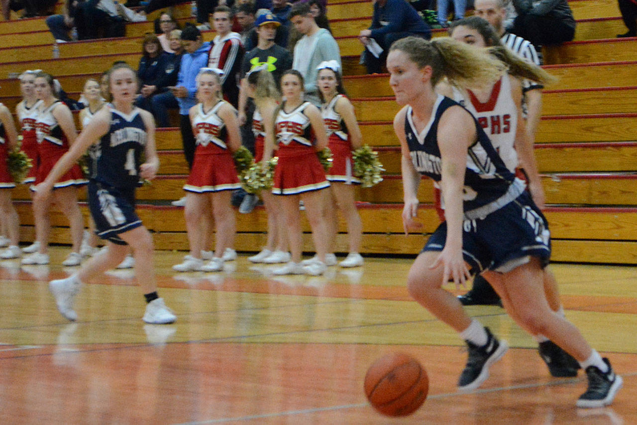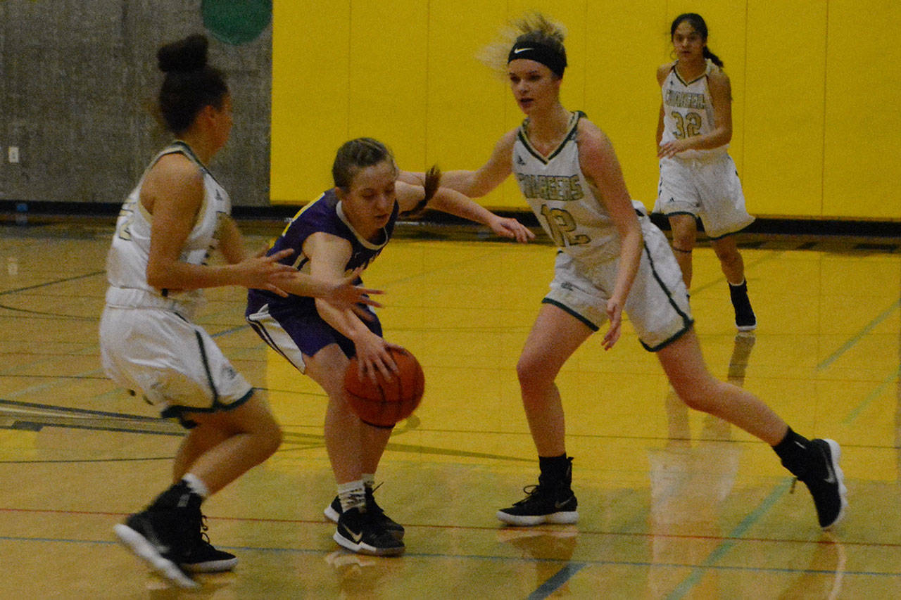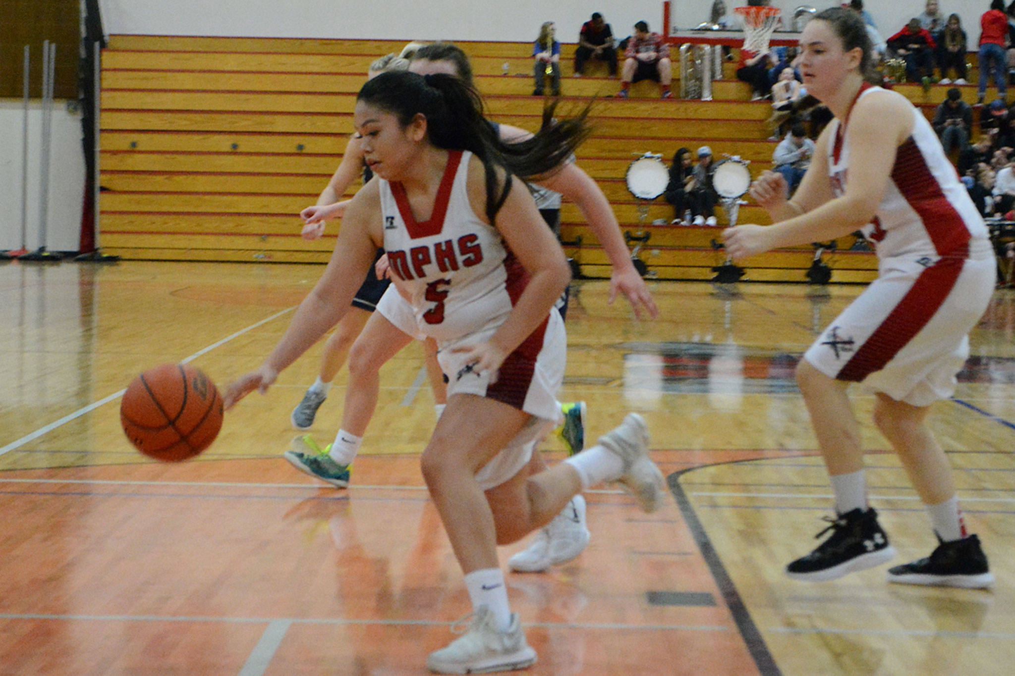 A sweet pass from sophomore guard Kortney Crane to Abby Pfeil put MG up 20-4. A drive by junior Kiki Green, a three-point play by sophomore Brionna Palm and an outside shot by Sydney Norton helped the home team outscore Oak Harbor 22-10, on the way to the rout.