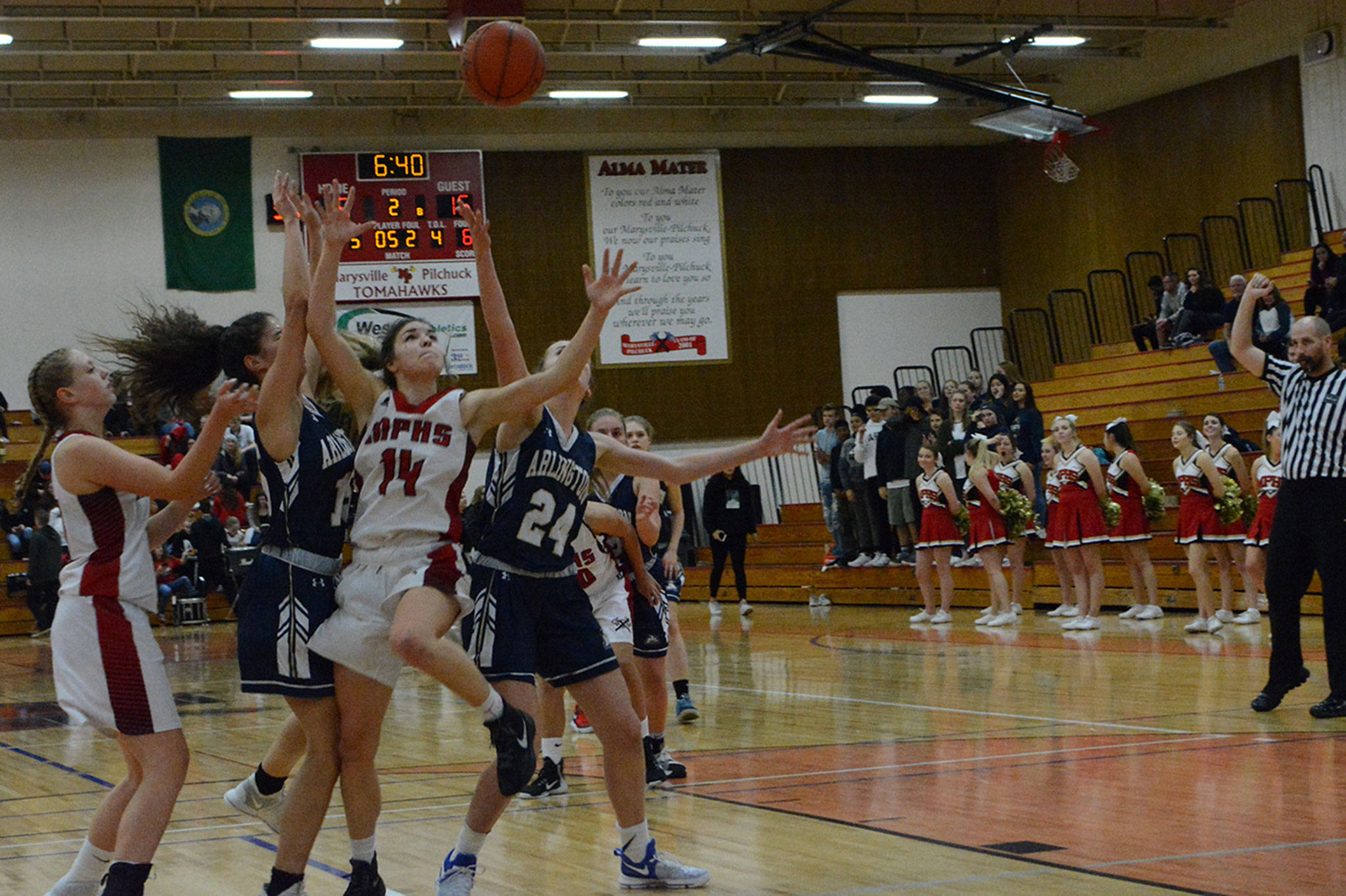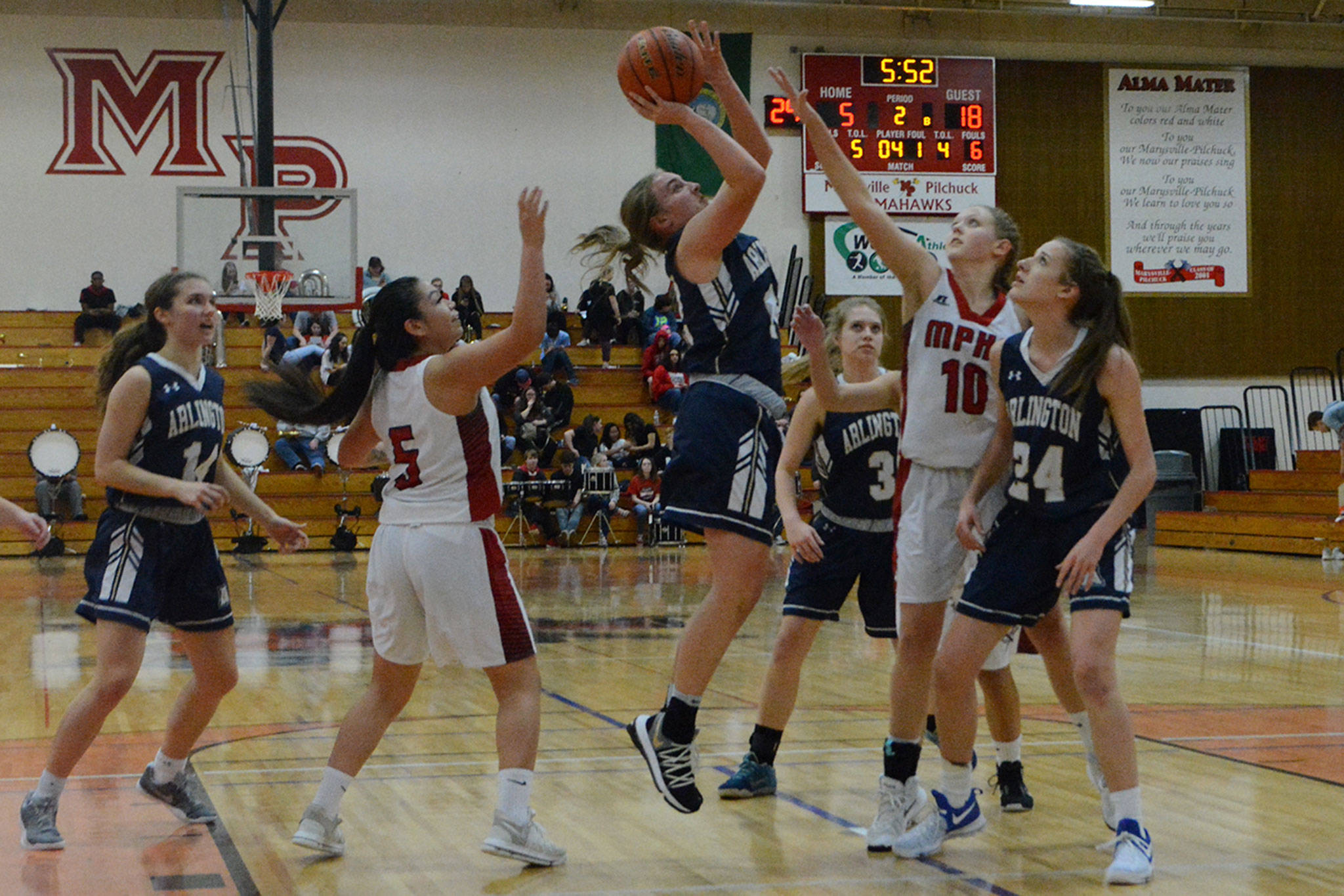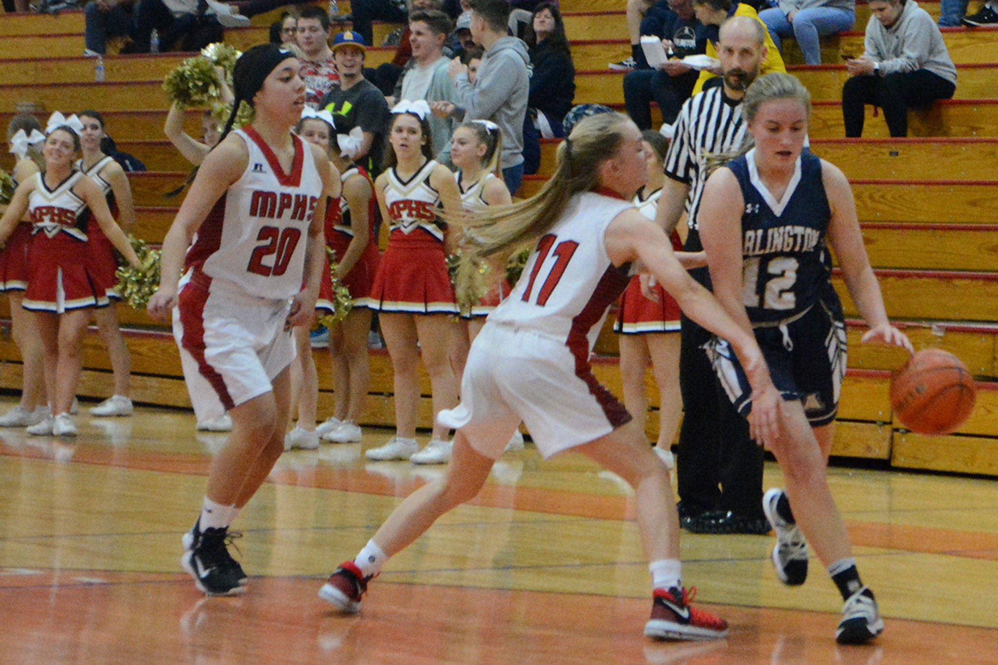 Arlington’s scrappy defense harassed M-P the entire game. In the second period, Hiatt scored after grabbing an offensive rebound and hit two free throws, Scheppele hit another 3 and Mellick stole the ball and went in for a layup to make it 26-5, and the game was basically over after 1 1/2 quarters.