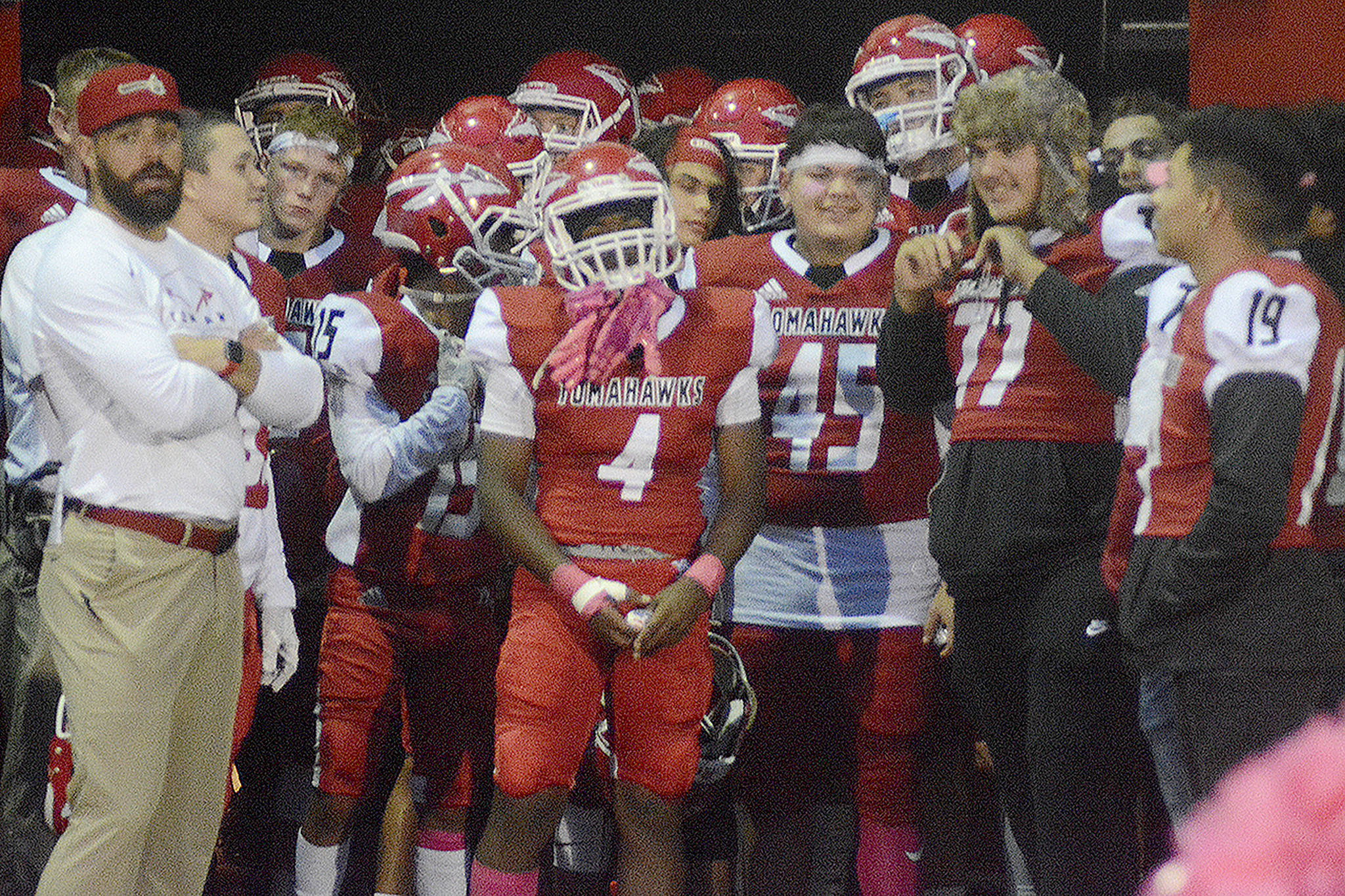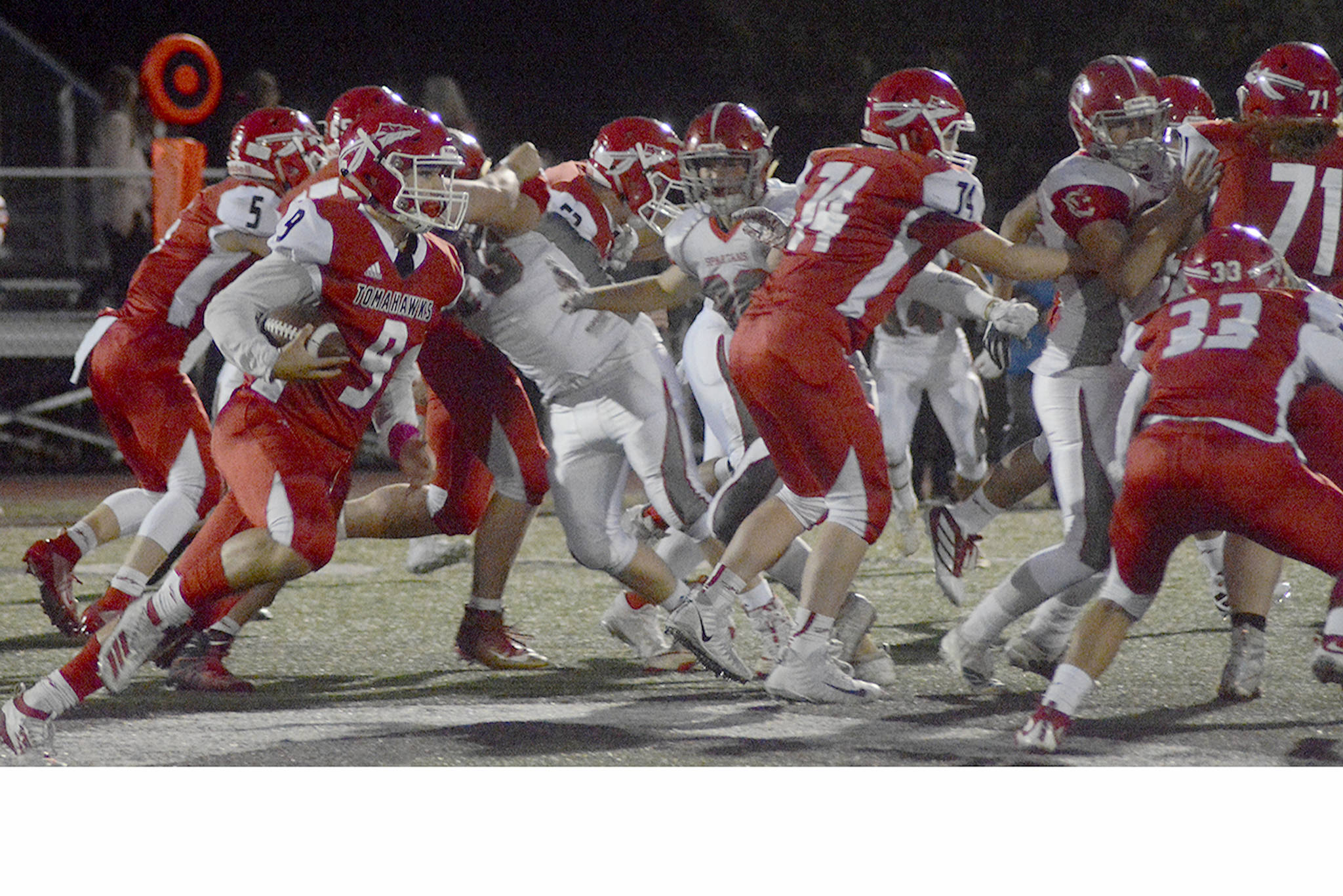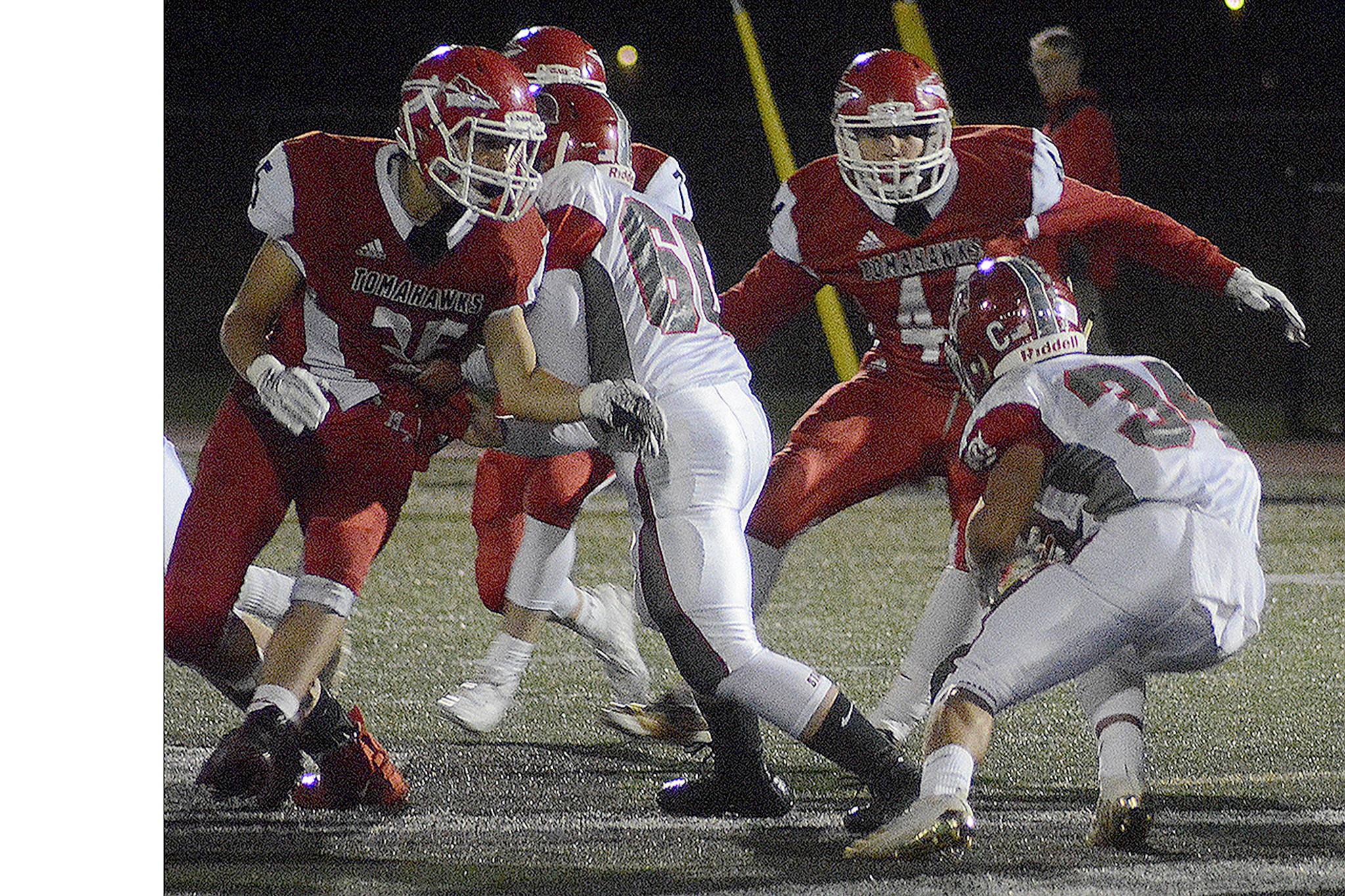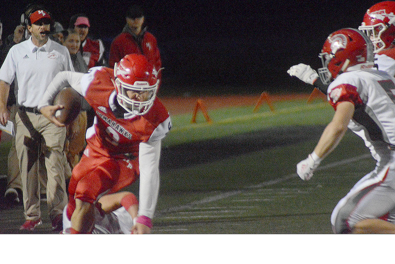 M-P again scored quickly when QB Jake Elwood connected with Dillon Kuk on a 40-yard pass play. Running back Jordan Justice added a 10-yard run as the Tomahawks led 16-0 at the end of the first quarter and coasted to a 56-22 Wesco 3A North win.