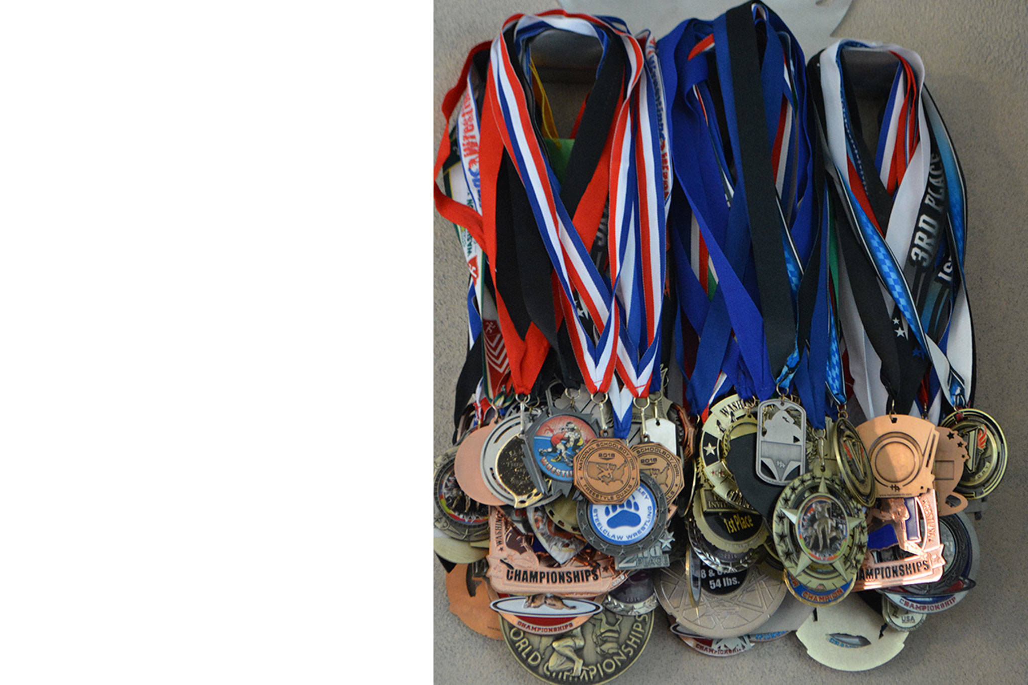 In the yard is a pull-up bar. In the living room, hanging on a wall, are dozens of medals won by the boys. In another part of the house is an impressive collection of trophies.