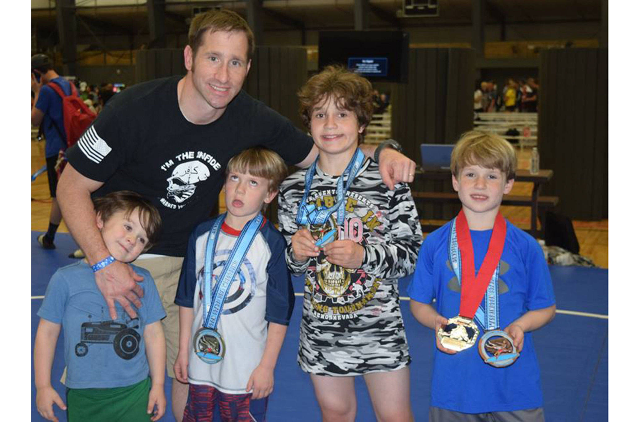 Dustin started wrestling when he was just a couple years old. He later would wrestle his younger brother David. But David died in an accident when he was 3. Dustin gave up wrestling for a while. “Without Dave it wasn’t fun anymore,” Baxter said. But when he was 7, Dustin decided to take it up again. He has been excelling ever since. He won state this year at 83 pounds, and made the Schoolboy Team Washington squad that competed in nationals at Indianapolis.