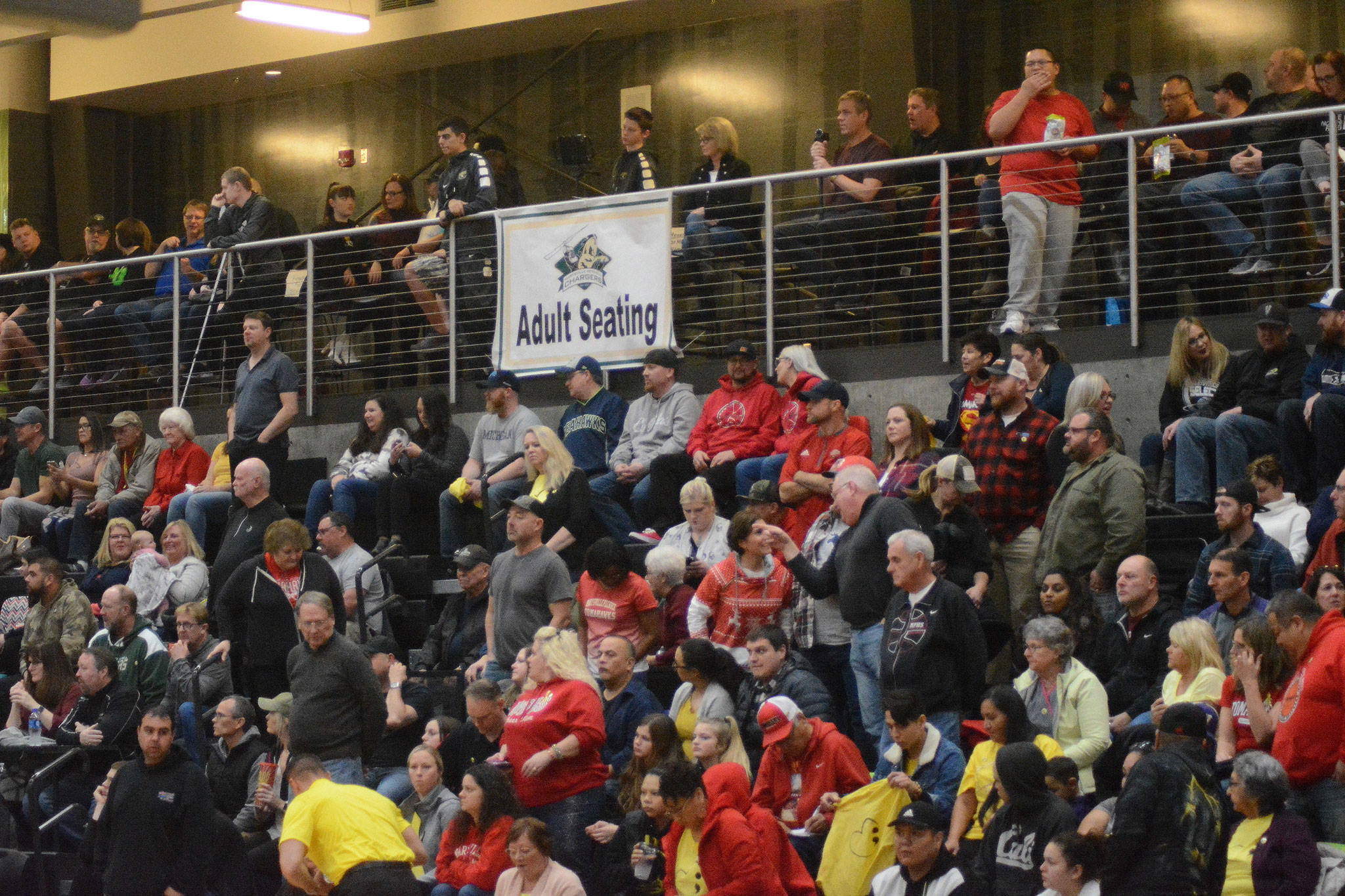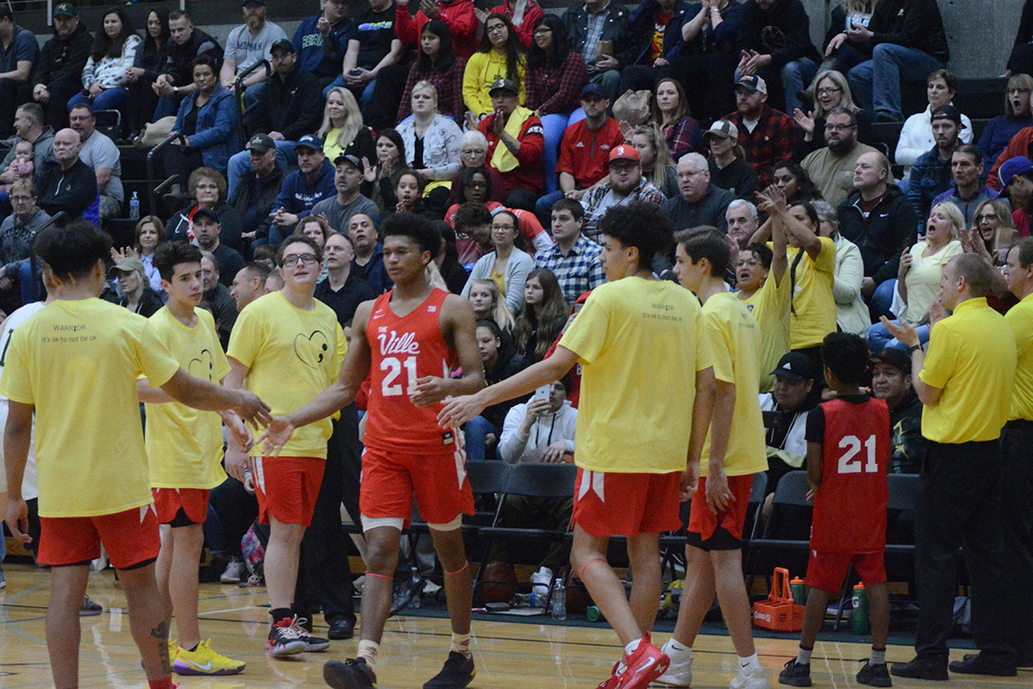 The stands and the balconies were packed with Marysville fans, about half supporting home team Marysville Getchell and the other half supporting crosstown rival Marysville-Pilchuck. Even the entrances were standing-room only. Marysville police were there for crowd control. The schools’ resource officers bought yellow t-shirts for players and students in honor of suicide awareness.