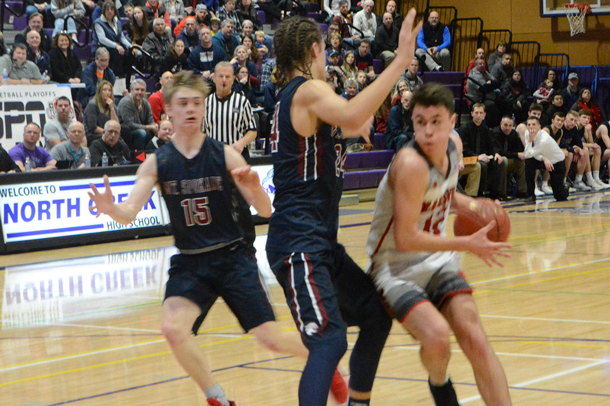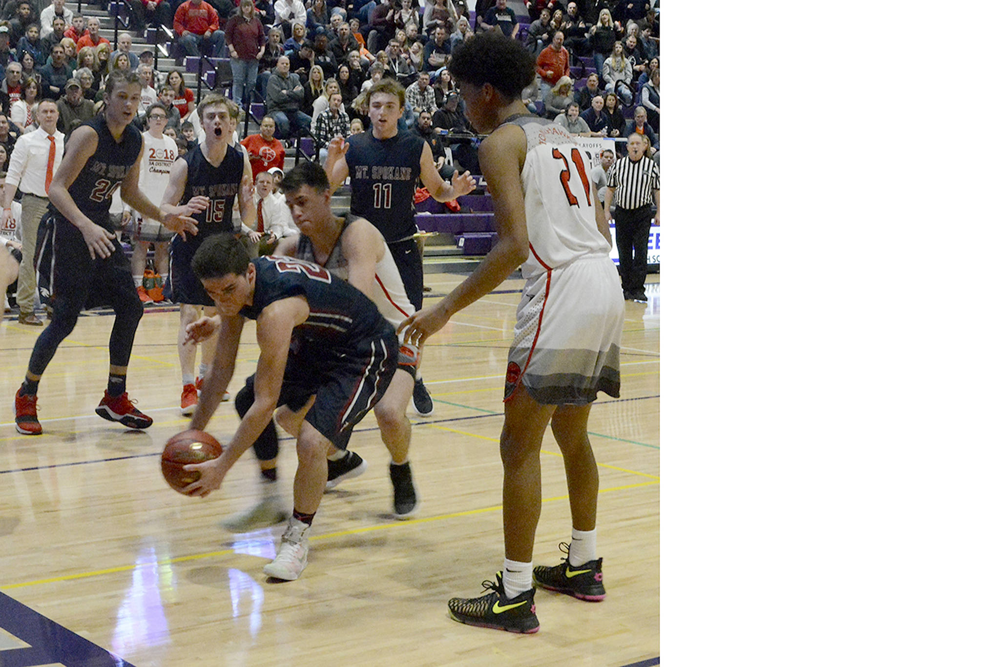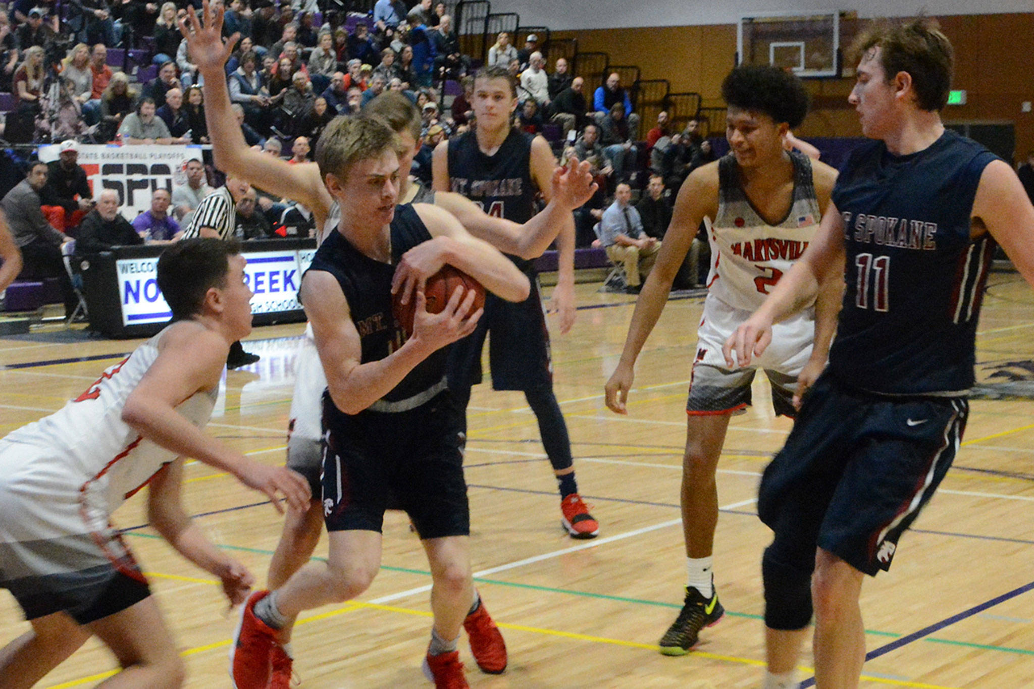 RaeQuan Battle, M-P’s standout 6-5 junior guard, sank a 3, but that’s all M-P could score. Another huge play came when Wildcat Hattenburg missed two more free throws, but got his own rebound as Mount Spokane retained possession.