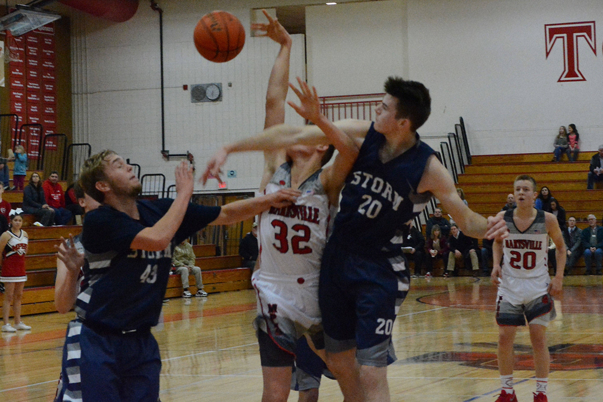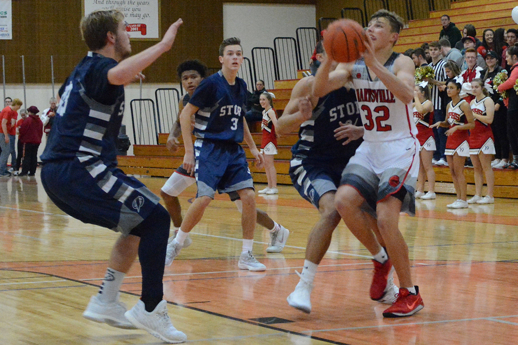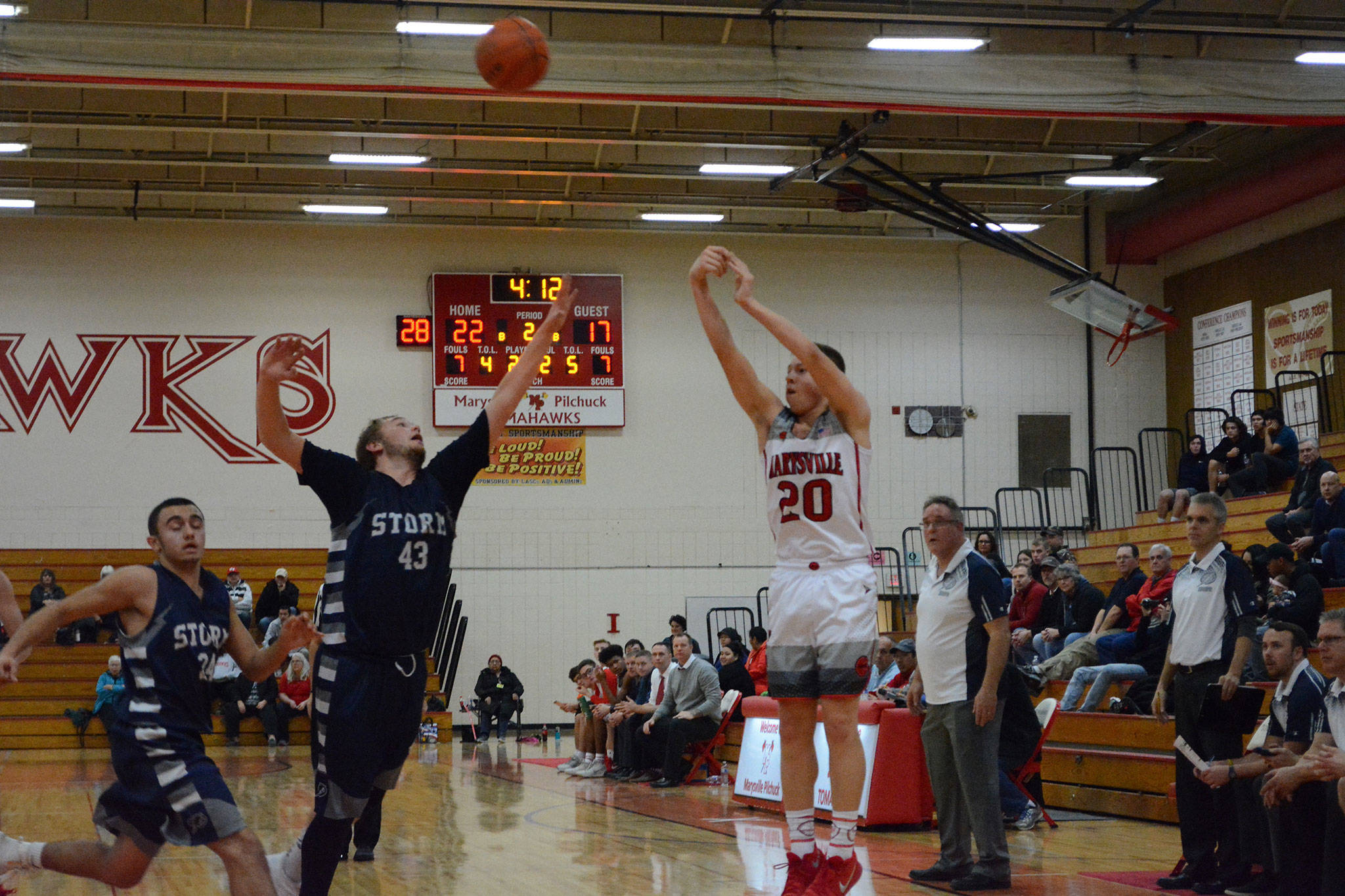 The Storm continued to struggle scoring against M-P’s scrappy defense, and after three-pointers by Dobler and Bauman the home team had its biggest lead of the evening at 52-34.