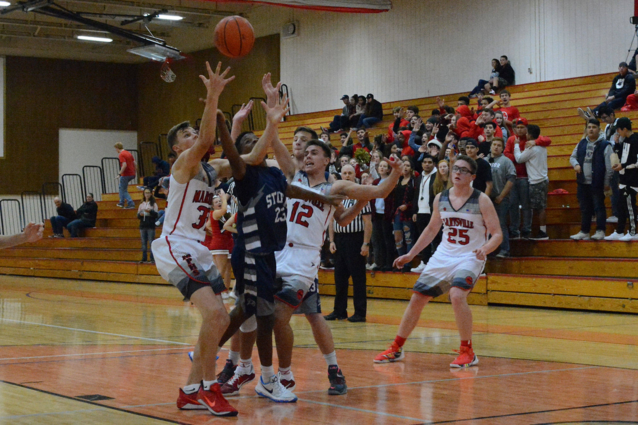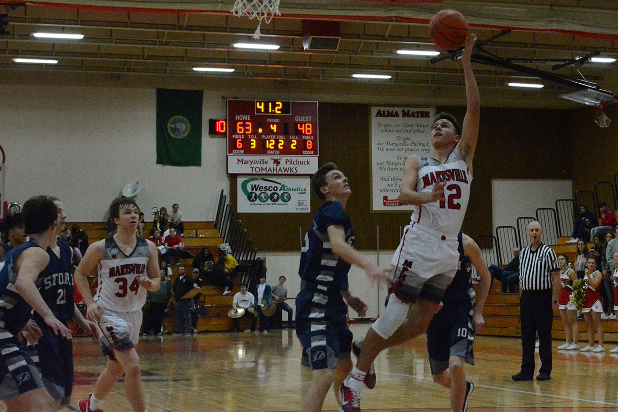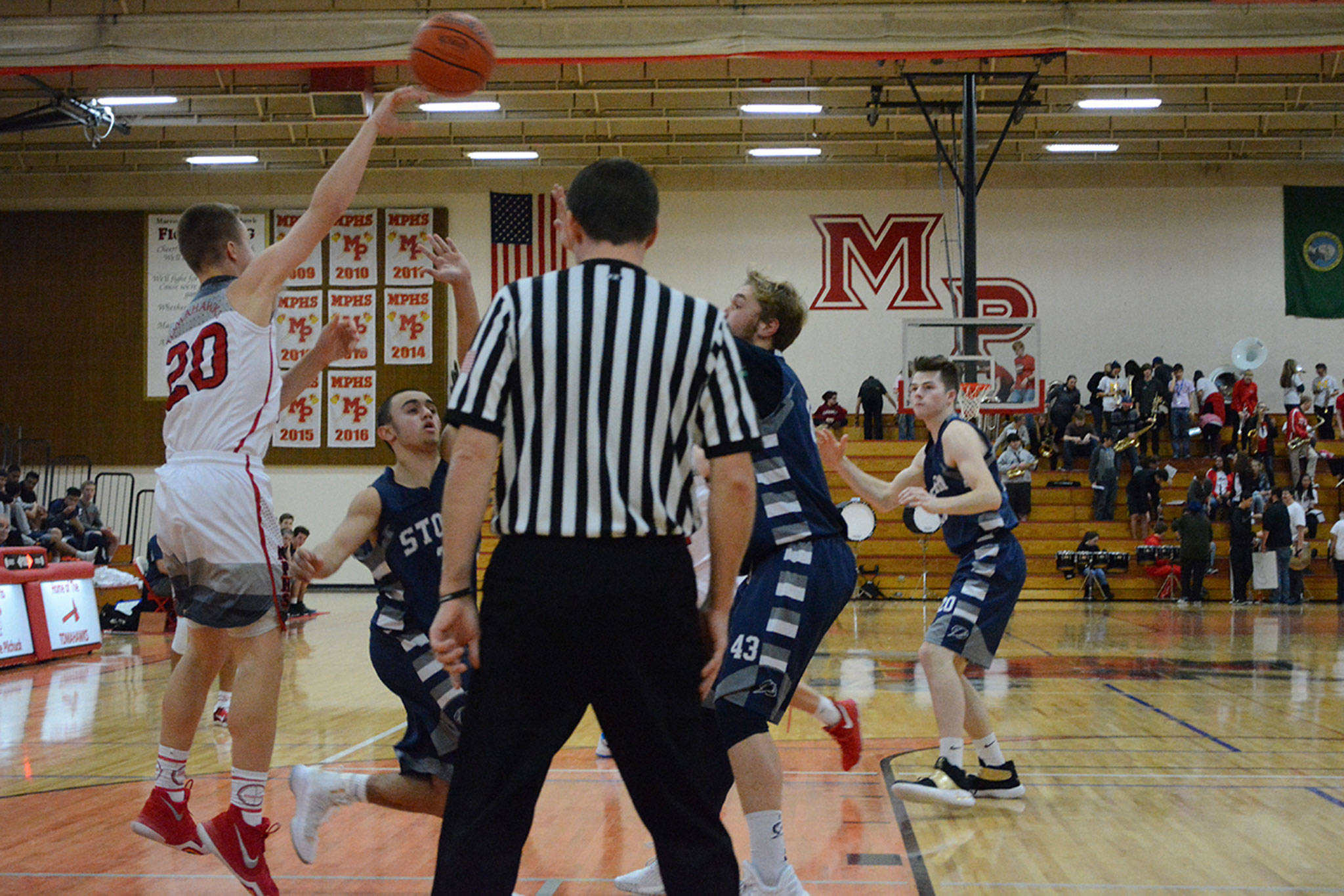 Josiah Gould stole the ball and passed it to Battle for his third thunderous dunk of the night to make it 41-27 in the middle of the third period. A three-pointer by Bauman put the Tomahawks up 46-30. Squalicum put on a full-court press with 2:29 left in the quarter, to no avail, as M-P led at the buzzer 49-32.
